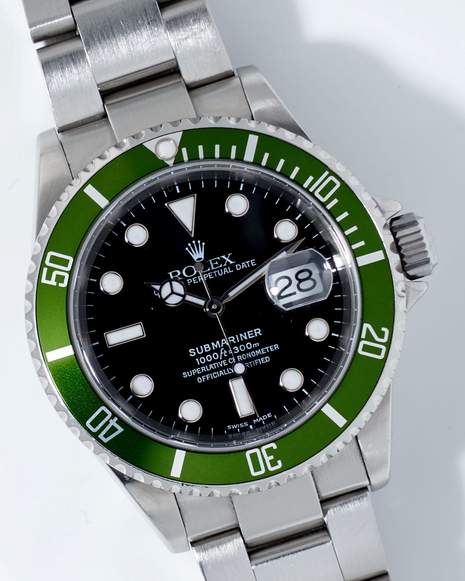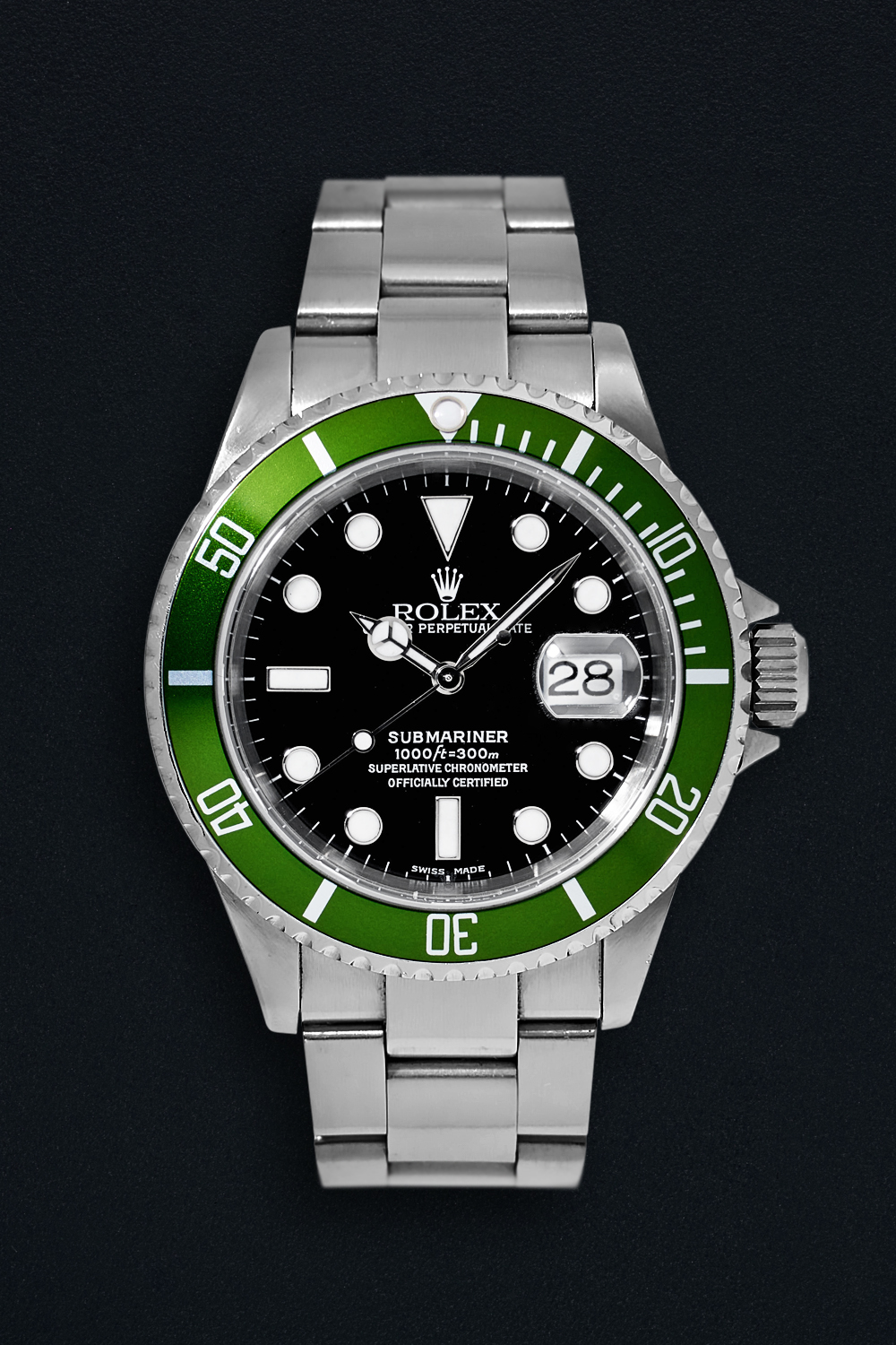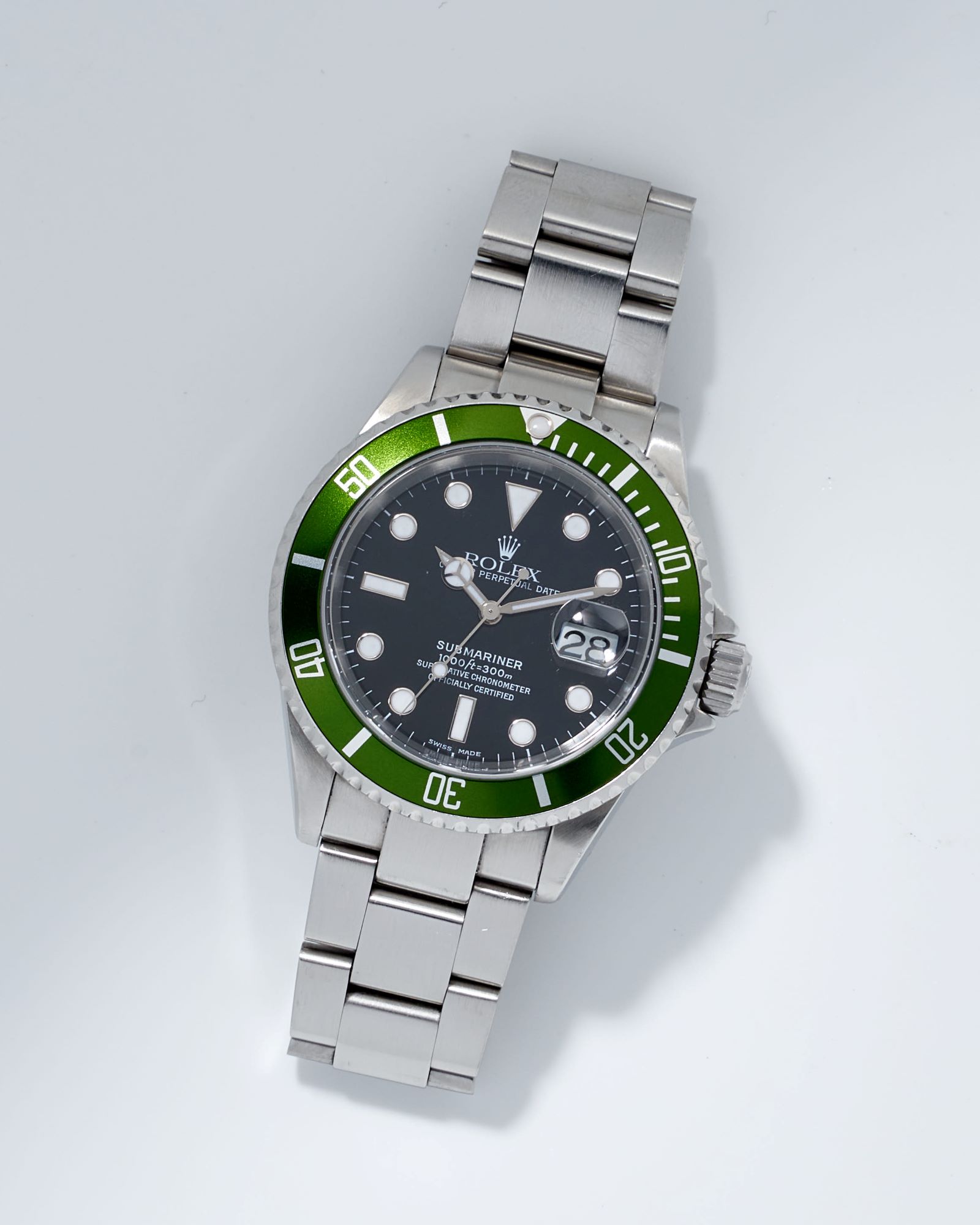 CaseRound case in stainless steel, brushed and polished, screw down Oyster crown at 3 o’clock with embossed Rolex coronet, unidirectional bezel with a green aluminum insert, 60-minute scale and luminous zero marker, screwed solid caseback in stainless steel