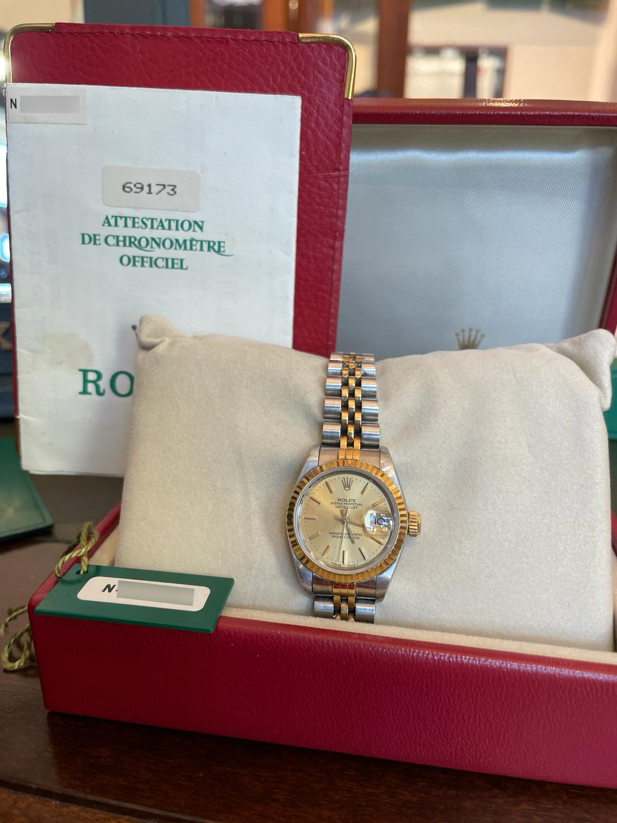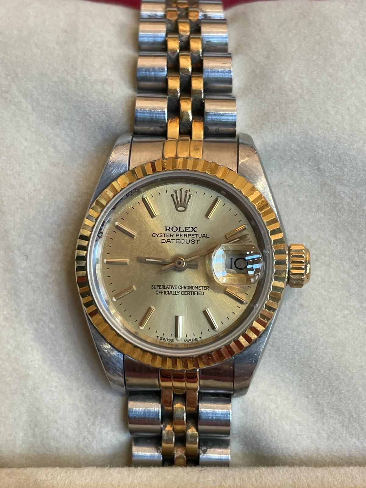 DialSunburst yellow gold colored dial, signed Rolex Oyster Perpetual Datejust, applied Rolex coronet at 12 o’clock in yellow gold, polished, applied stick indexes with tritium luminous dots, polished and facetted baguette hour and minute hands, luminous, sweep seconds hand, date aperture at 3 o’clock under Cyclops lens