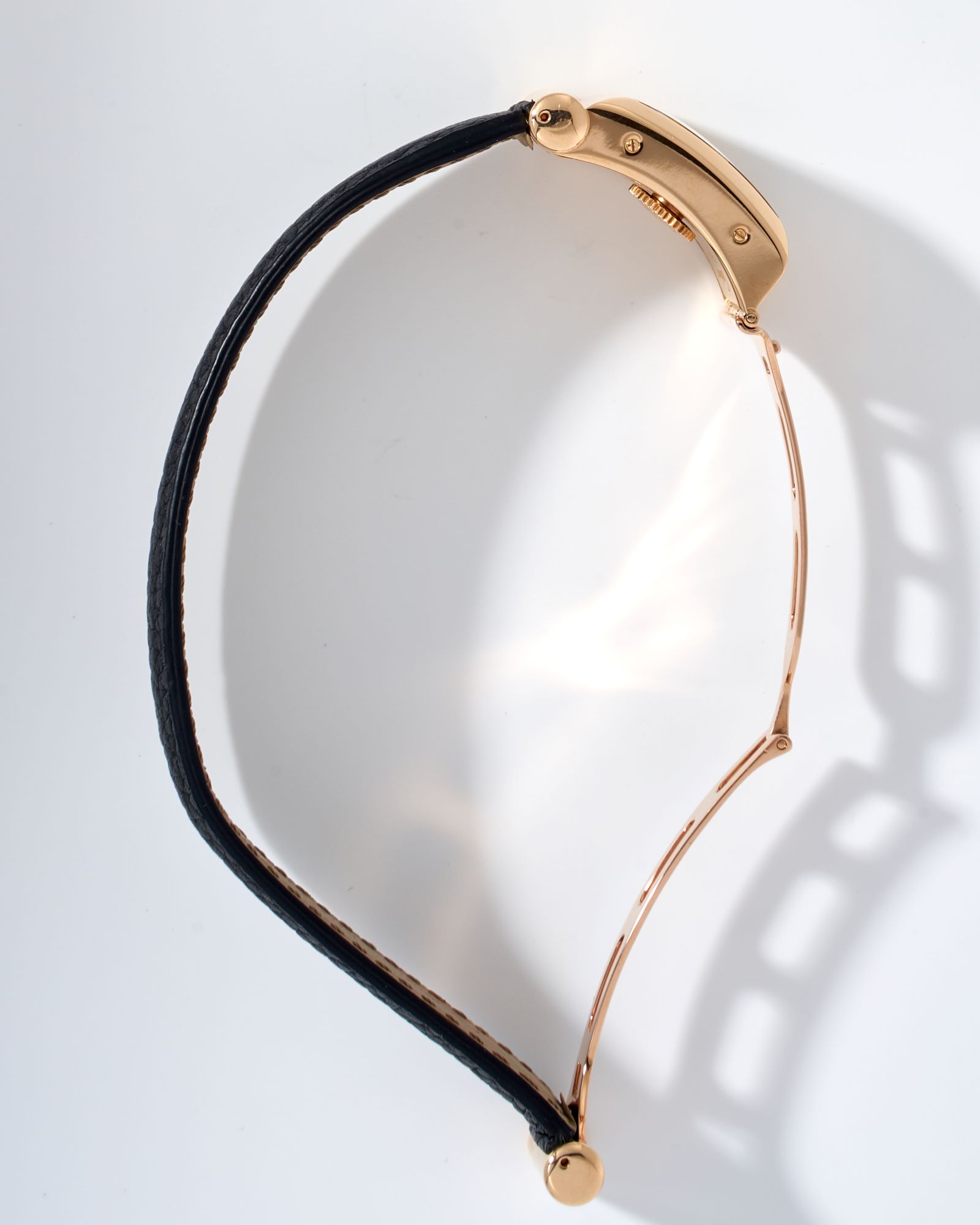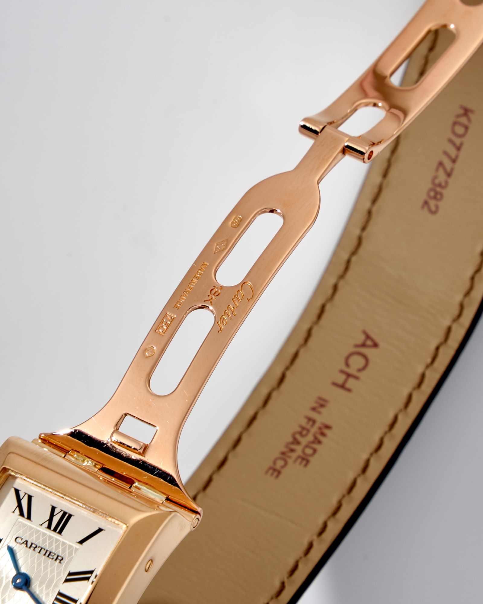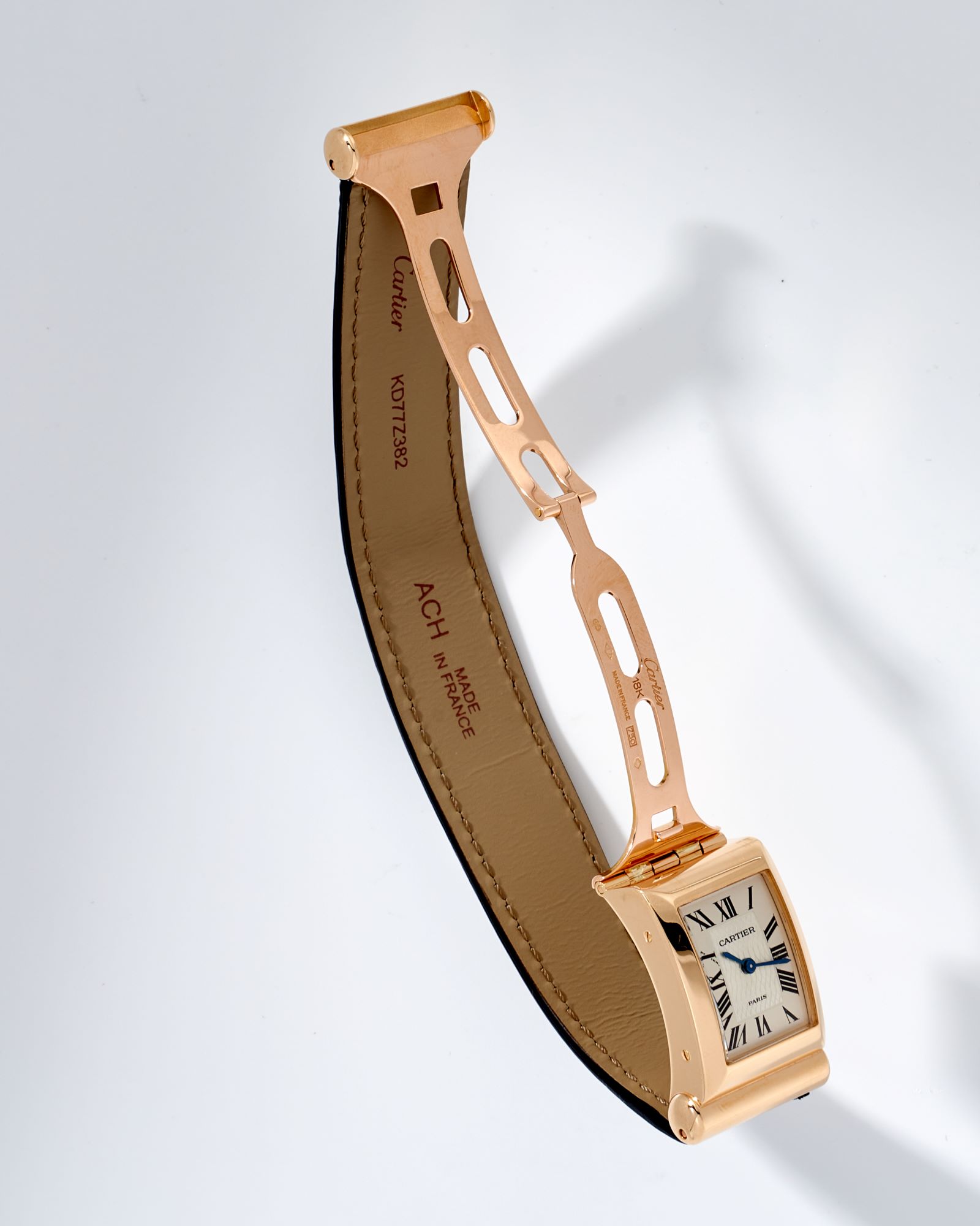 CaseRectangular curved case in 18k yellow gold, polished, fixed bezel in 18k yellow gold, polished, solid gold caseback engraved Cartier Paris LC 1847-1997 and limited-edition number, caseback with flat winding crown, embedded double folding clasp in 18k yellow gold signed Cartier