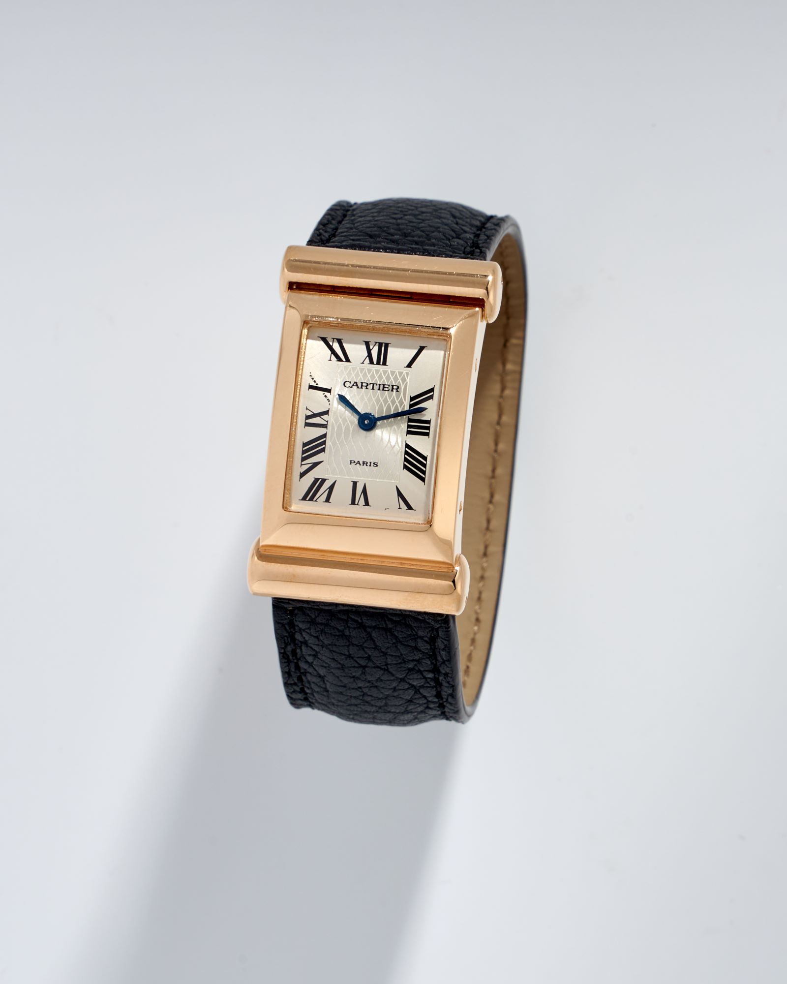 DialSunburst silver-plated dial, signed Cartier Paris, black Roman numerals with ‘secret’ Cartier signature on X, blued ‘sword’ hour and minute hands, central zone with ‘wavy mesh’ guilloche pattern