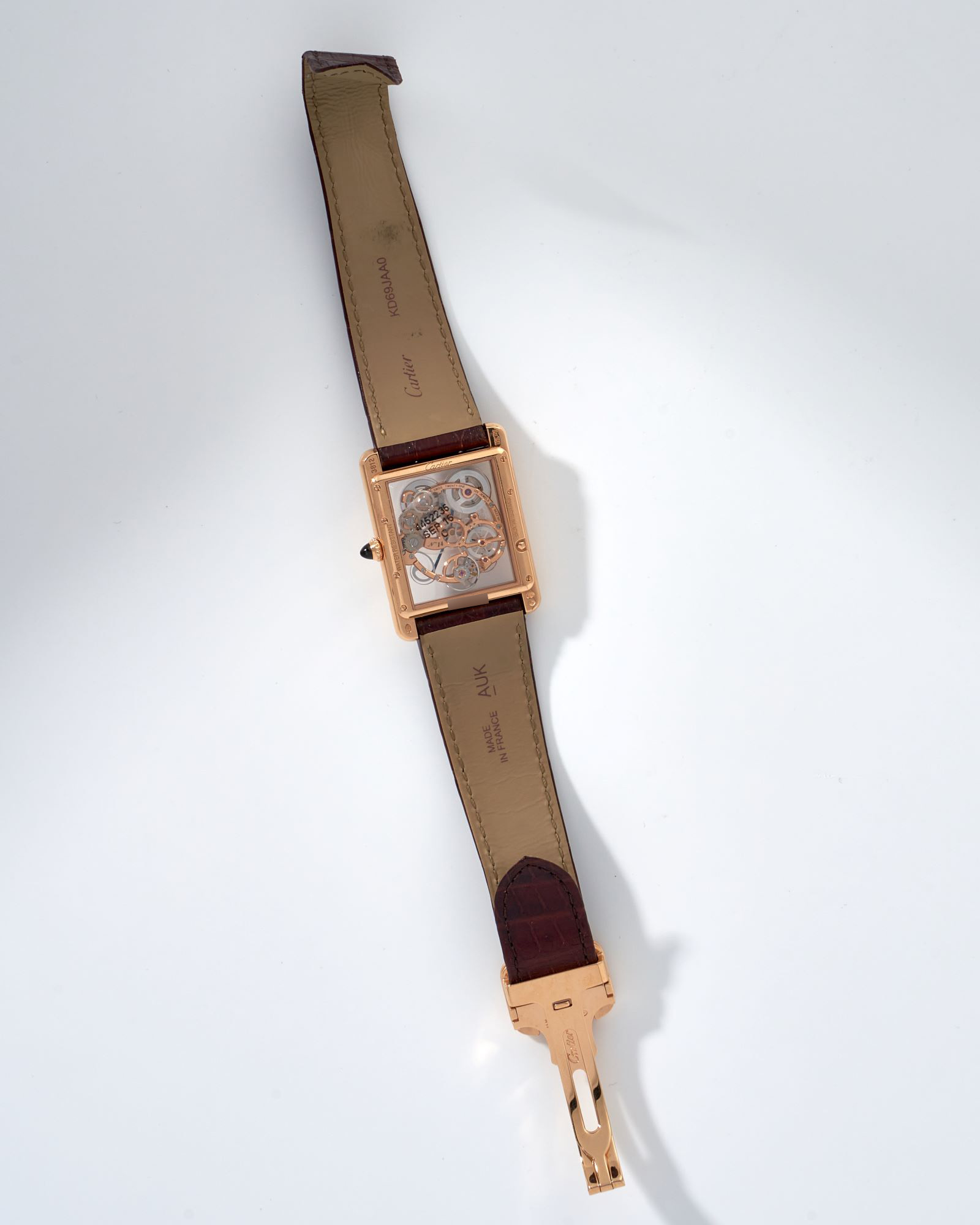 CaseRectangular case in 18k rose gold, polished, fixed bezel in 18k rose gold, polished, exhibition caseback fixed on 8 screws, engraved ‘Cartier’, reference and case numbers, crown with sapphire cabochon at 3 o’clock
