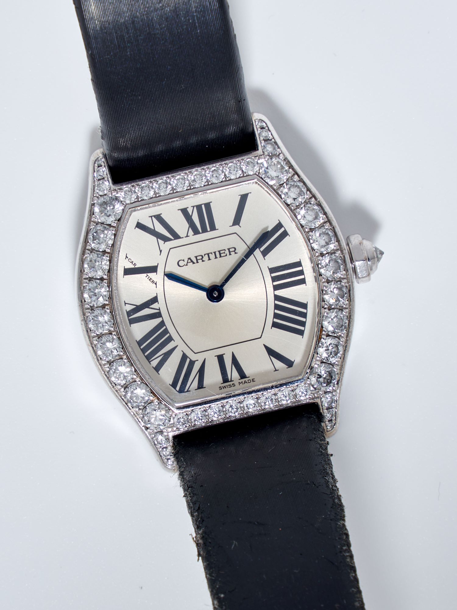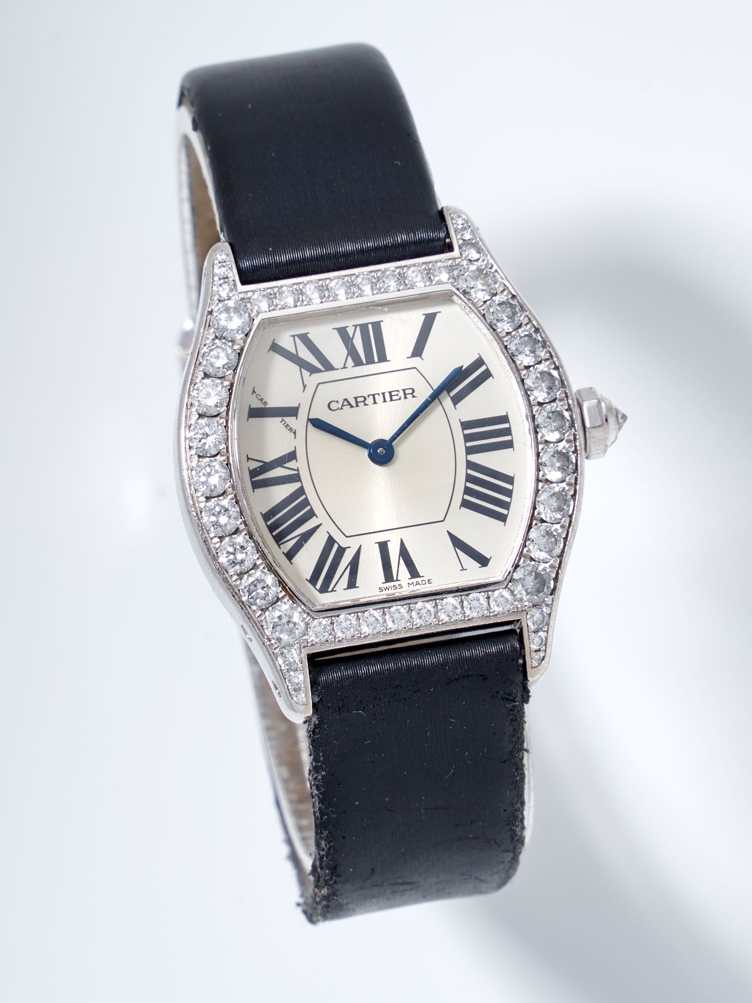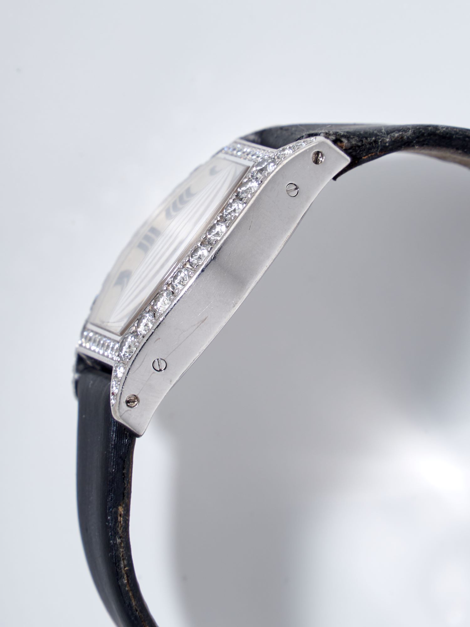 CaseTonneau-shaped case in 18k white gold, polished, fixed bezel in 18k white gold, diamond-set, exhibition caseback fixed on 4 screws, engraved ‘Cartier’, reference and case numbers, diamond-set crown at 3 o’clock