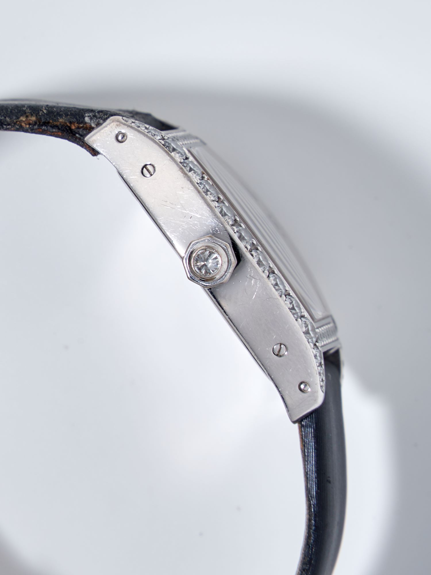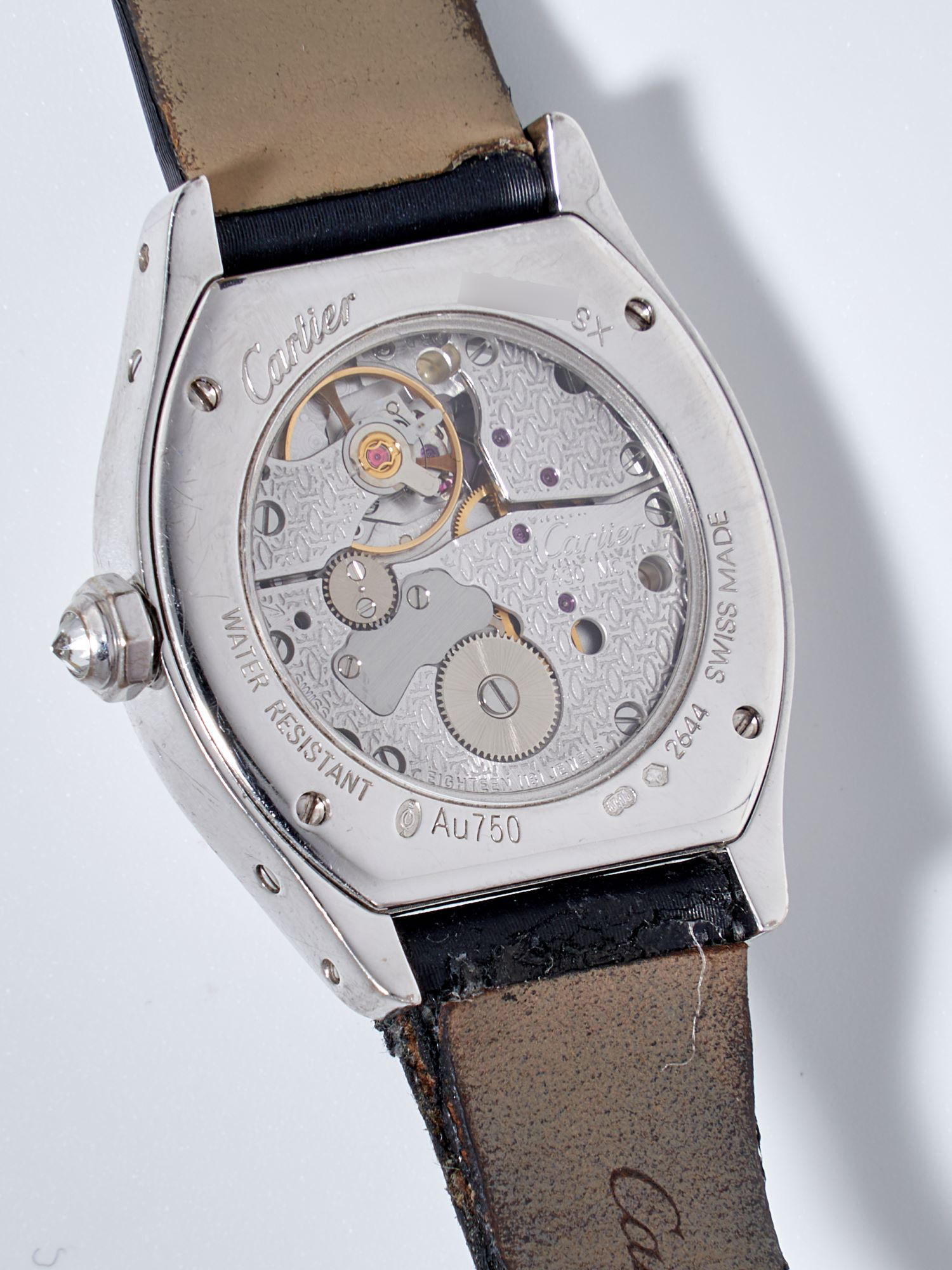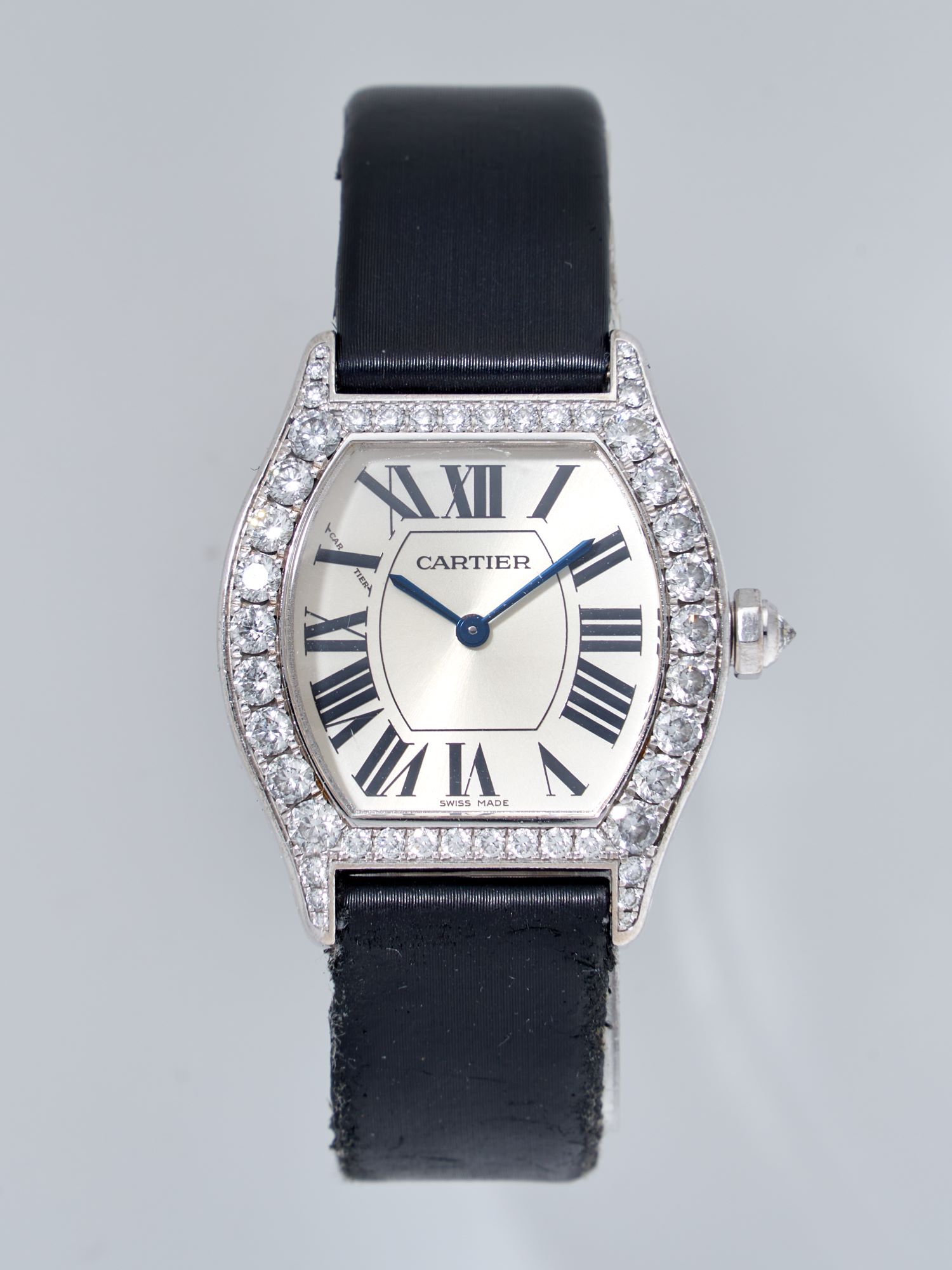 CaseTonneau-shaped case in 18k white gold, polished, fixed bezel in 18k white gold, diamond-set, exhibition caseback fixed on 4 screws, engraved ‘Cartier’, reference and case numbers, diamond-set crown at 3 o’clock