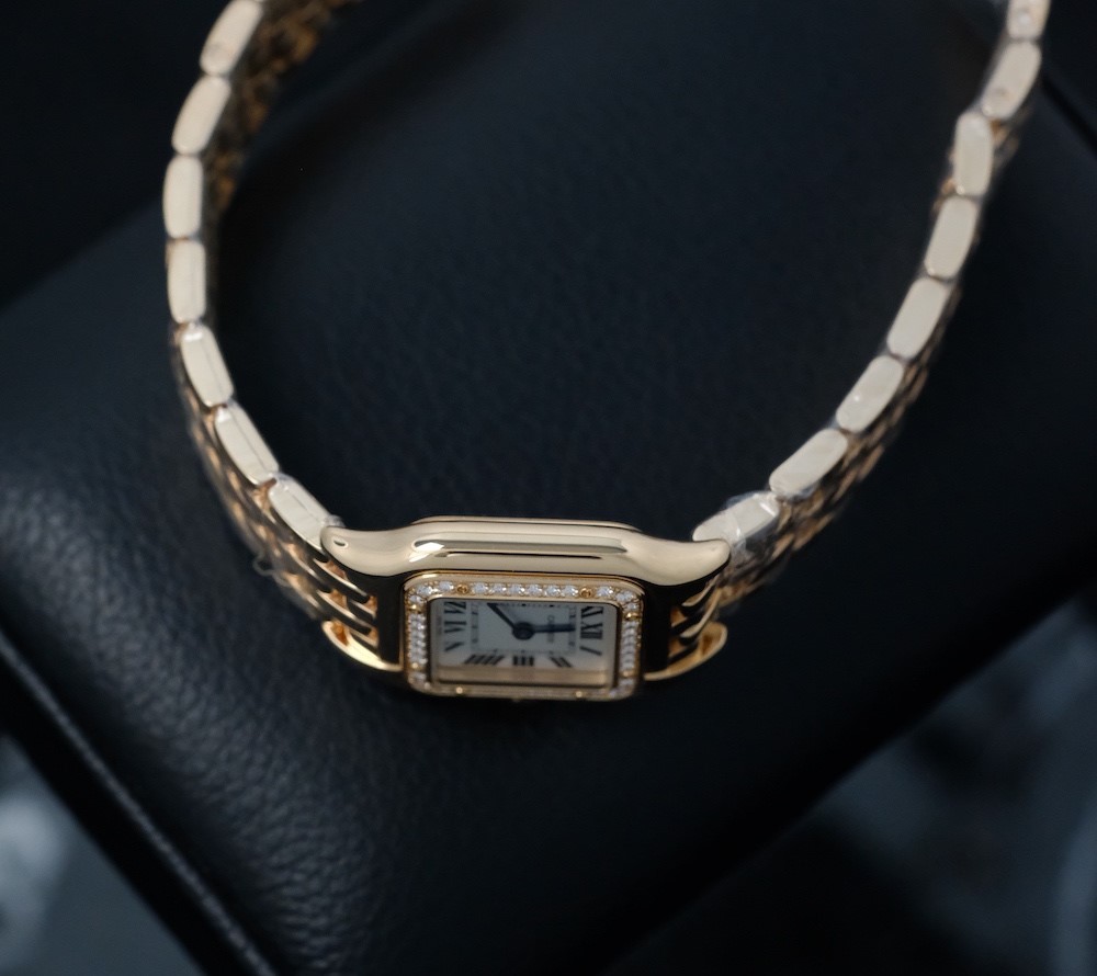 CaseSquare case with rounded corners in 18k rose gold, polished, fixed bezel in 18k rose gold, diamond-set, solid gold caseback, fixed on 8 screws, with engraved ‘Cartier Swiss Made’ inscription, case and reference numbers, diamond-set crown at 3 o’clock between protective shoulders of the case