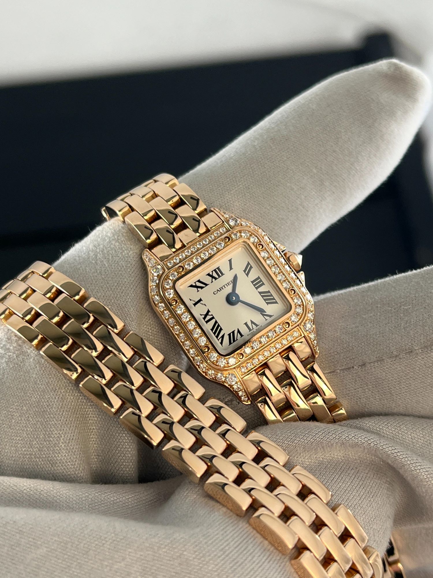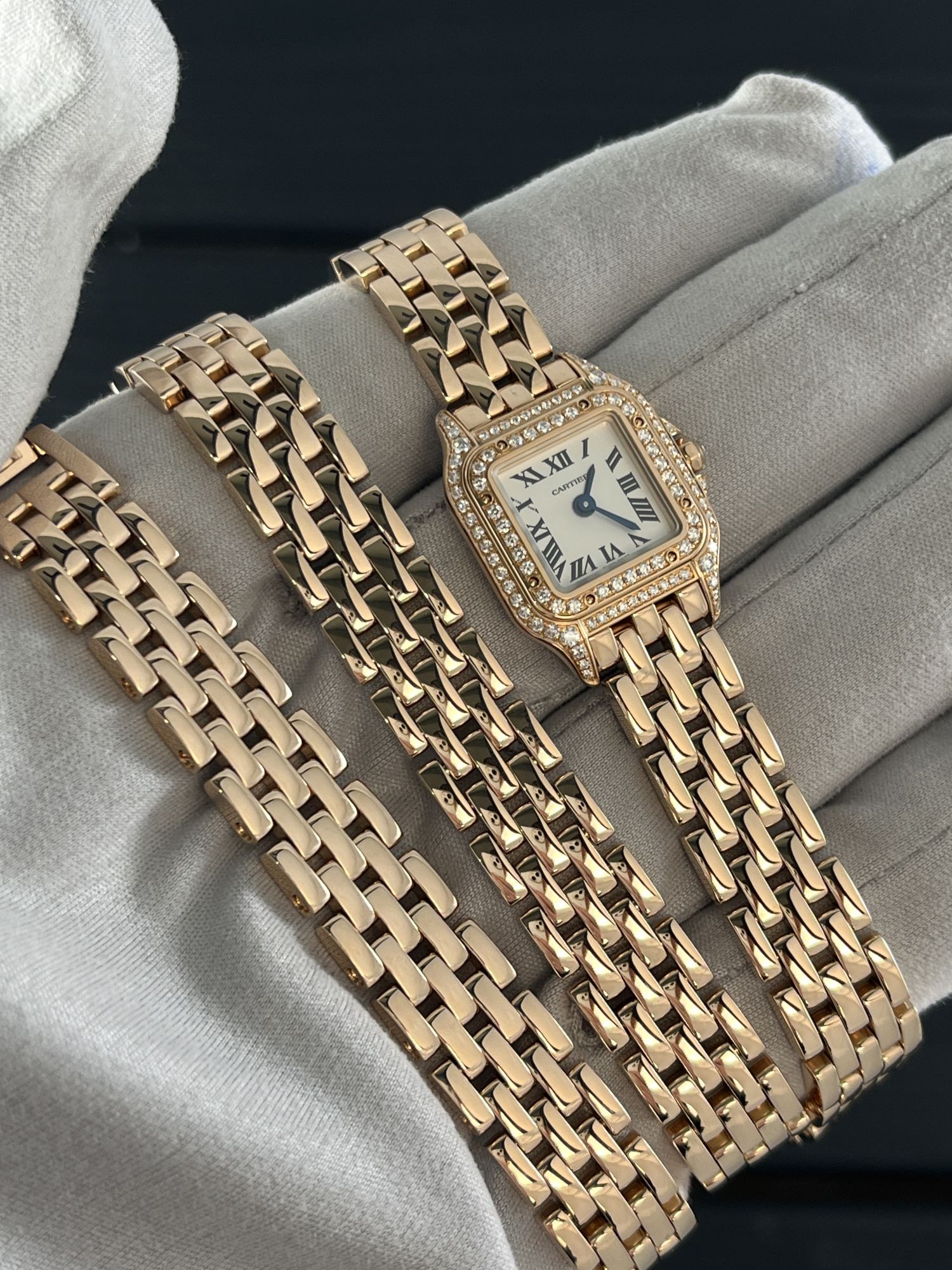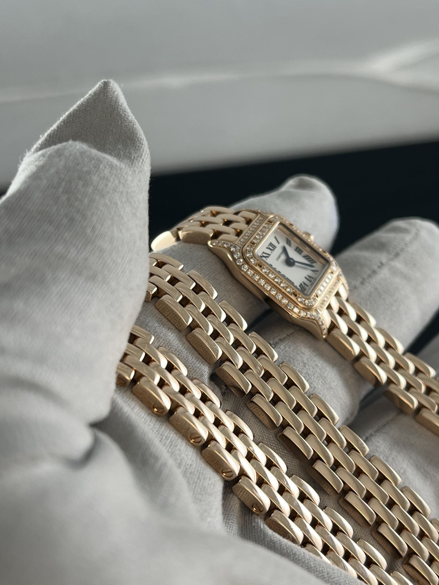 CaseSquare case with rounded corners in 18k rose gold, polished, fixed bezel in 18k rose gold, diamond-set, solid gold caseback, fixed on 4 screws, with engraved ‘Cartier Swiss Made’ inscription, case and reference numbers, diamond-set crown at 3 o’clock between protective shoulders of the case