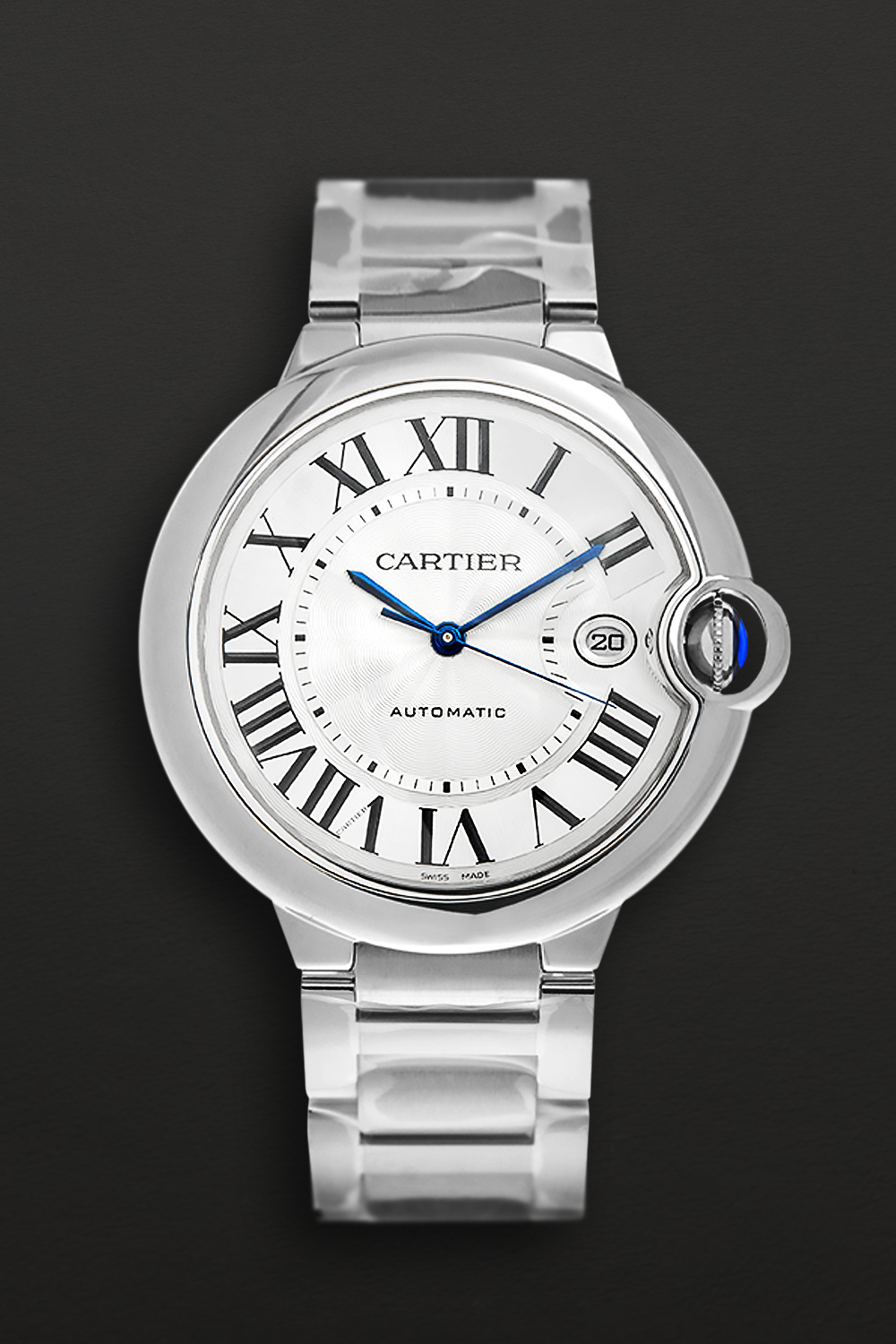 CaseSteel case, fluted crown set with a cabochon synthetic spinel