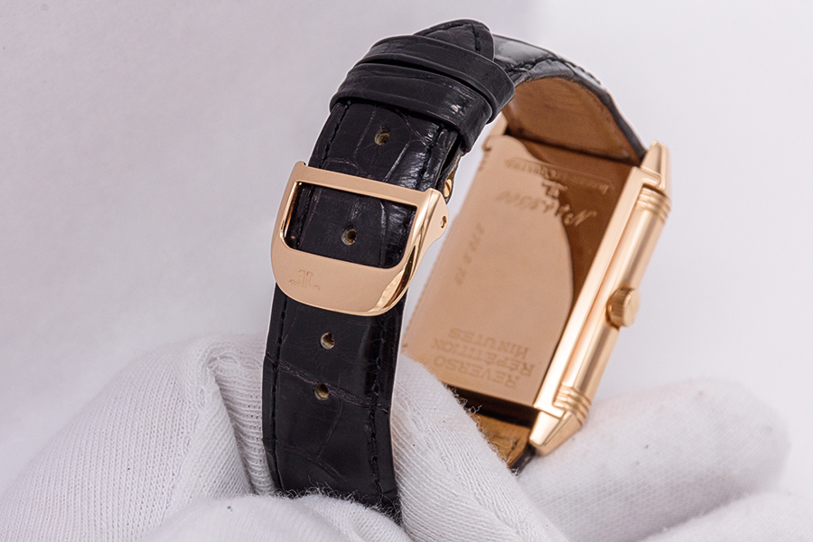 DialSilver-plated dial, signed ‘Reverso’ and ‘Repetition Minutes’, applied JL logo in rose gold at 12 o’clock, central zone with ‘lozenge’ guilloche pattern, black Arabic numerals, innerminute track, blued ‘sword’ hour and minute hands, aperture with silent repeater regulator at 5 o’clock