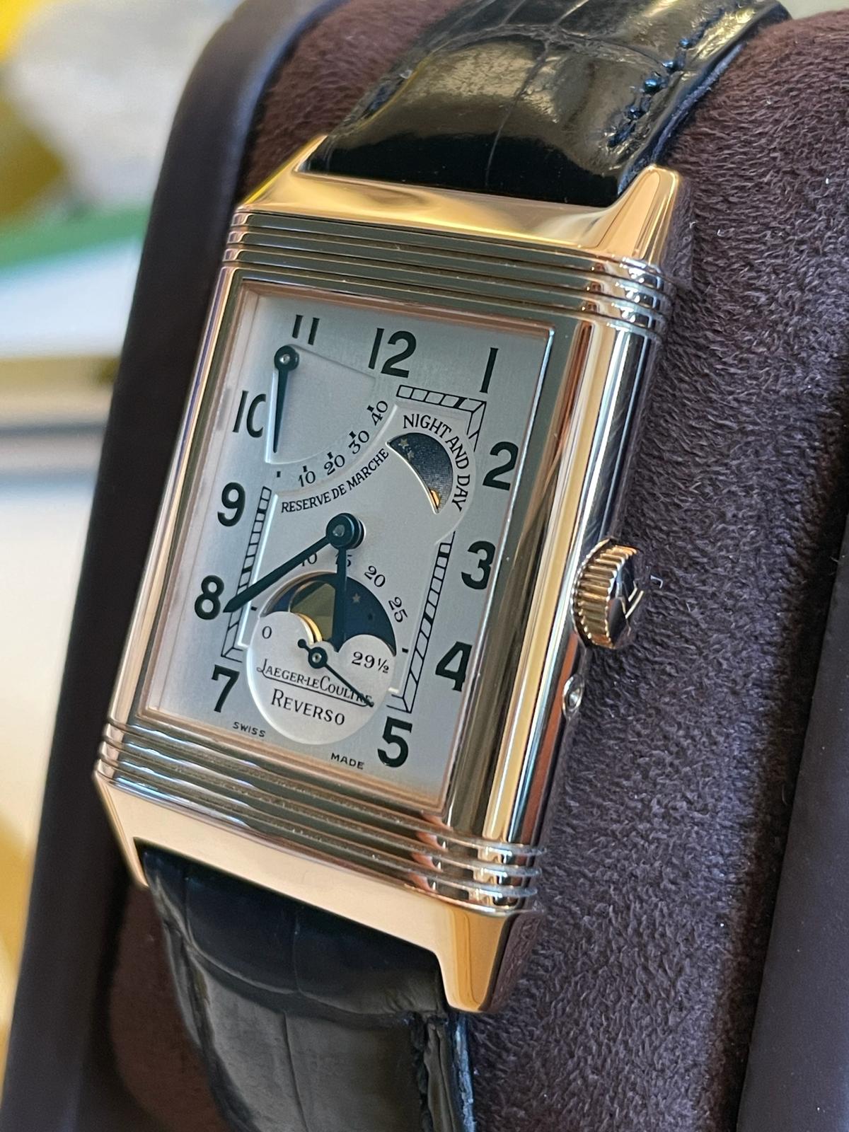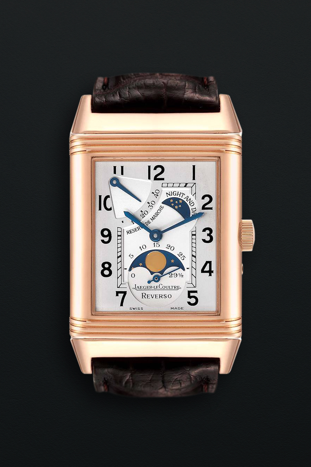 DialSilver-plated dial, signed Jaeger-LeCoultre Reverso’, with recessed central zone, black Arabic numerals, inner‘railway’ minute track, blued ‘sword’ hour and minute hands, small seconds and moonphase at 6 o’clock, power reserve indicator at 11 o’clock, day/night indicator at 2 o’clock