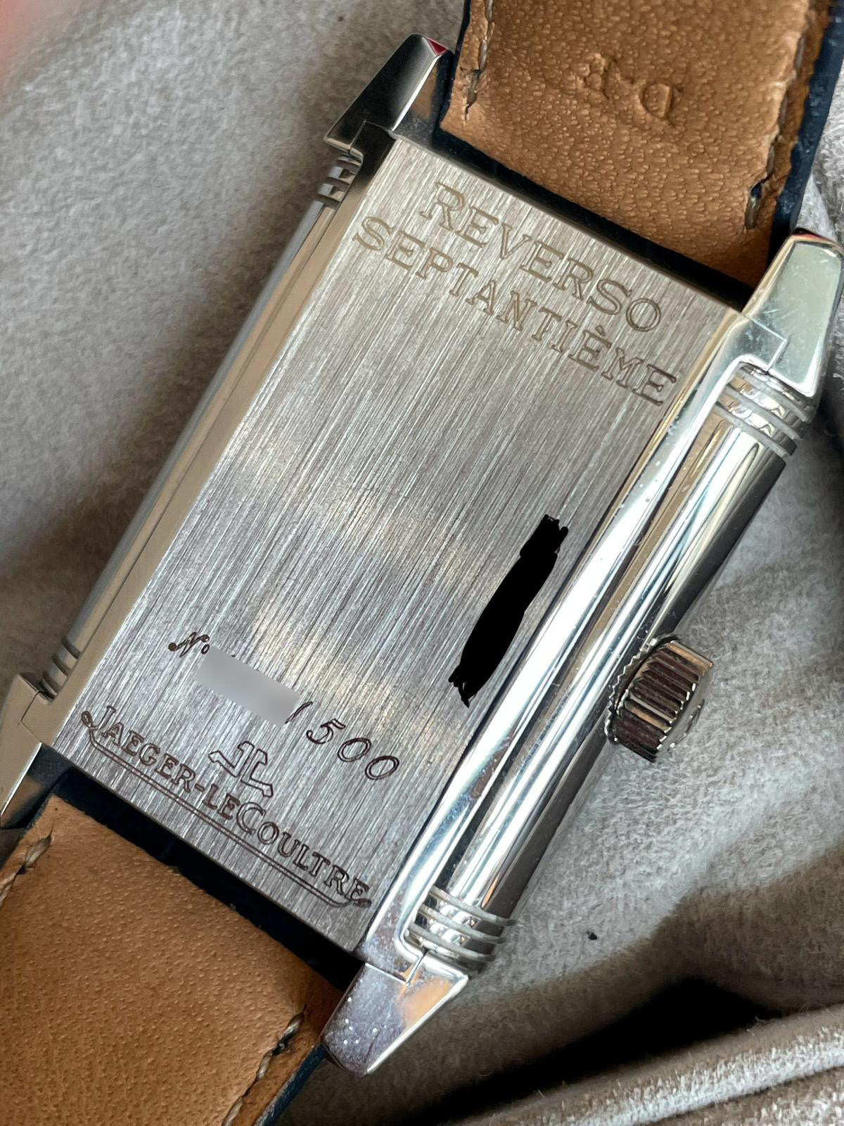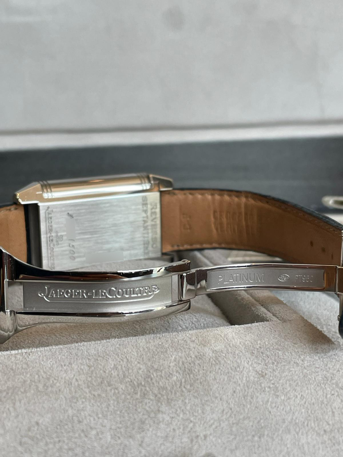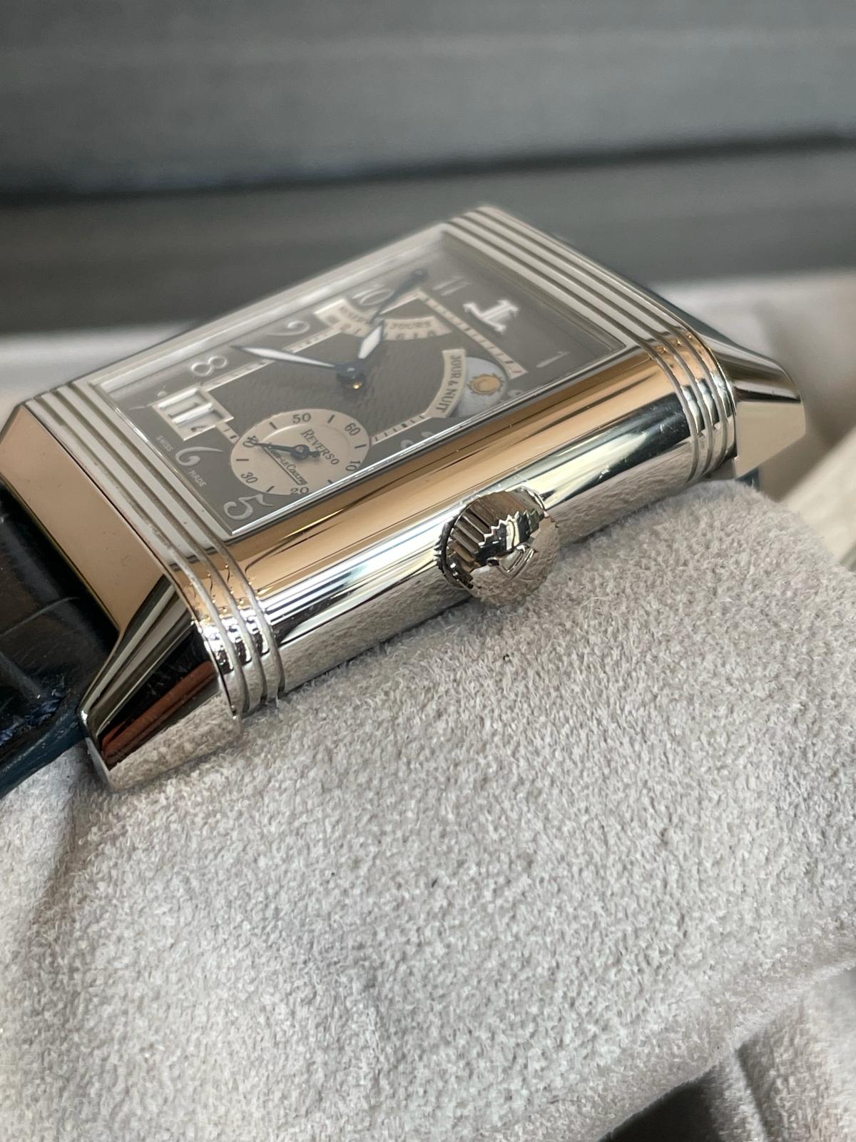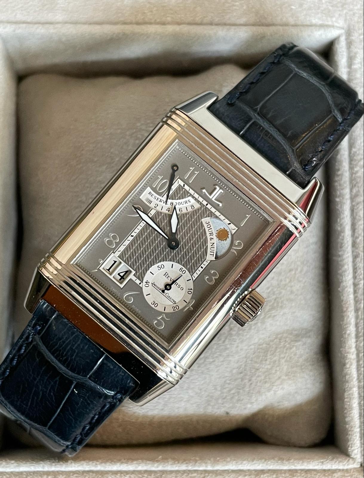 DialSlate grey dial, signed ‘Jaeger-LeCoultre Reverso’, central zone with guilloche ‘wave’ pattern, white metallic paint transferred Art-Nouveau Arabic numerals, innerminute track, applied JL logo at 12 o’clock, blued ‘sword’ hour and minute hands, luminous, recessed and grooved silver-plated sub-dial for small seconds 5 o’clock, 8-day power reserve indicator at 11 o’clock, day/night indicator at 2 o’clock, big date aperture at 7 o’clock