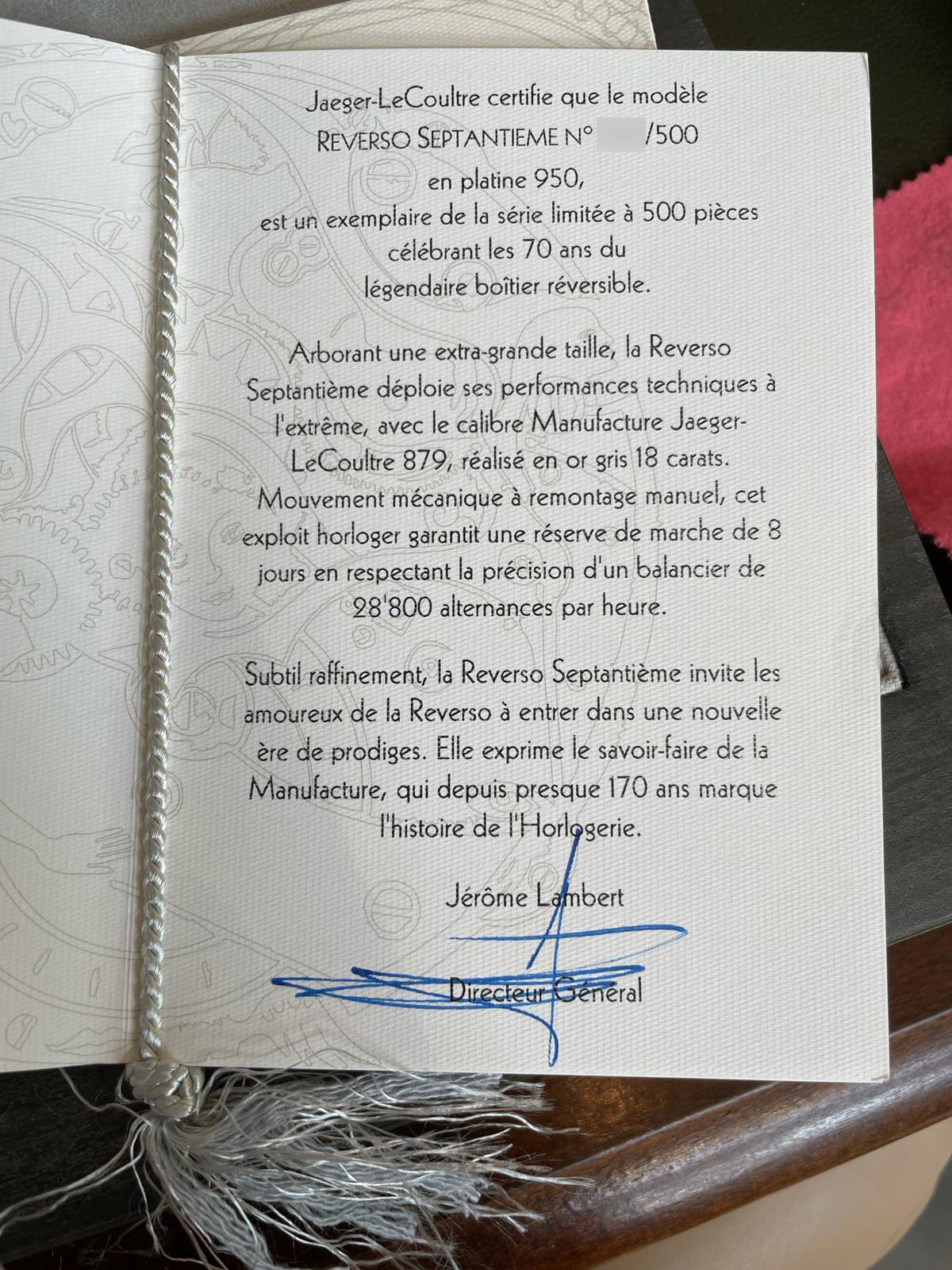CaseRectangular reversible case in platinum 950, polished, fixed bezel in platinum 950, polished, back of the external case with JL Jaeger LeCoultre logo, ‘Reverso Septantième’, case and reverence numbers engraved, brushed, exhibition caseback of a reversible case, 18k white gold winding crown at 3 o’clock with embossed JL logo