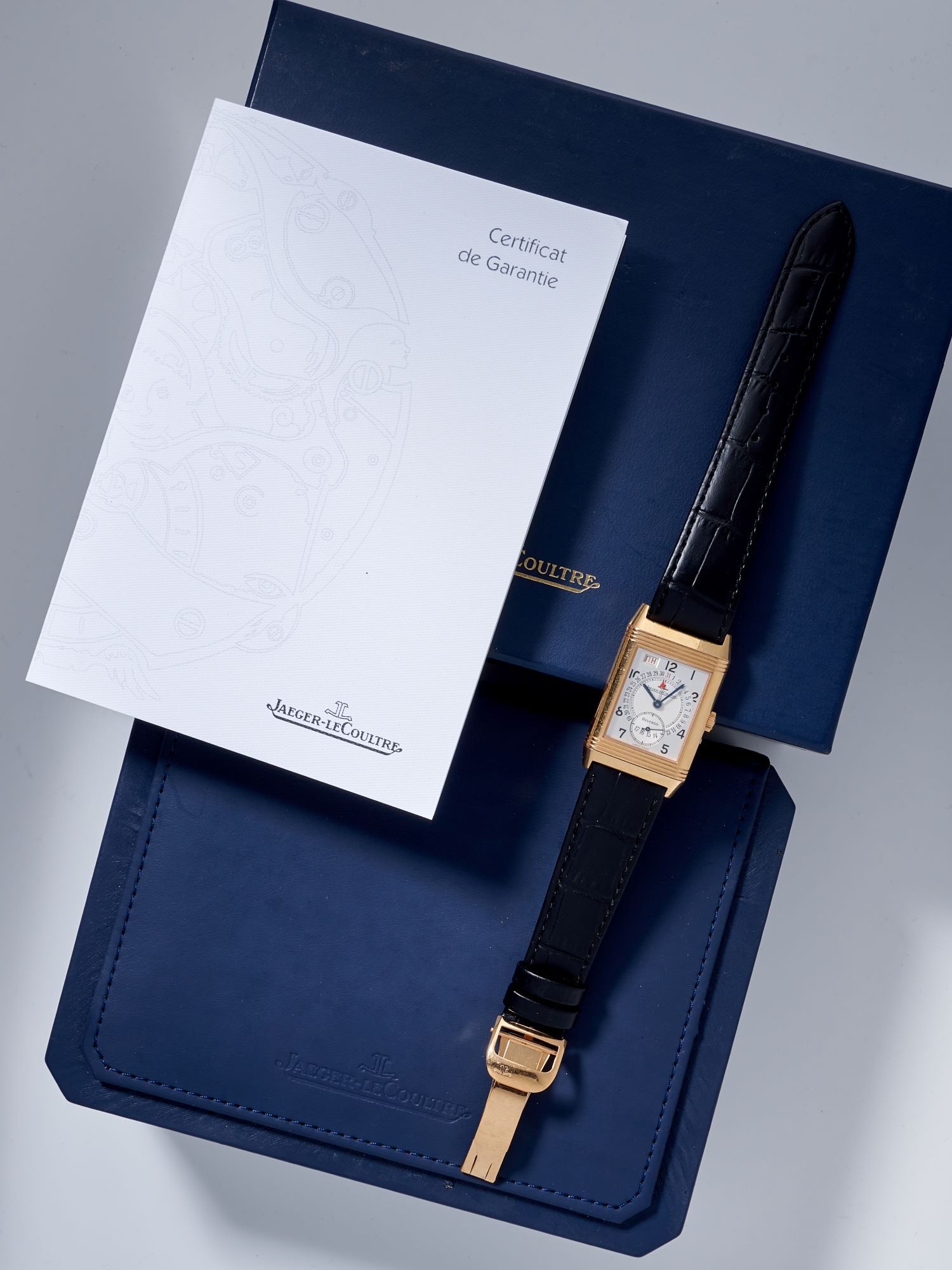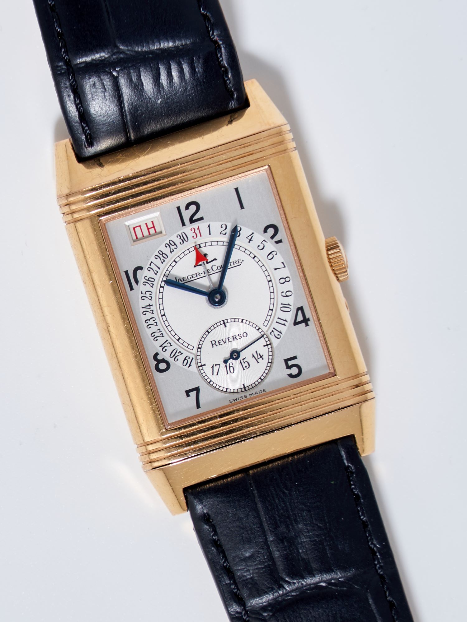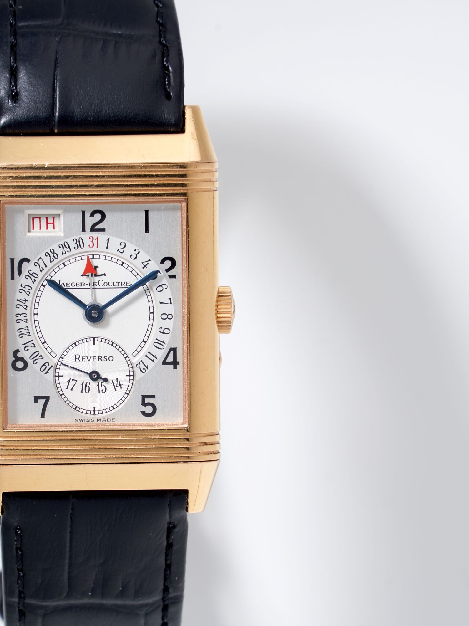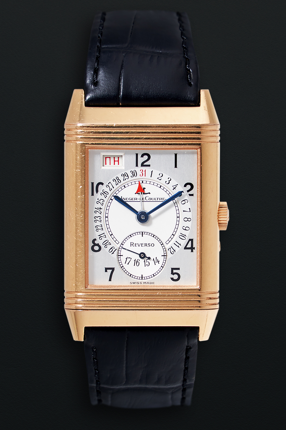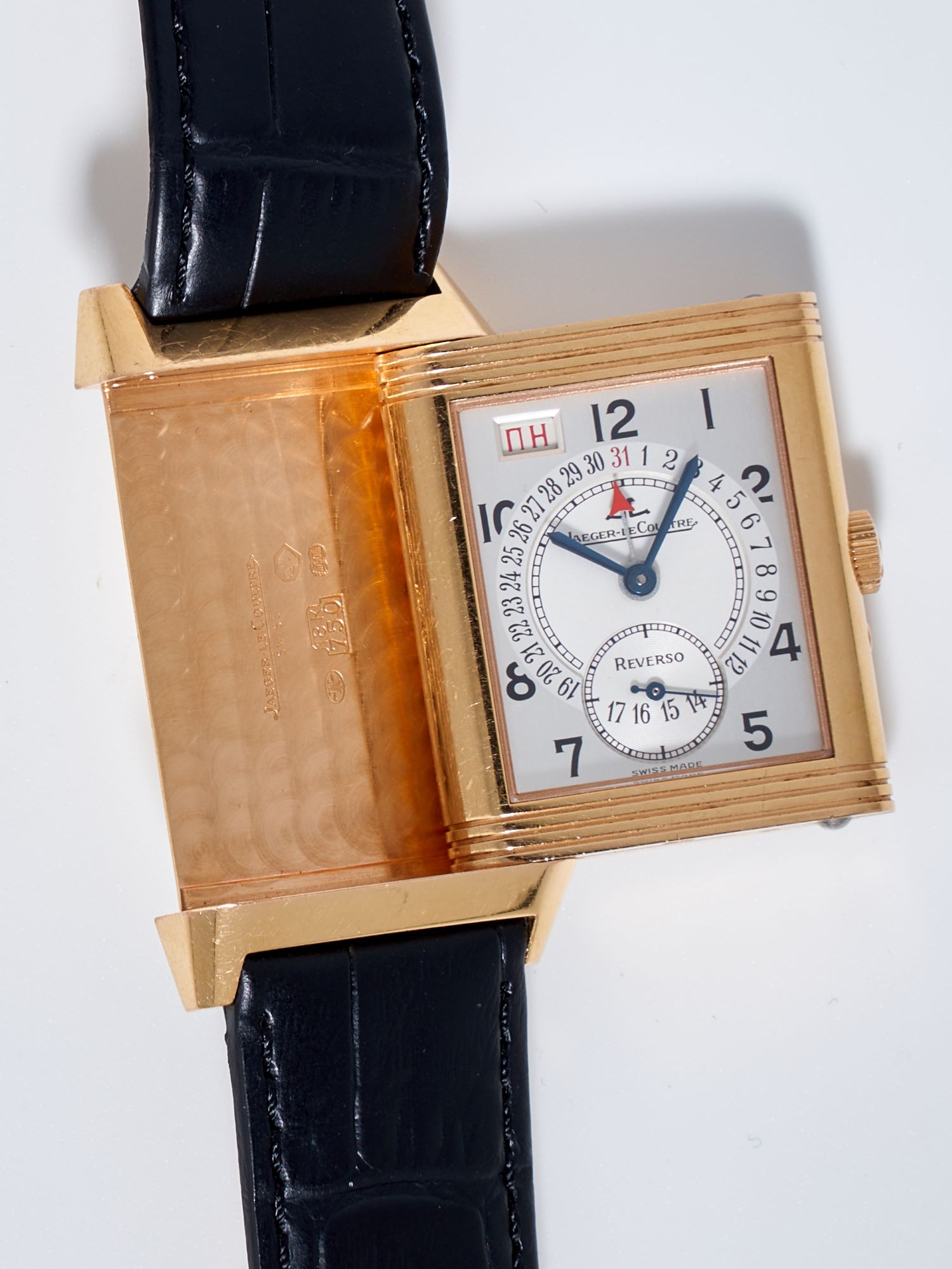 DialWhite matt silver-plated dial, signed ‘JL Jaeger LeCoultre Reverso’, grey outer zone, black Arabic numerals, ‘railway’ minute track, blued ‘sword’ hour and minute hands, silvery central hand with red tip to show the date, recessed and grooved sub-dial for small seconds at 6 o’clock, day of the week aperture with Russian day names at 11 o’clock