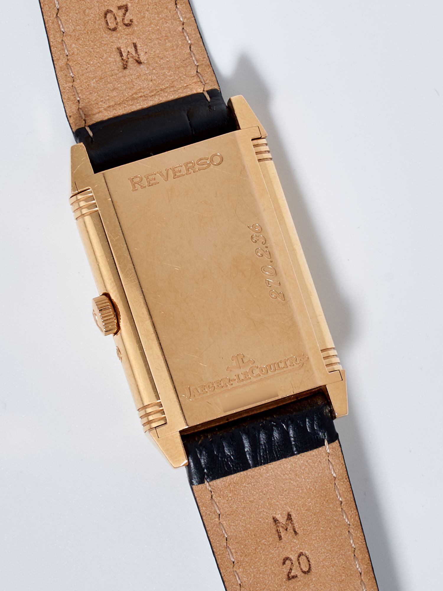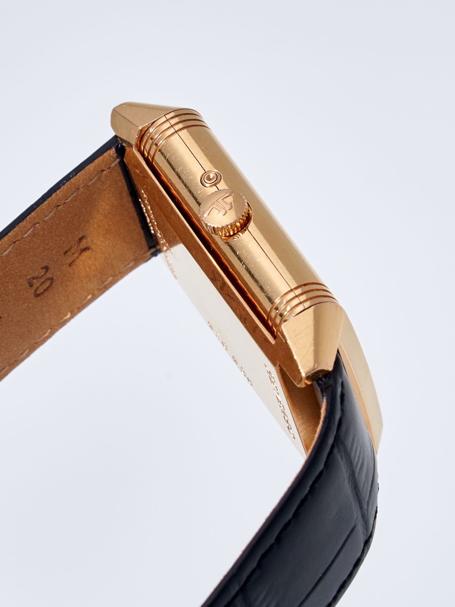 CaseRectangular reversible case in 18k rose gold, polished and decorated by perlage, back of the external case with JL Jaeger LeCoultre logo, ‘Reverso’, case and reverence numbers engraved, fixed bezel in 18k rose gold, winding crown at 3 o’clock with embossed JL logo