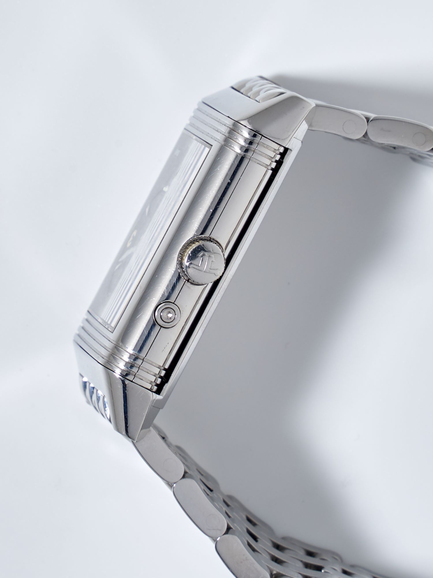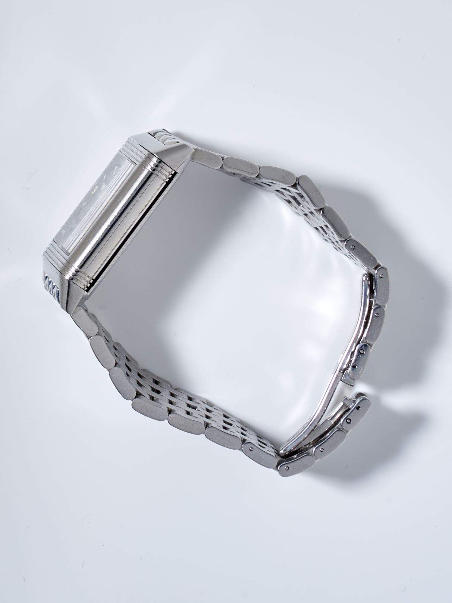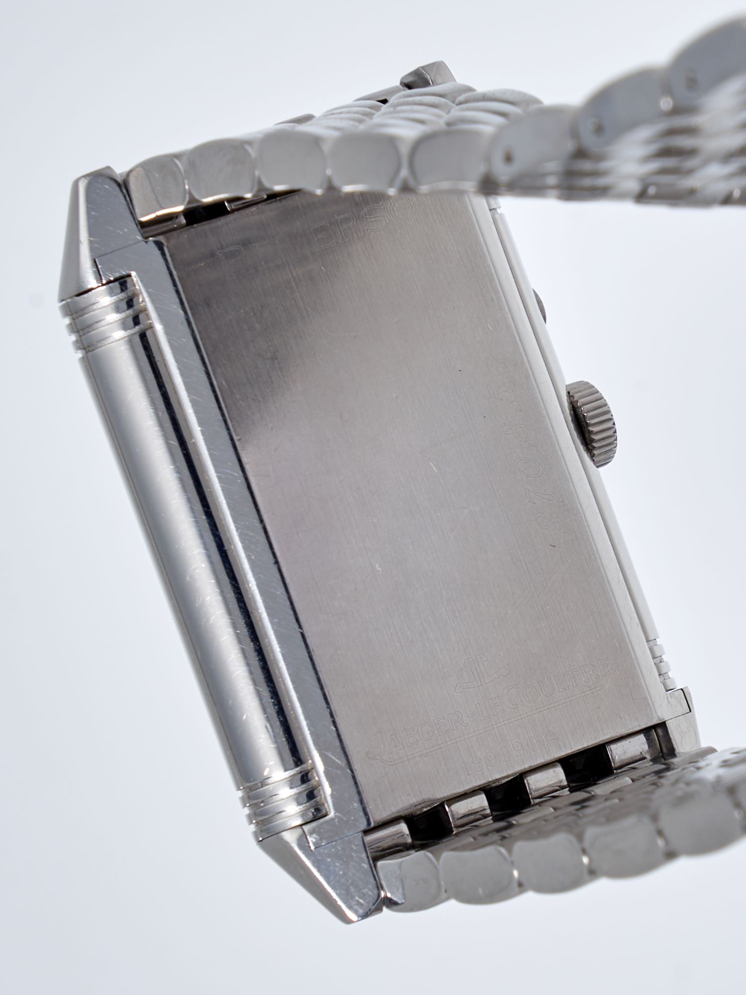 CaseRectangular double-dial reversible case in stainless steel, polished, brushed and decorated by perlage, back of the external case with JL Jaeger LeCoultre logo, ‘Reverso’, case and reverence numbers engraved, fixed bezels in stainless steel, winding crown at 3 o’clock with embossed JL logo