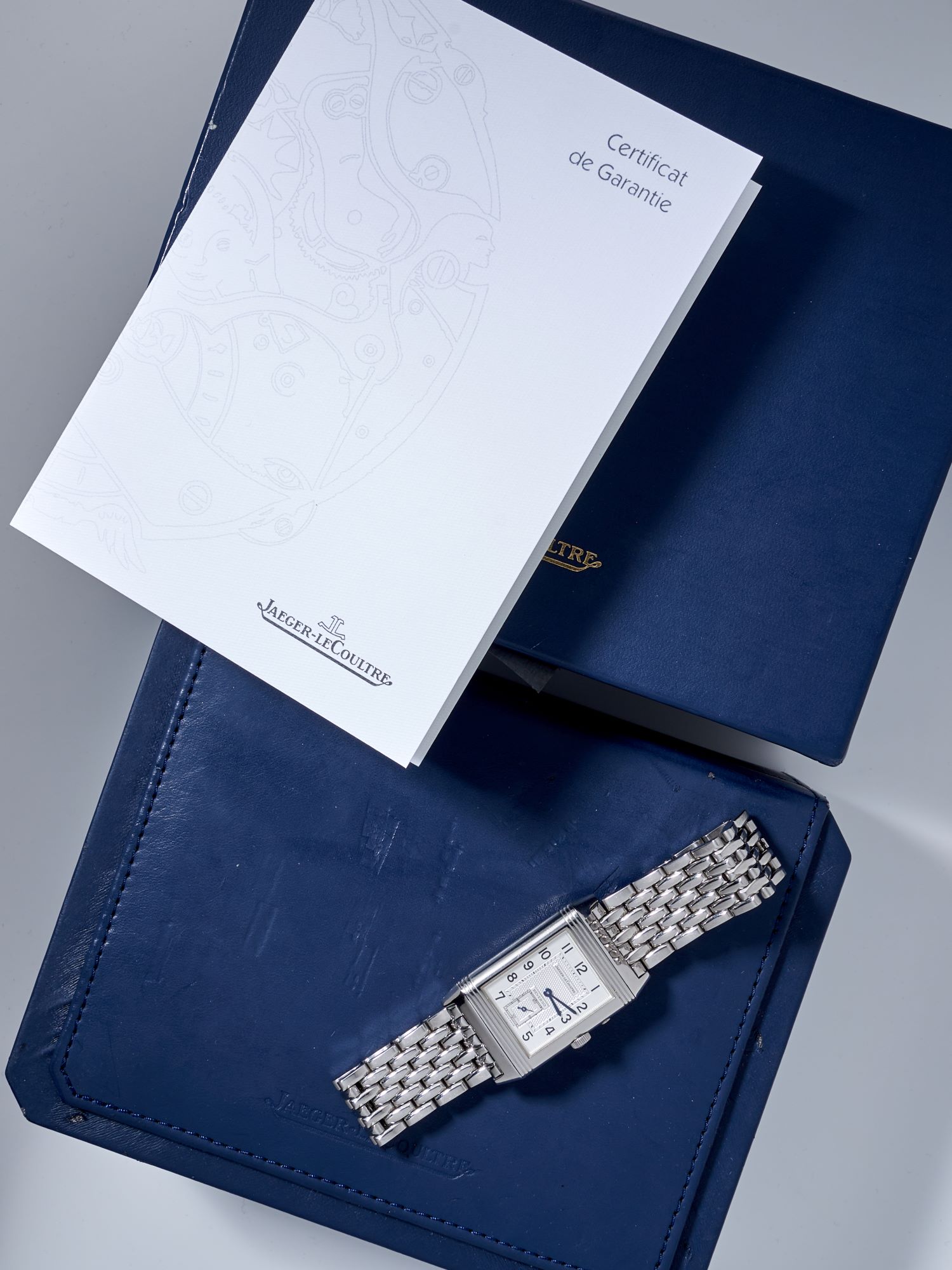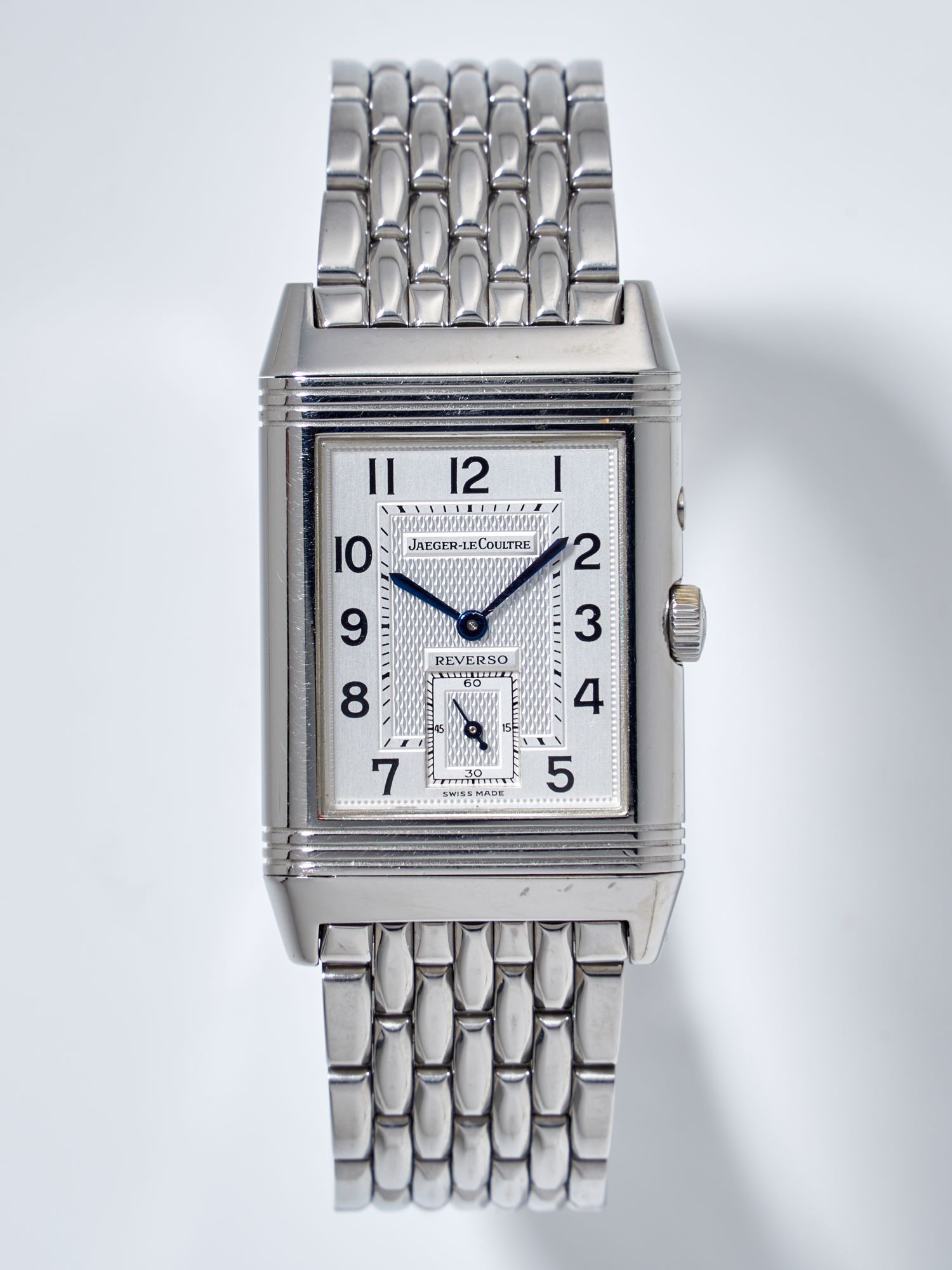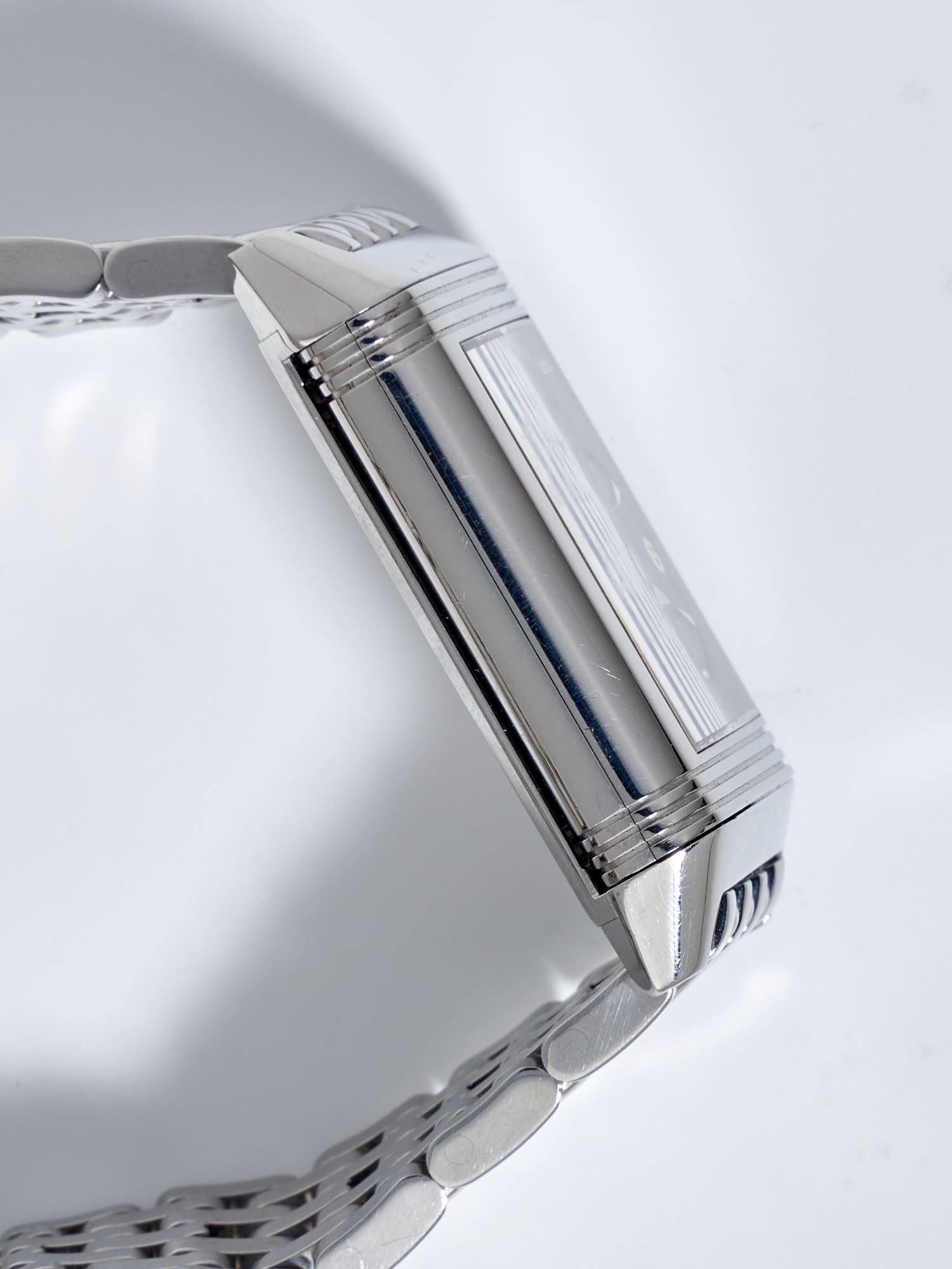 CaseRectangular double-dial reversible case in stainless steel, polished, brushed and decorated by perlage, back of the external case with JL Jaeger LeCoultre logo, ‘Reverso’, case and reverence numbers engraved, fixed bezels in stainless steel, winding crown at 3 o’clock with embossed JL logo