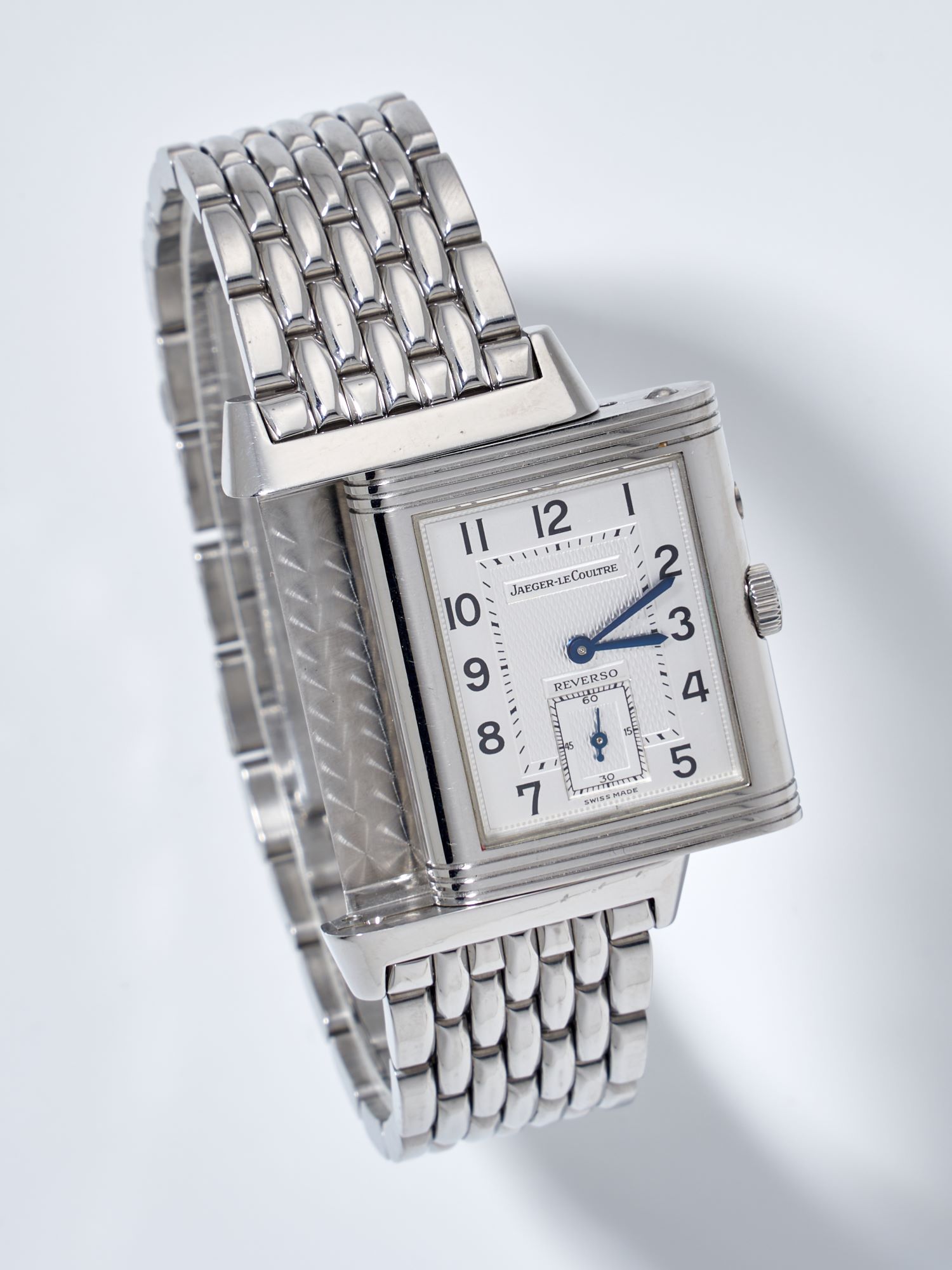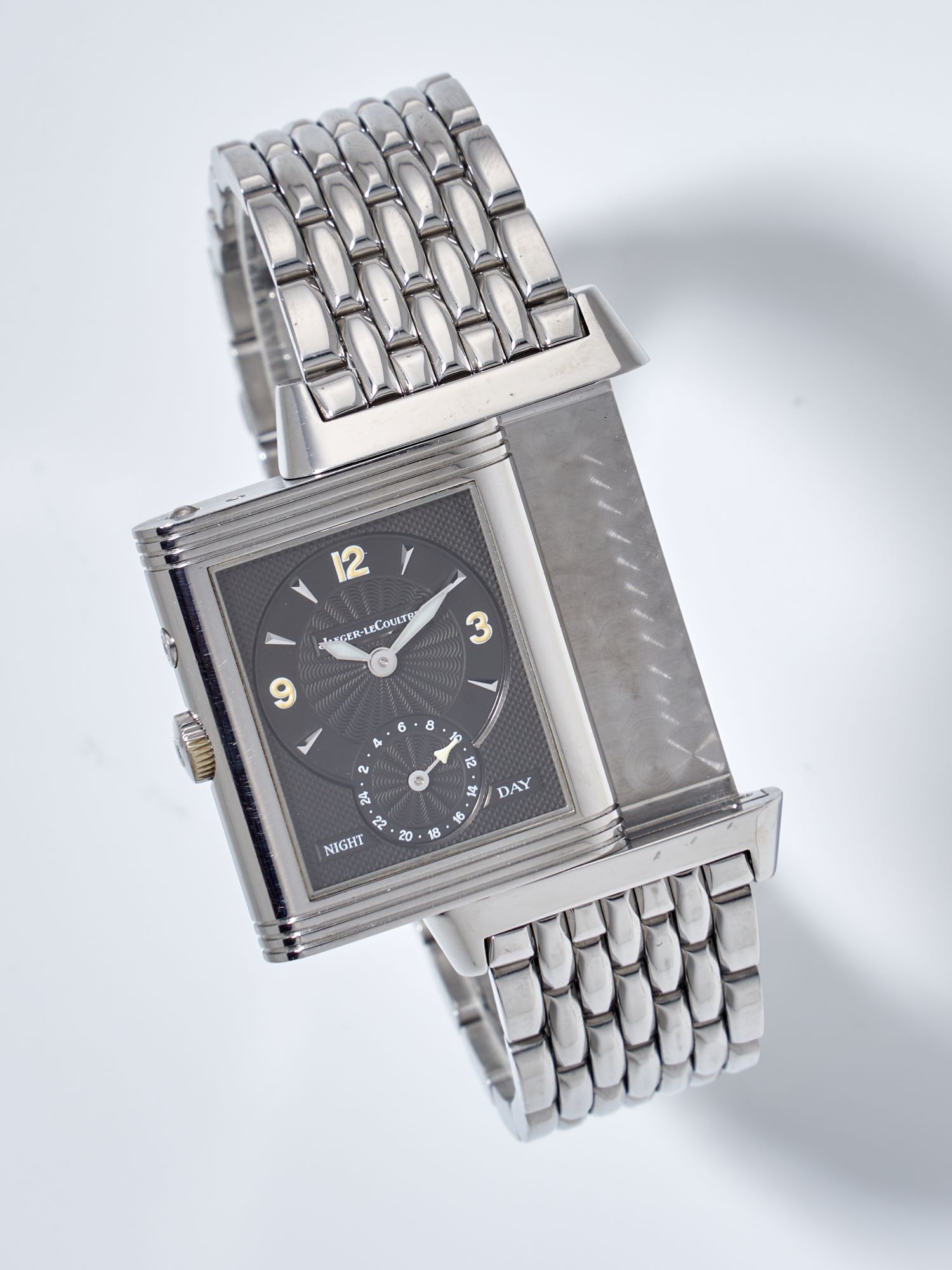 Dial‘Day’ side matt silvered dial, signed ‘Jaeger LeCoultre Reverso’, with ‘grains d’orge’ guilloche pattern, black Arabic numerals, innerminute track, blued ‘sword’ hour and minute hands, small seconds at 6 o’clock, slate grey ‘night’ side dial on reverse side with outer ‘Clous de Paris’ and inner ‘lotus’ guilloche patterns, signed Jaeger LeCoultre, luminous ‘sword’ hour and minute hands, luminous 12, 3 and 9 Arabic numerals, and applied faceted indexes, 24-hour day/night indicator at 6 o’clock with luminous hand