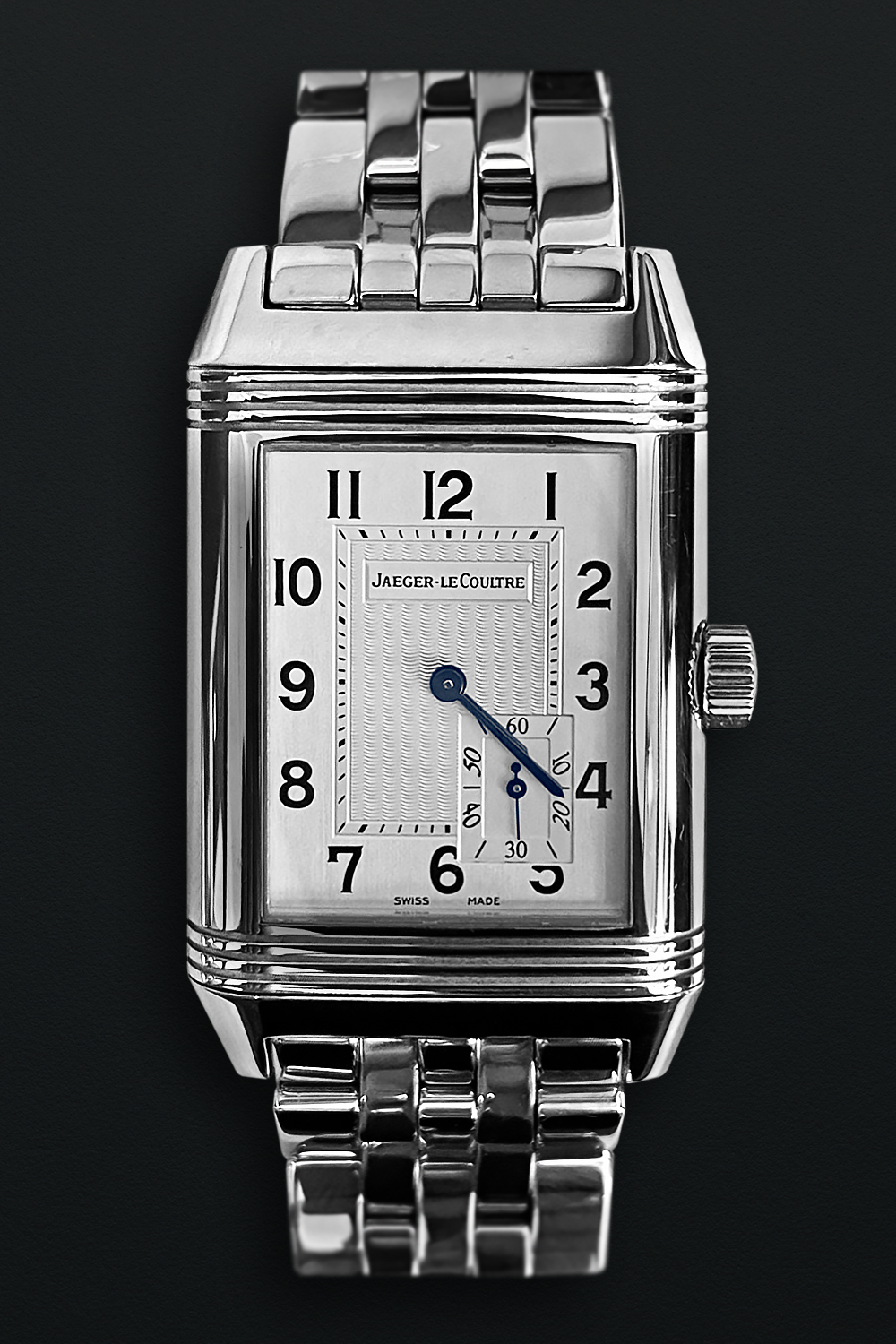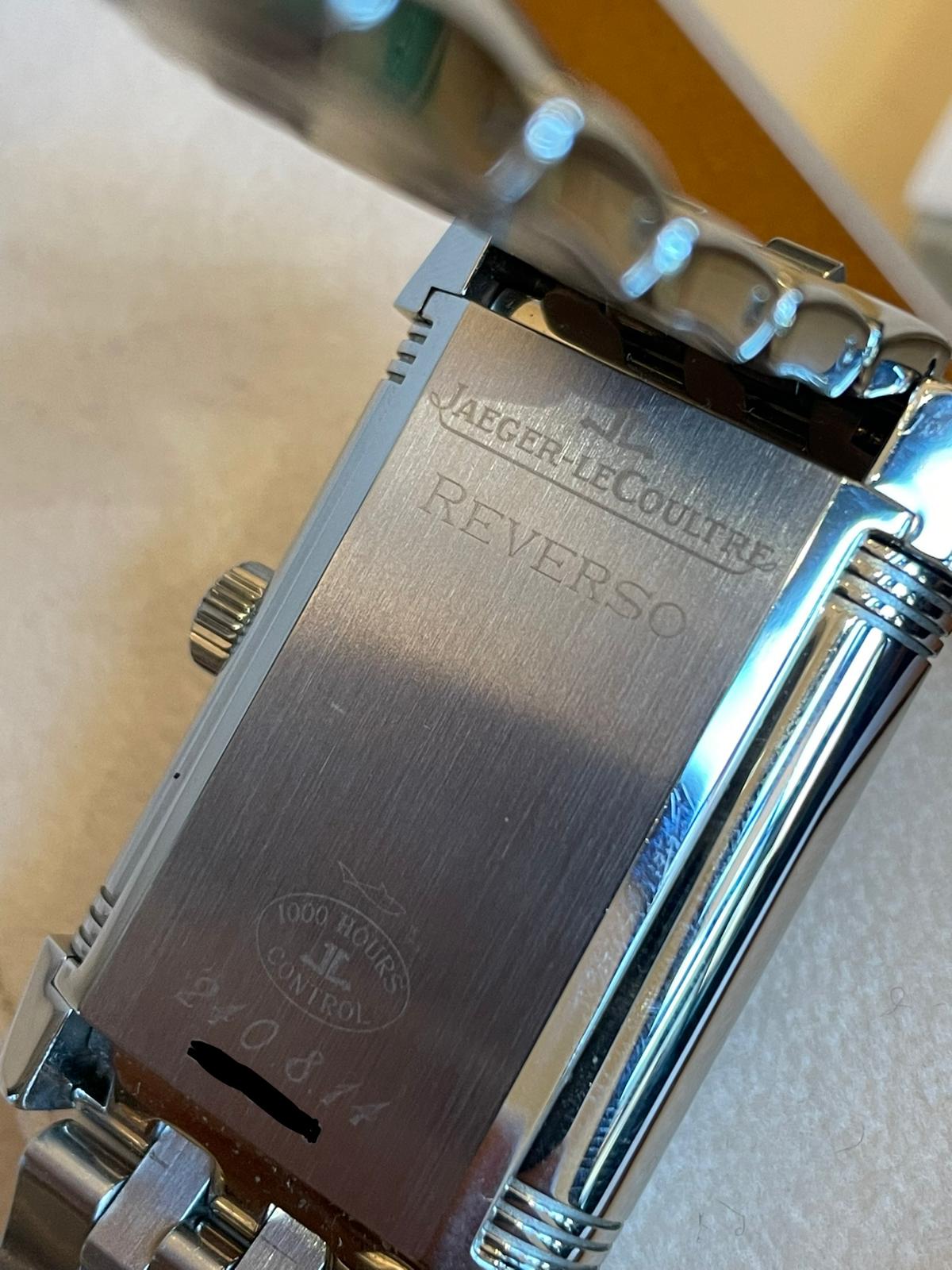 CaseRectangular reversible case in stainless steel, polished, brushed and decorated by perlage, back of the external case with JL Jaeger LeCoultre logo, ‘Reverso’, ‘1000 Hours JL Control’ case and reverence numbers engraved, polished caseback of reversible case with aperture for power reserve indicator, fixed bezel in stainless steel, polished, winding crown at 3 o’clock with embossed JL logo