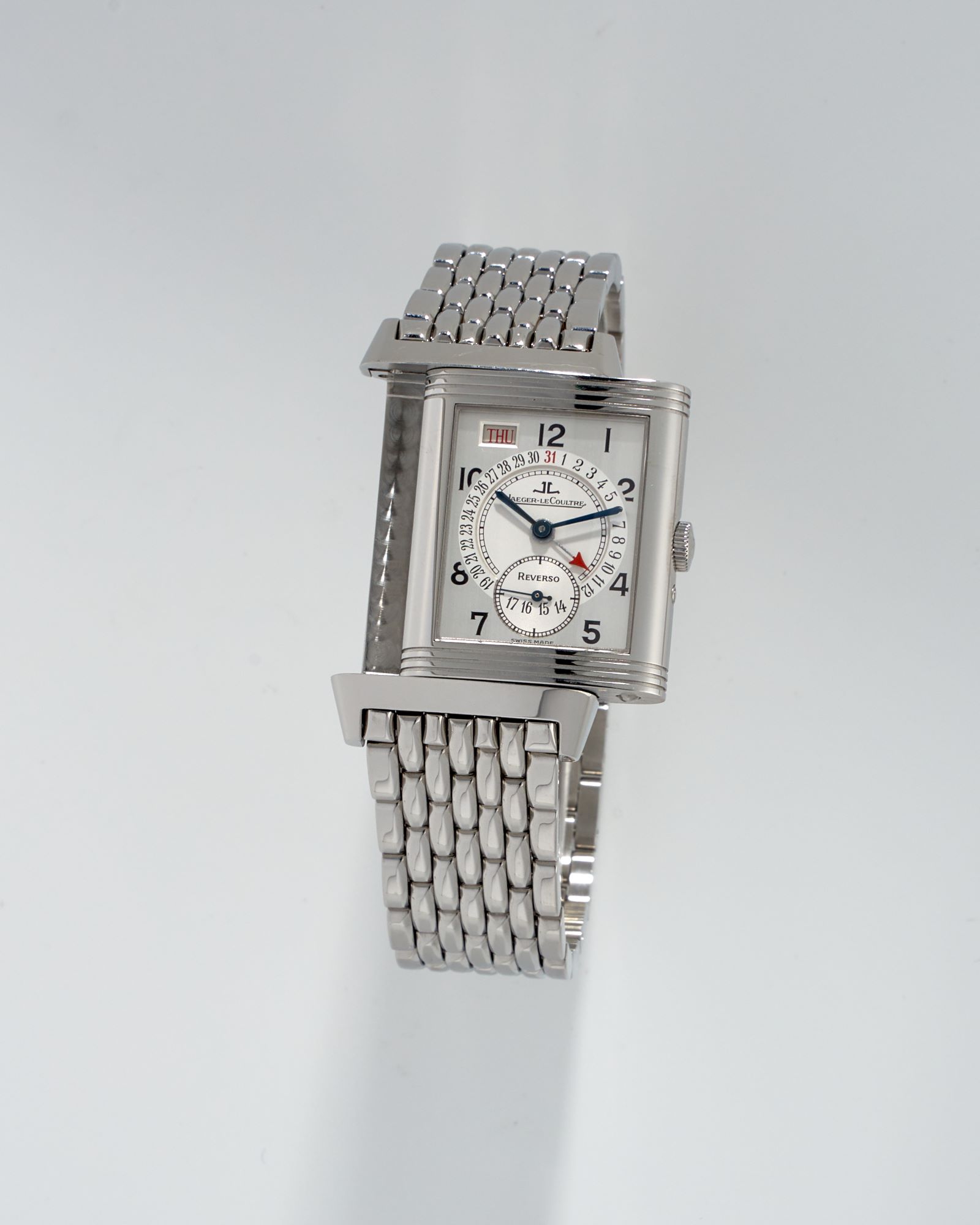 DialWhite matt silver-plated dial, signed ‘JL Jaeger LeCoultre Reverso’, grey outer zone, black Arabic numerals, ‘railway’ minute track, blued ‘sword’ hour and minute hands, silvery central hand with red tip to show the date, recessed and grooved sub-dial for small seconds at 6 o’clock, day of the week aperture at 11 o’clock