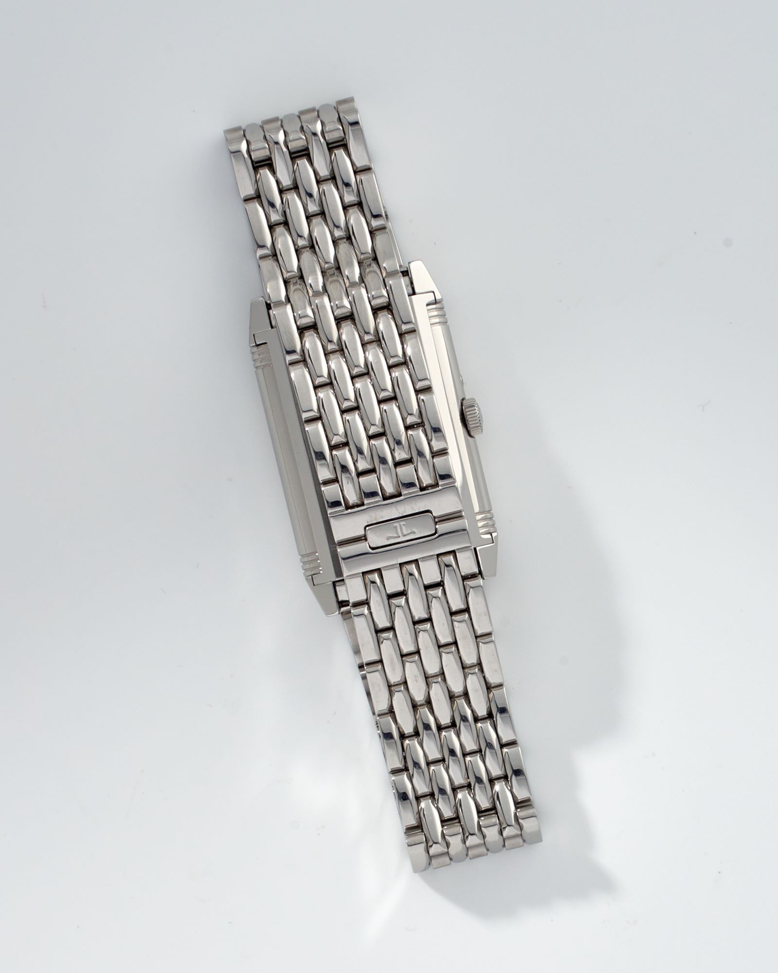 CaseRectangular reversible case in stainless steel, polished, brushed and decorated by perlage, back of the external case with JL Jaeger LeCoultre logo, ‘Reverso’, case and reverence numbers engraved, fixed bezel in stainless steel, polished, winding crown at 3 o’clock with embossed JL logo