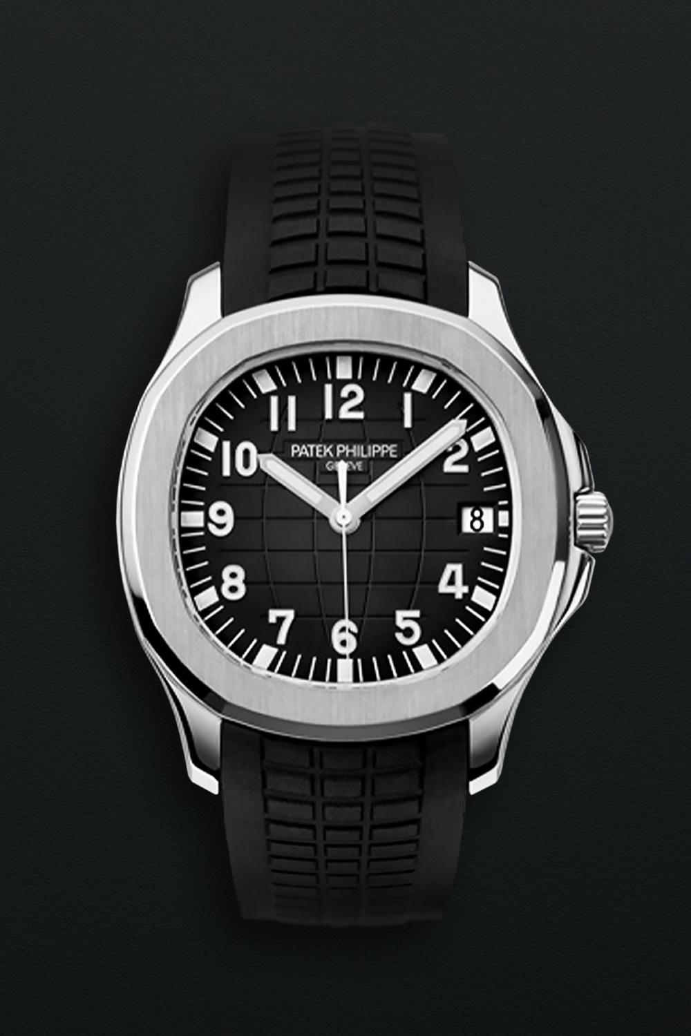 DialAnthracite sunburst dial, with medians and parallels motif in relief, signed Patek Philippe Geneve, ‘obelisk’ hour and minute hands, luminous, white sweep seconds hand, applied Arabic numerals in white gold, luminous, outer minute track with luminous hour indexes, date aperture at 3 o’clock