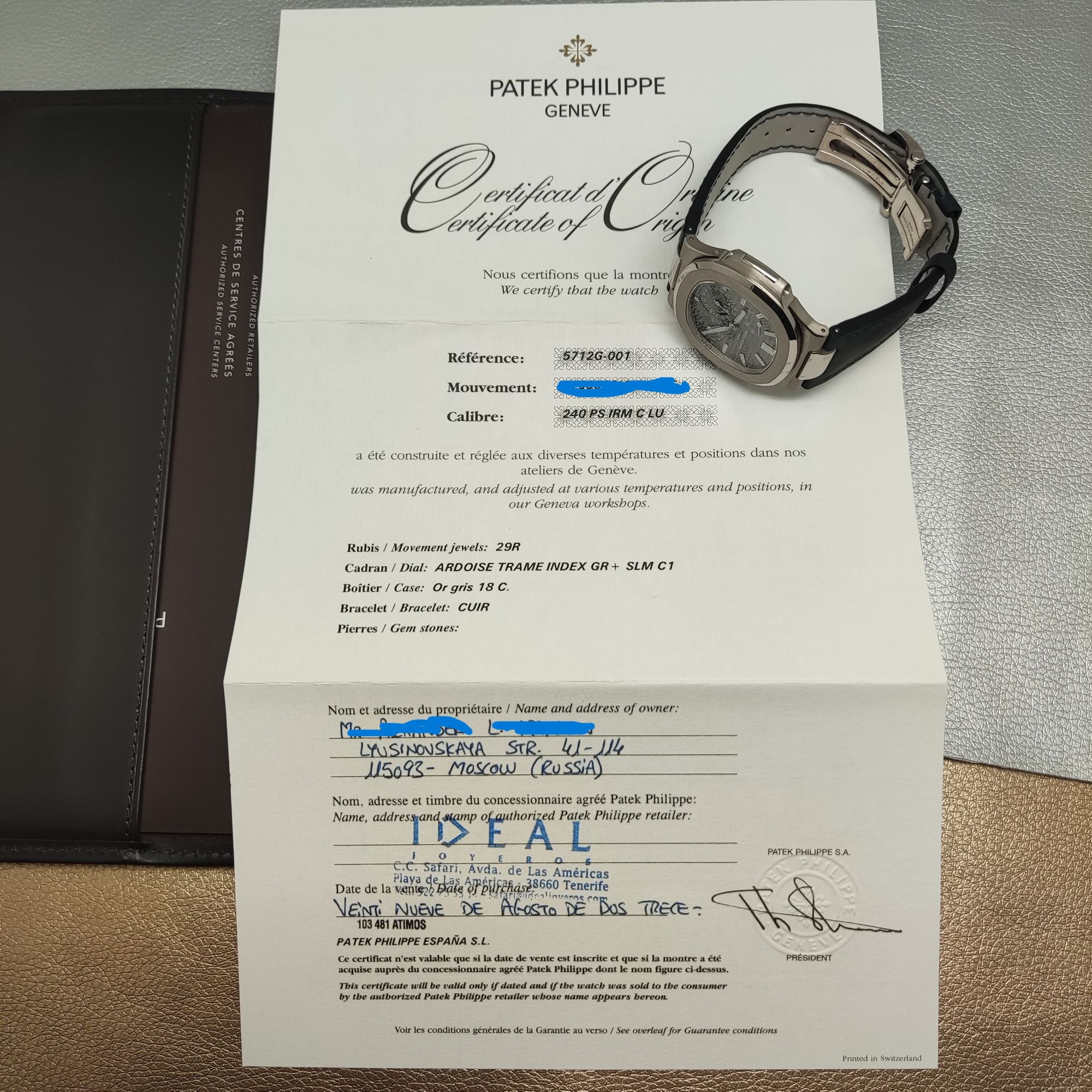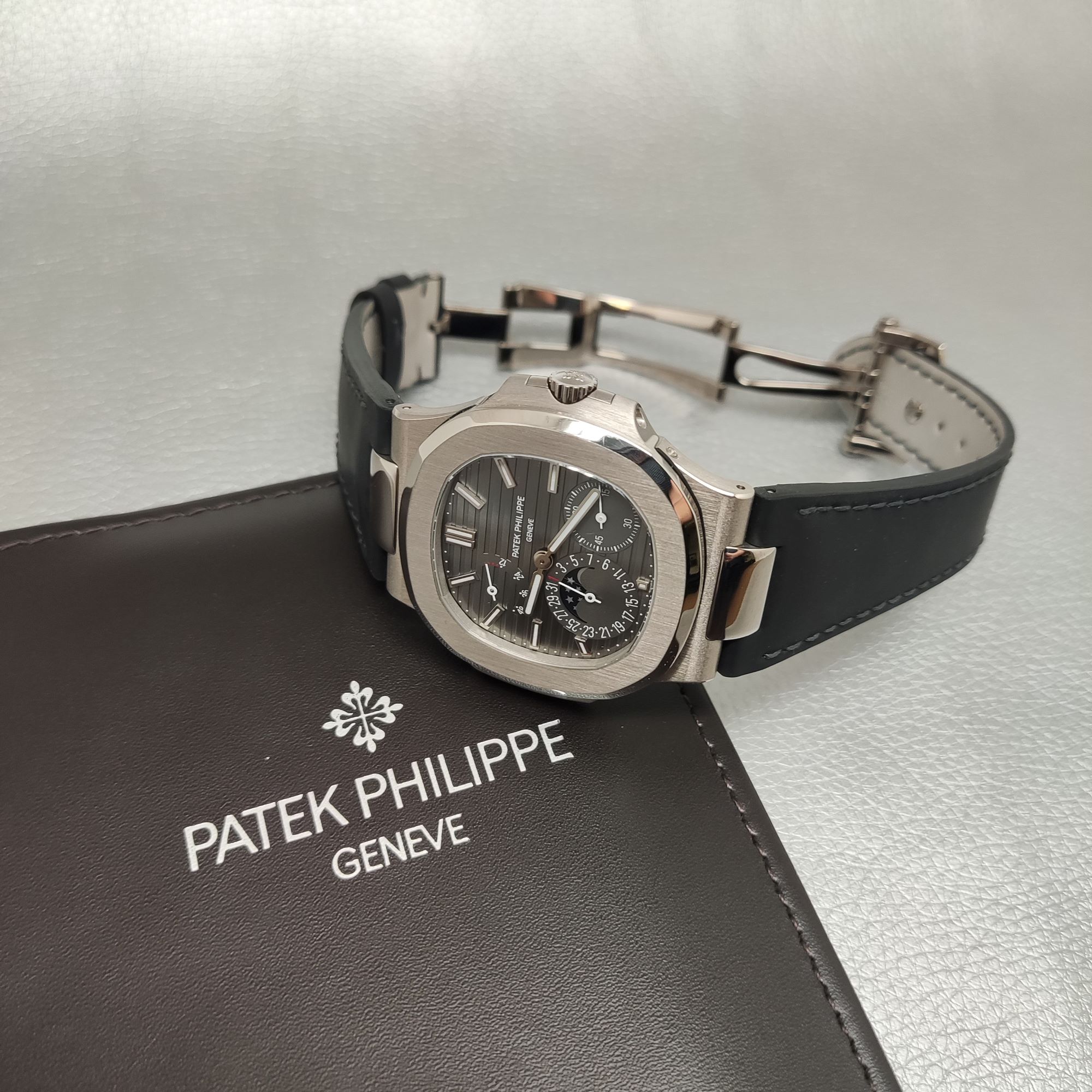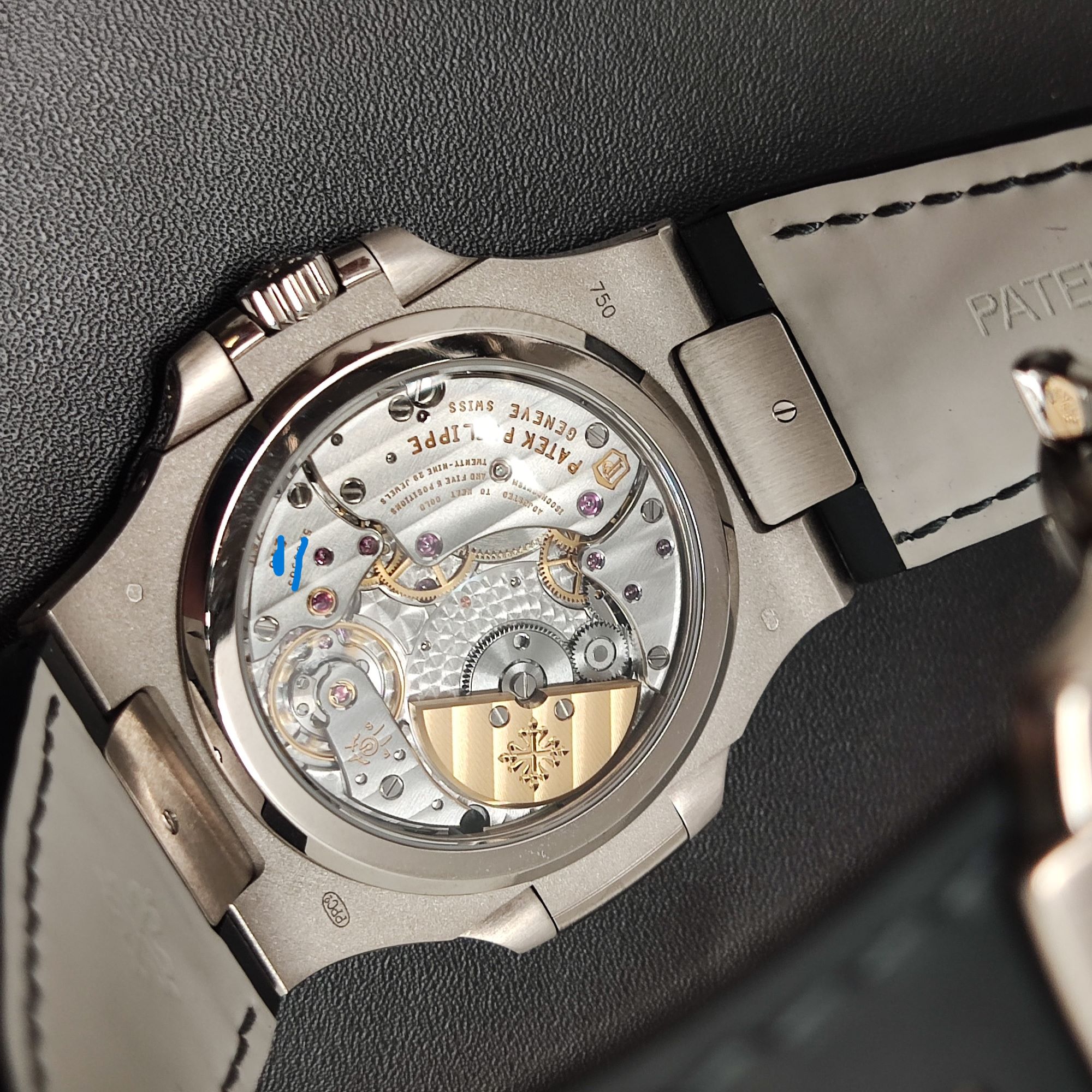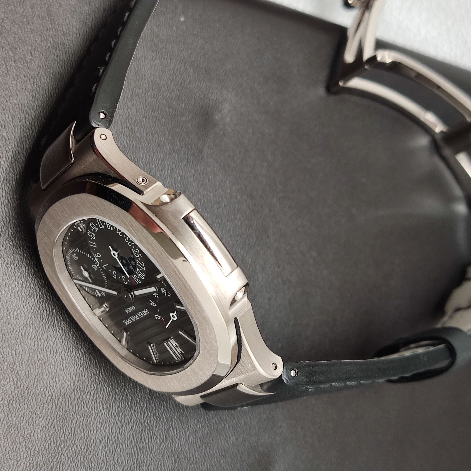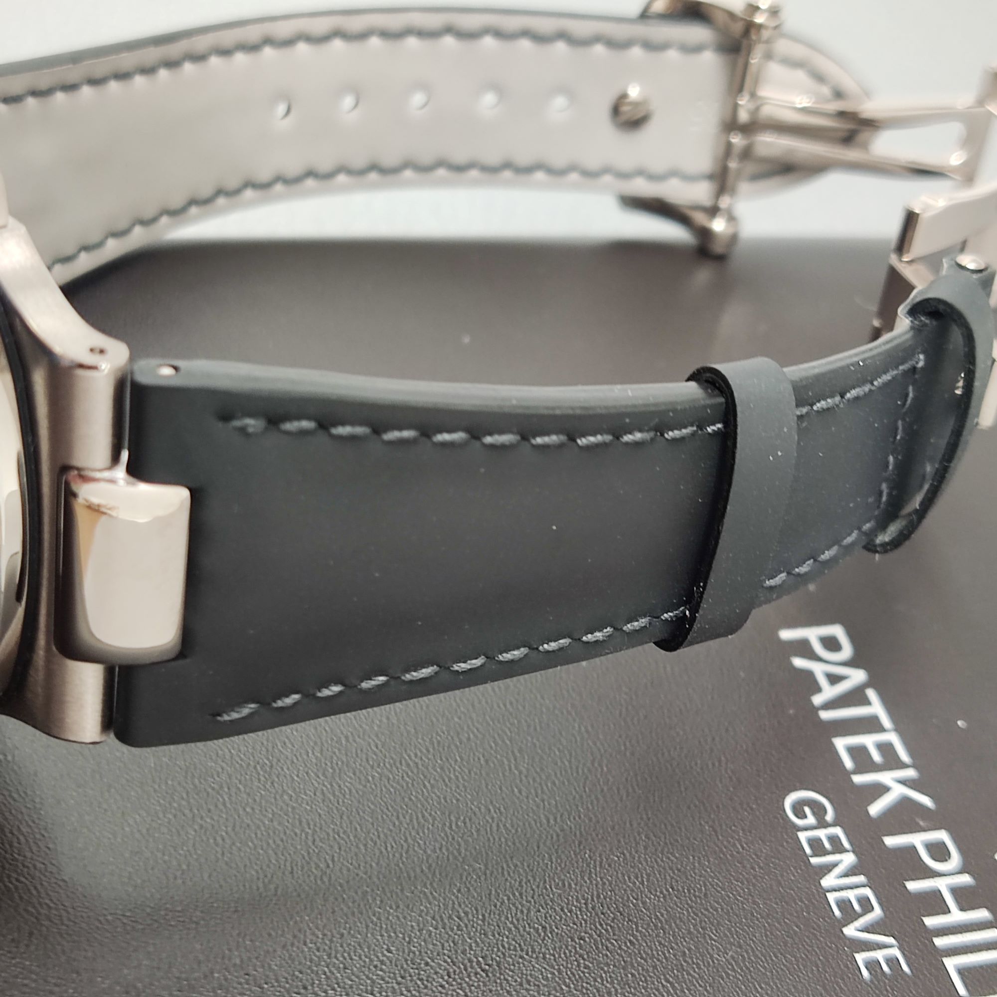 StrapBlack leather strap, signed Patek Philippe Geneve, triple folding clasp in 18k white gold signed Nautilus