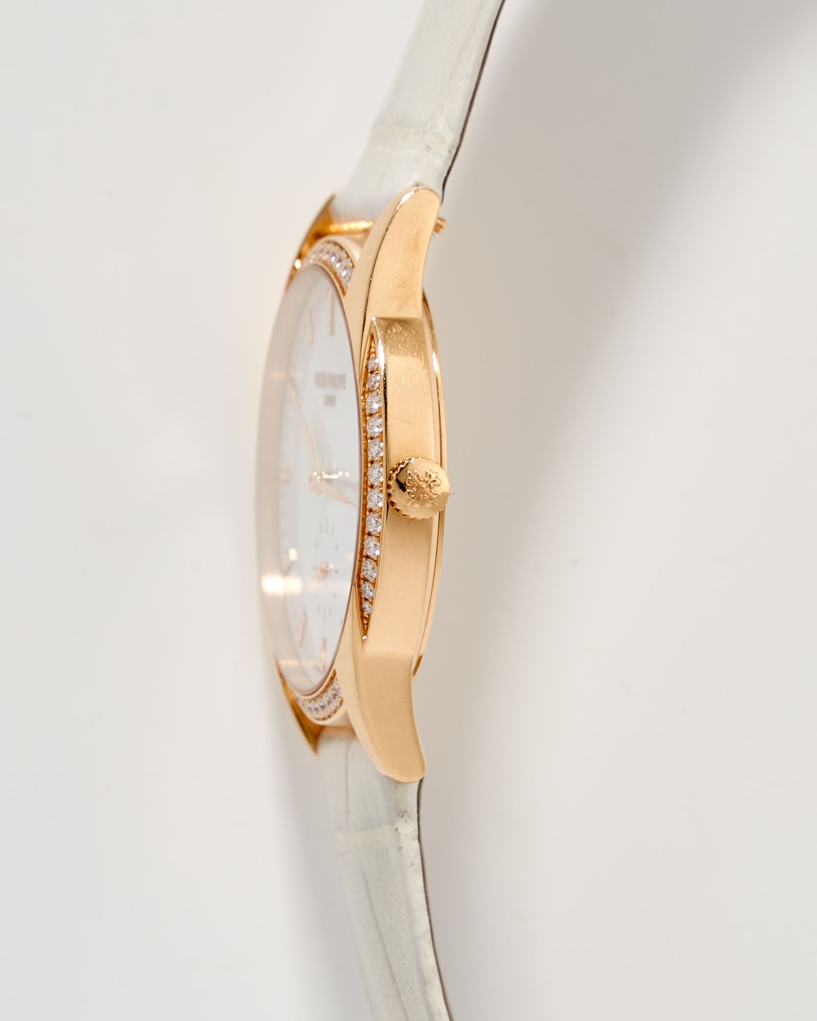 CaseRound case in 18k rose gold, polished, fixed bezel in 18k rose gold, diamond-set, snap-on exhibition caseback, winding crown at 3 o’clock with Calatrava cross embossed