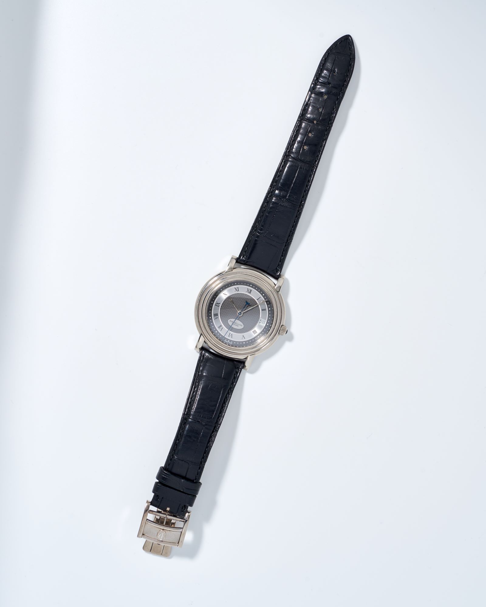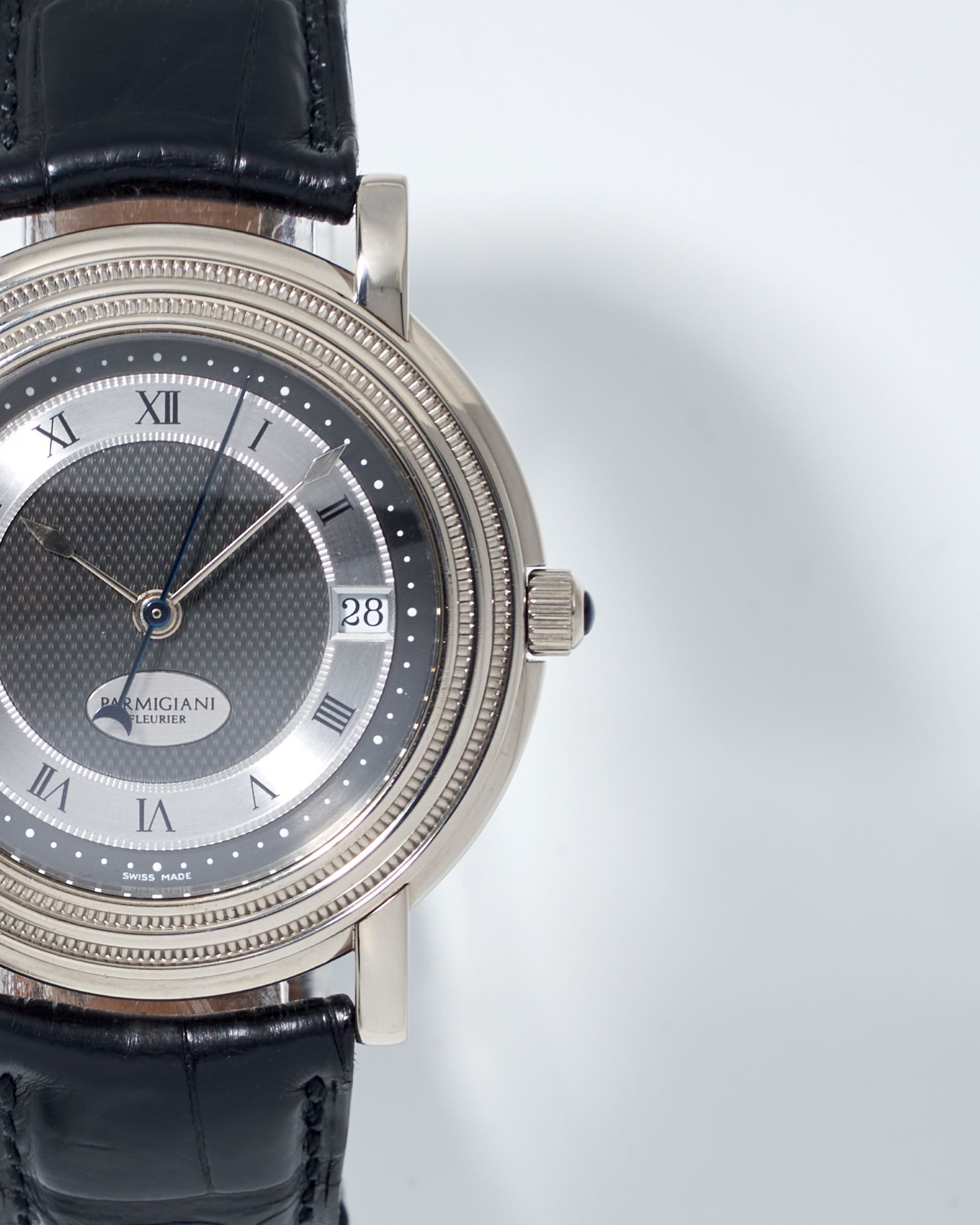 DialTwo-colored black and silver-plated dial with ‘grain d’orge’ guilloche pattern and ‘filet sauté’ guilloche outlines, signed Parmigiani Fleurier on applied oval cartouche at 6 o’clock, ‘Parmigiani lancet’ hour and minute hands, blued sweep seconds hand with crescent moon counterweight, black Roman numerals, date in aperture at 3 o’clock
