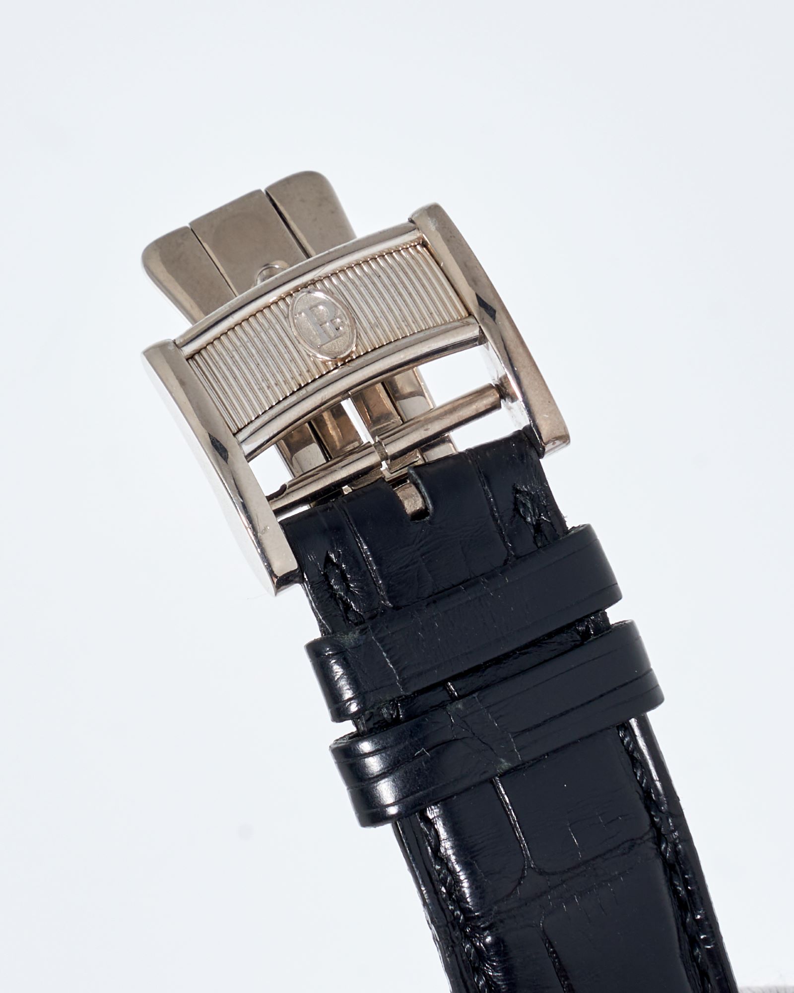 StrapBlack alligator strap, pin buckle in 18k white gold with knurled decoration, signed ‘PF’