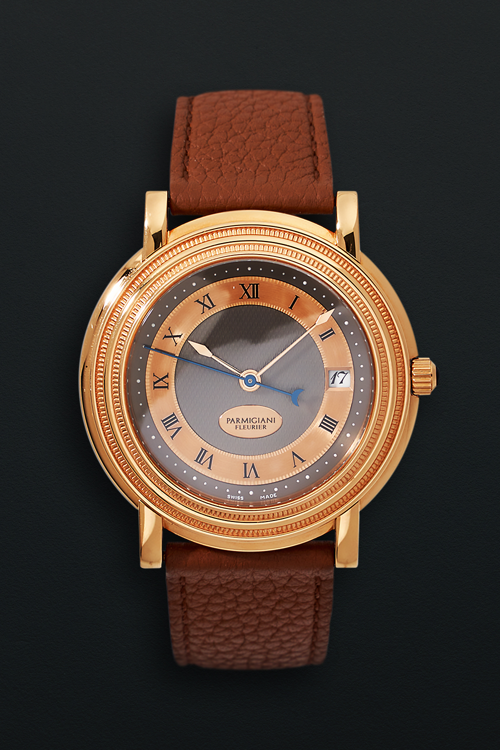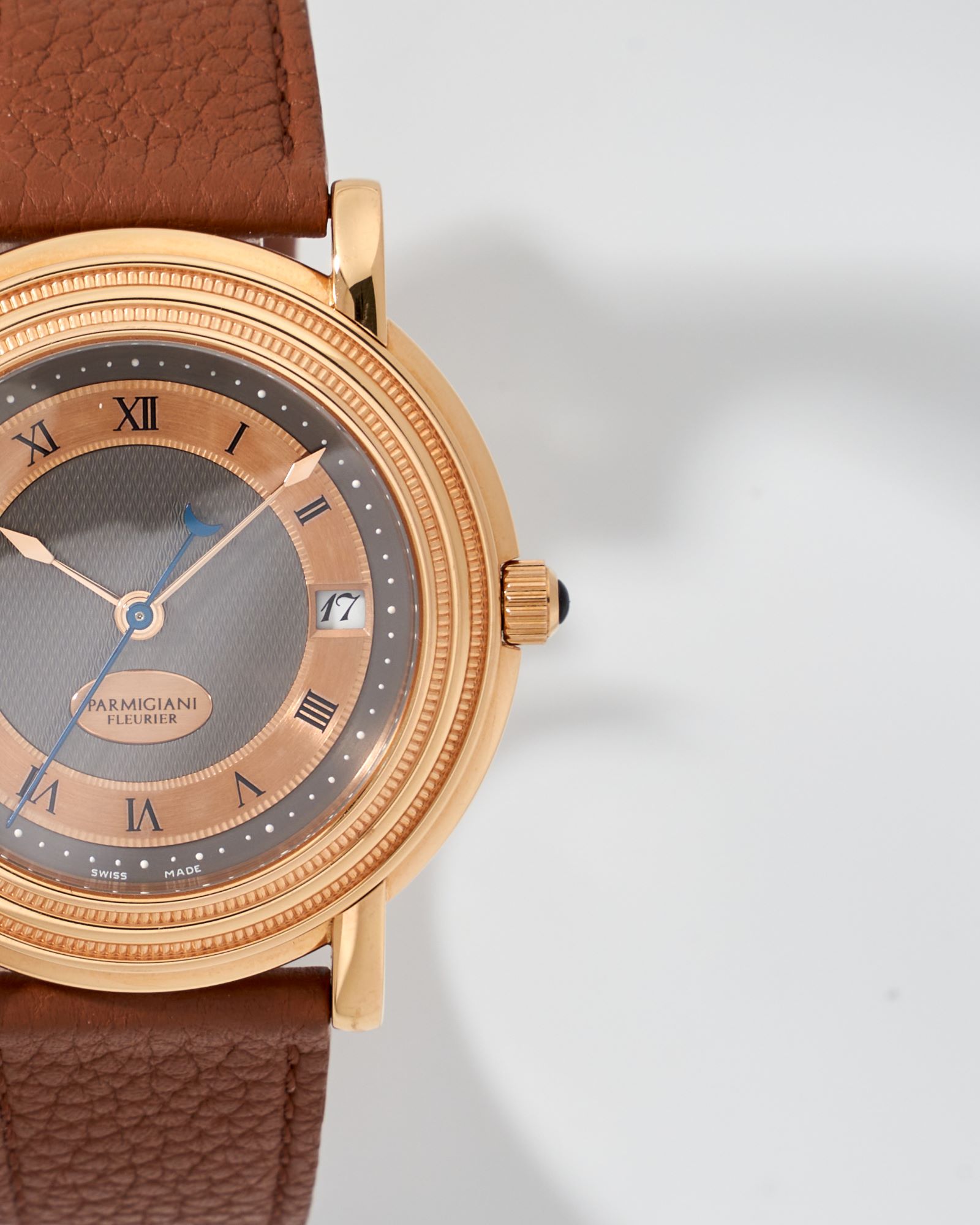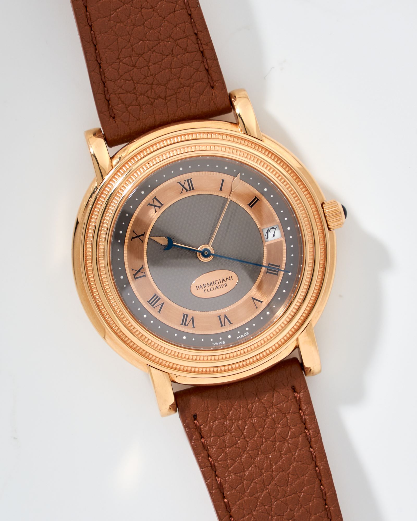 DialTwo-colored rose gold colored and slate grey dial with ‘grain d’orge’ guilloche pattern and ‘filet sauté’ guilloche outlines, signed Parmigiani Fleurier on applied oval cartouche at 6 o’clock, ‘Parmigiani lancet’ hour and minute hands, blued sweep seconds hand with crescent moon counterweight, black Roman numerals, date in aperture at 3 o’clock