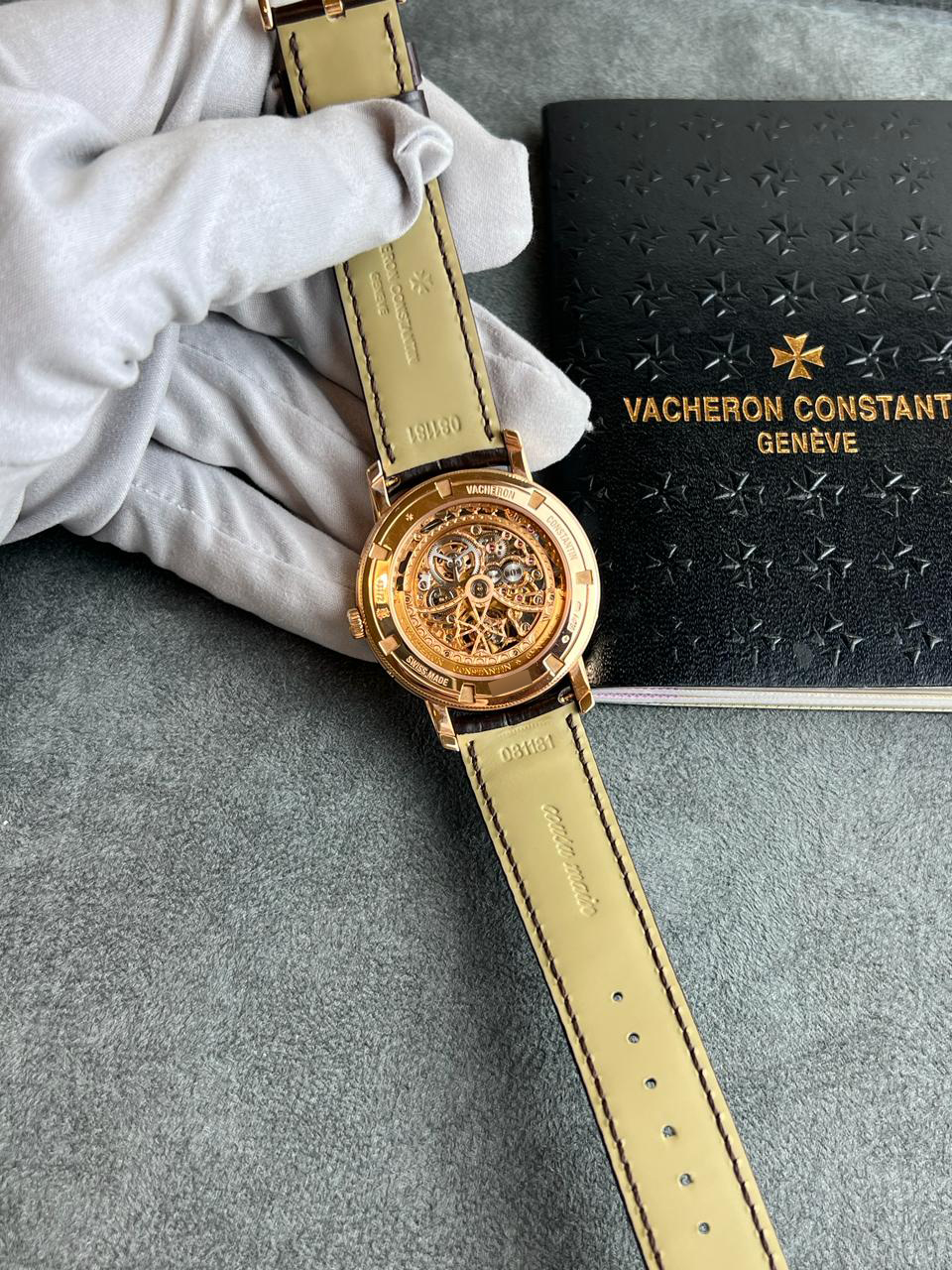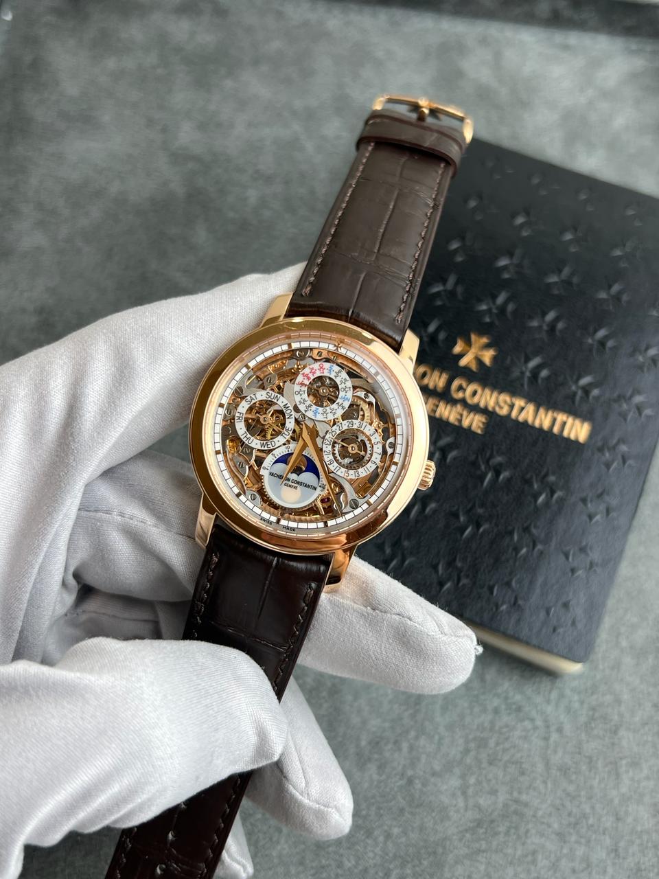 MovementSelf-winding ultra-thin mechanical movement, with Geneva Seal quality hallmark, rose gold plated, skeletonized and hand-engraved bridges and mainplate, rose gold plated, skeletonized and hand-engraved rotor with Maltese cross and solid-gold heavy segment engraved ‘Vacheron Constantin Geneve’, functions: hours, minutes, moonphase, perpetual calendar with date, day of the week, month and leap year
