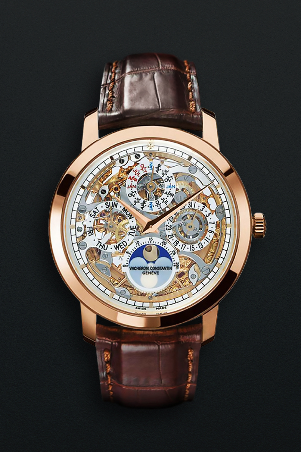 DialOpen-worked dial, signed by Vacheron Constantin Geneve, rose gold ‘Dauphine’ hour and minute hands, outer ring with minute track with applied Maltese cross at 12 o’clock, sub-dials for day of the week at 9 o’clock, date at 3 o’clock, month and leap year in 48-month cycle at 12 o’clock, moonphase at 6 o’clock