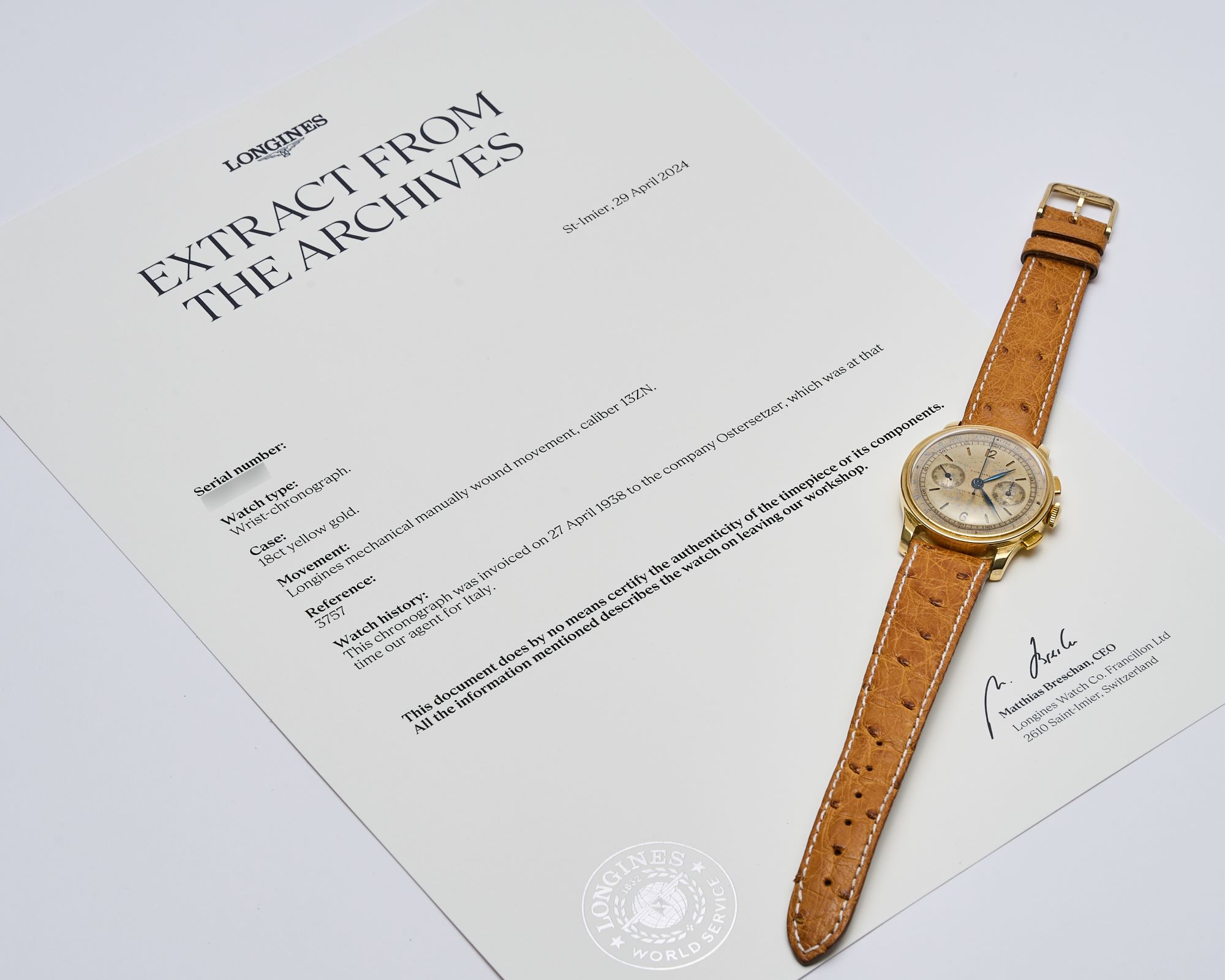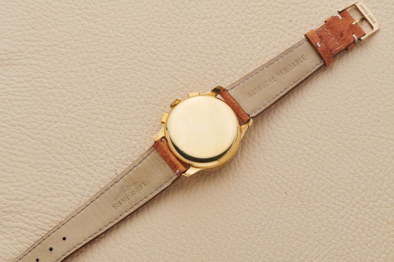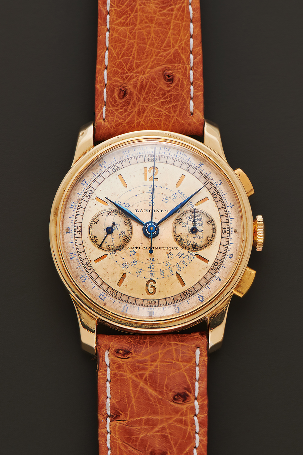 DialSandwich style with small seconds on the sub-dial at 9 o'clock and minute chronograph counter on the sub-dial at 3 o'clock, blue tachymeter in the centre of the dial, blue telemeter on the outer ring, signed Longines and Anti Magnetique, black chronograph seconds ring on the outside, spider pattern