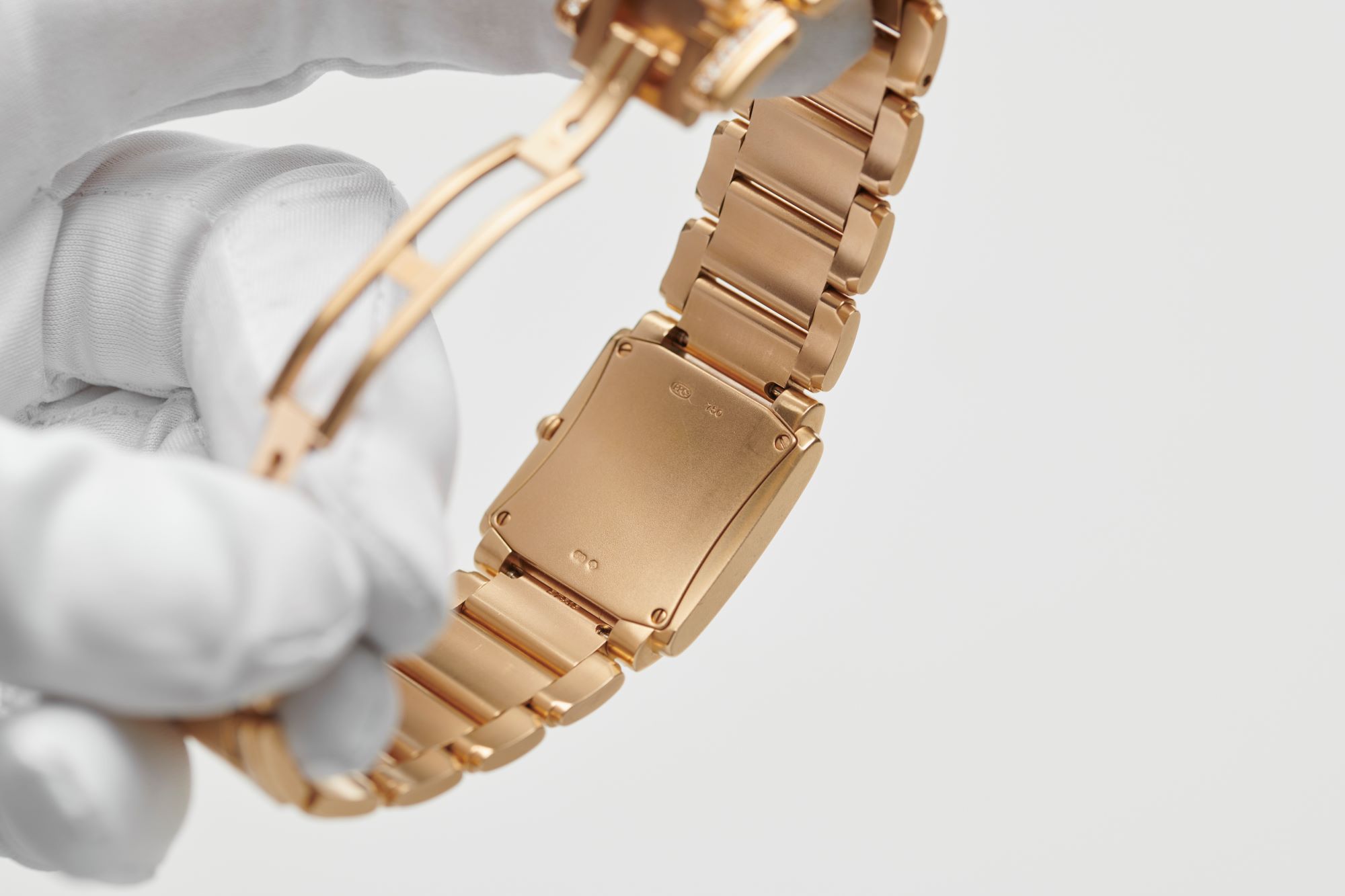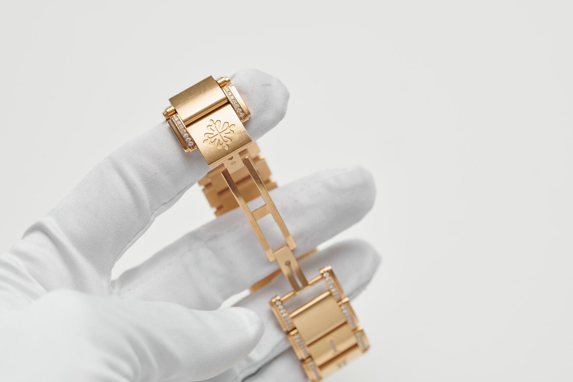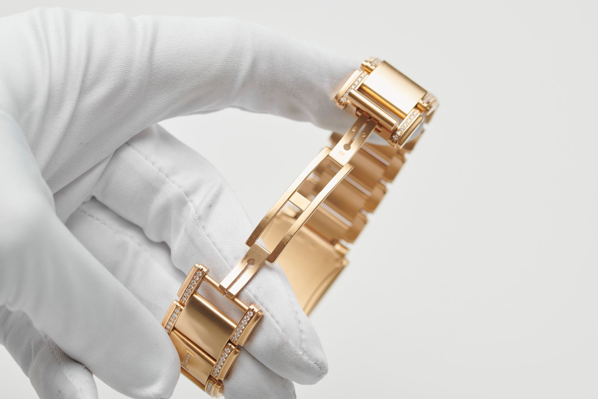 Case18K rectangular yellow-gold sand-blasted case with a 18k solid yellow gold case with applied brilliant cut diamonds
