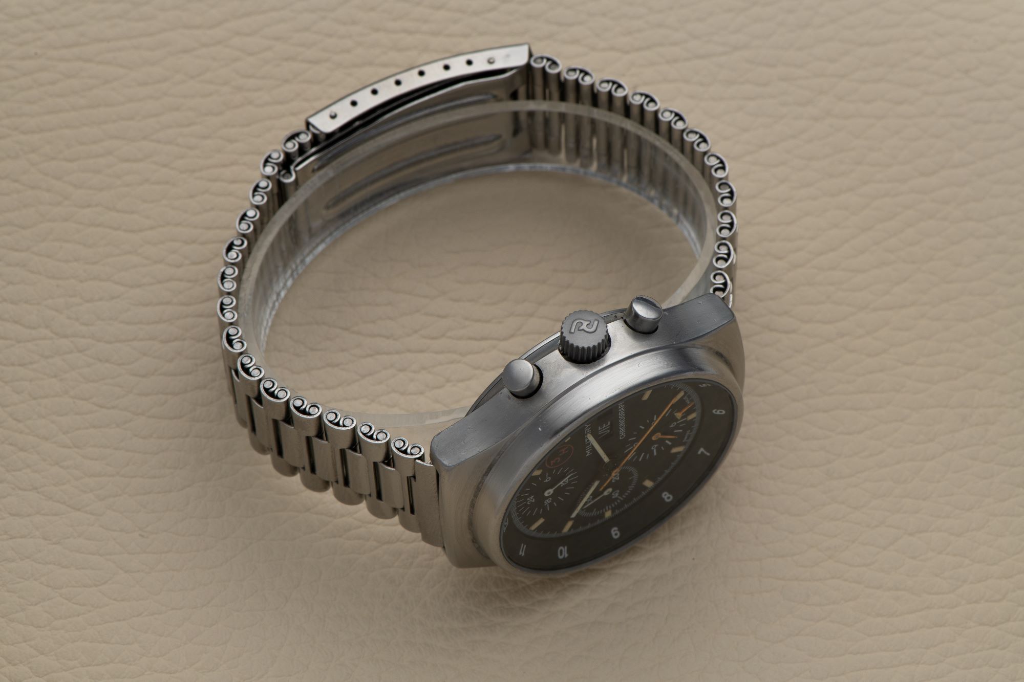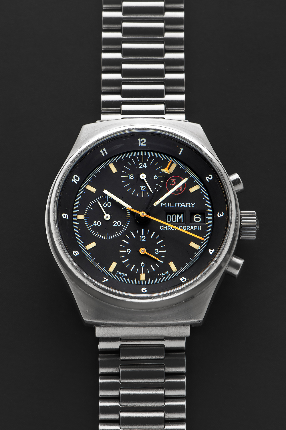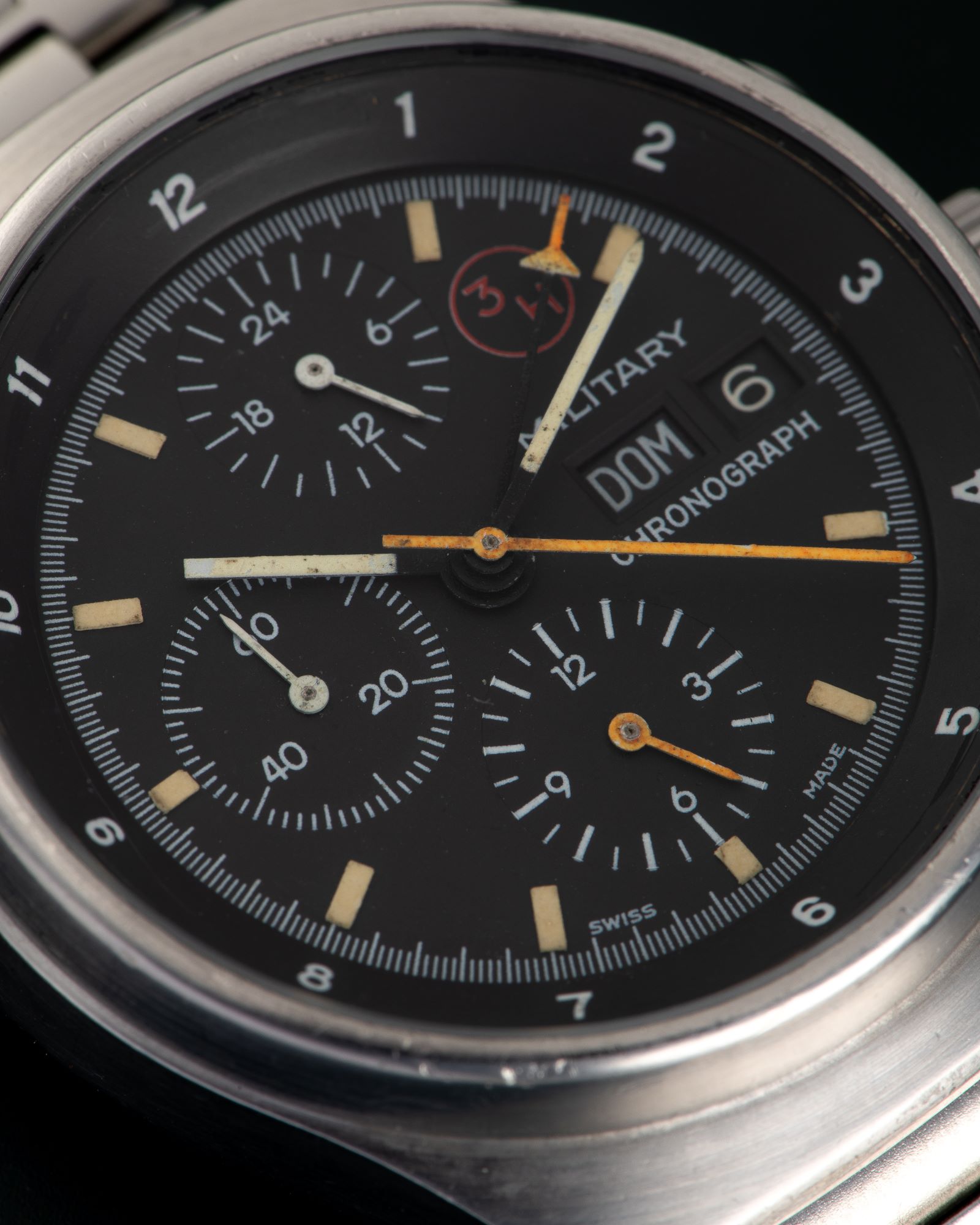 DialBlack dial signed ‘Military Chronograph’, 3H symbol between 1 and 2 o’clock, black and white ‘stick and obelisk’ hour and minute hands, luminous, rectangular luminous indexes, central seconds chrono hand, orange, patinated, central chrono minute counter black hand with orange ‘airplane’ arrowhead, patinated, 12-hour chrono counter at 6 o’clock, small seconds at 9 o’clock, 24-hour indicator at 12 o’clock, date and day of the week apertures at 3 o’clock, outer black inclined chapter ring with Arabic numerals