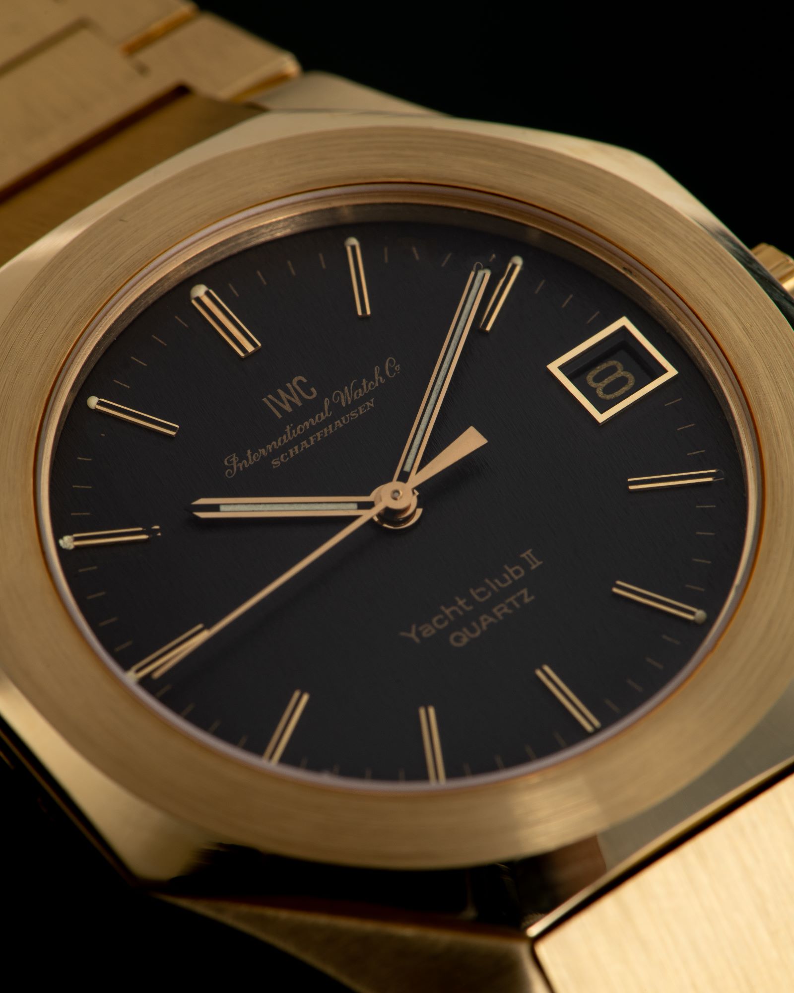 DialBlack vertically textured ‘sigma’ dial, signed ‘IWC International Watch Co. Schaffhausen’, applied ‘stick’ hour indexes accompanied by luminous dots, ‘obelisk’ hour and minute hands, luminous, ‘stick’ sweep seconds hand, date aperture at 3 o’clock; original Tritium, Zeiger: original, Tritium