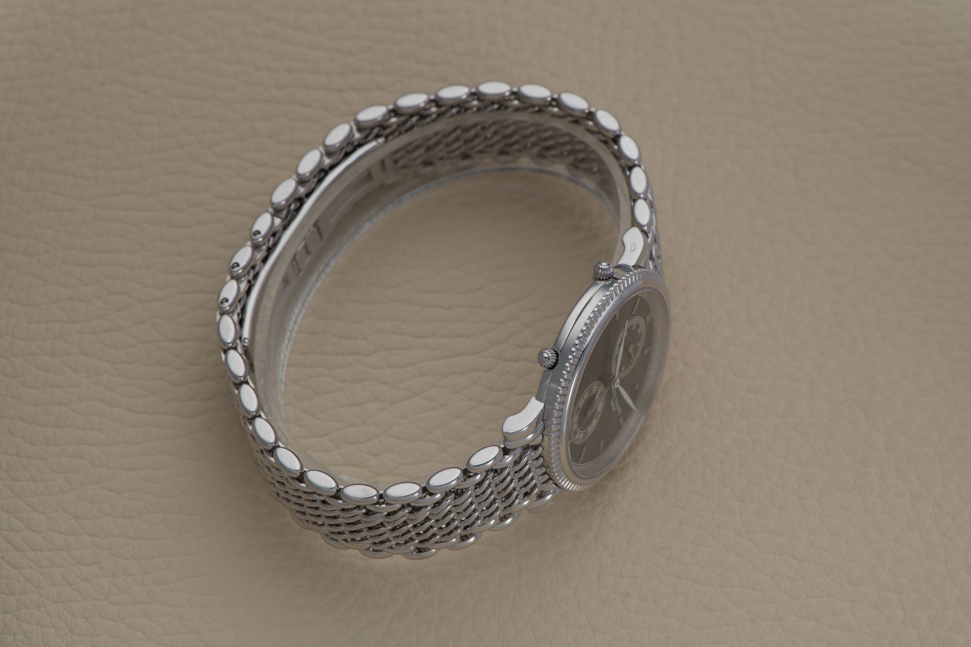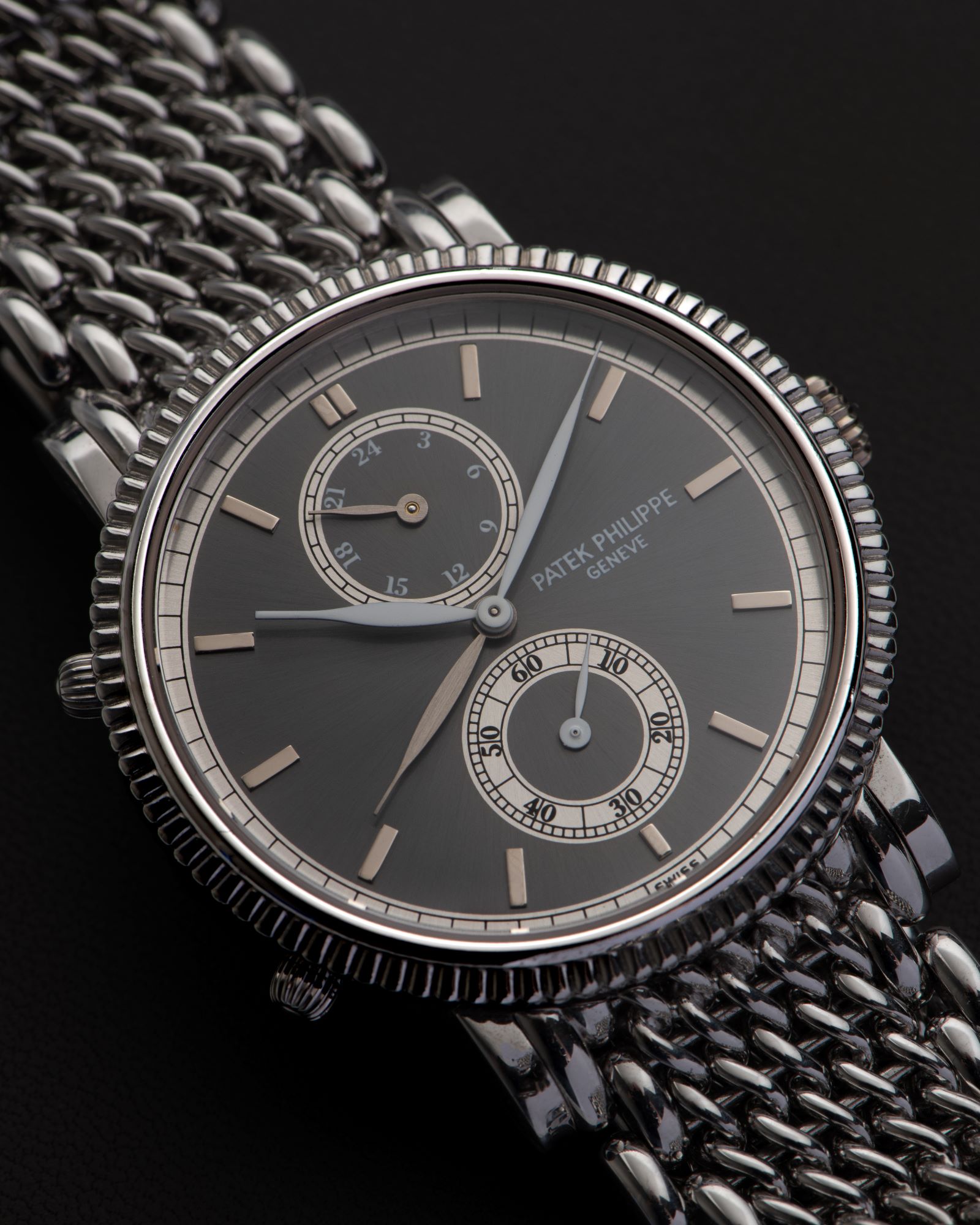 DialSunburst dark grey dial, signed Patek Philippe Geneve, light grey ‘leaf’ hour and minute hands, applied rectangular indexes in white gold, brushed ‘leaf’ home time hour hand, date, 24-hour day/night indication at 12 o’clock for local time, small seconds at 6 o’clock, outer ‘railway’ minute track