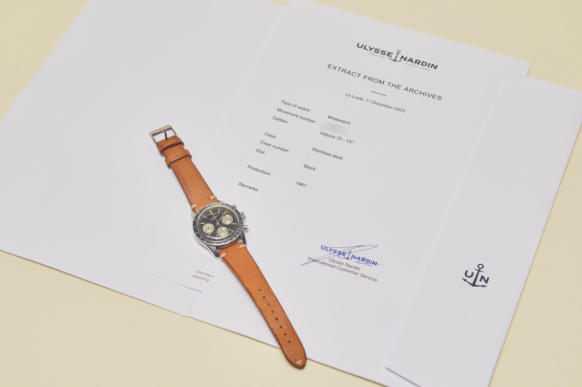 CaseRound case in stainless steel, fixed bezel in stainless steel with tachymeter scale engraved (60 to 500 Units per hour), screwed solid stainless steel caseback, winding crown at 3 o’clock with embossed Ulysse Nardin ancre, ‘pump’ chronograph buttons at 2 and 4 o’clock