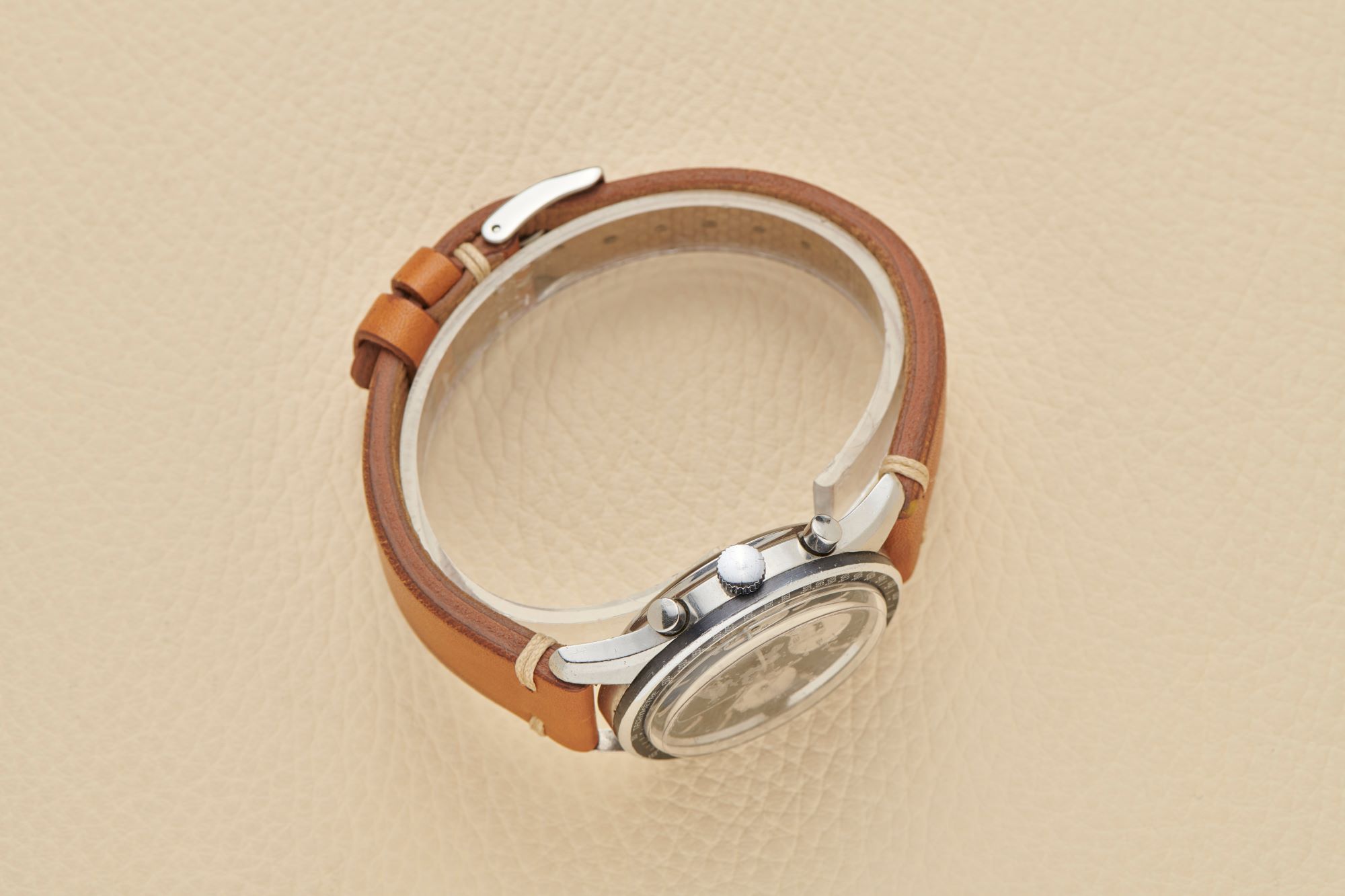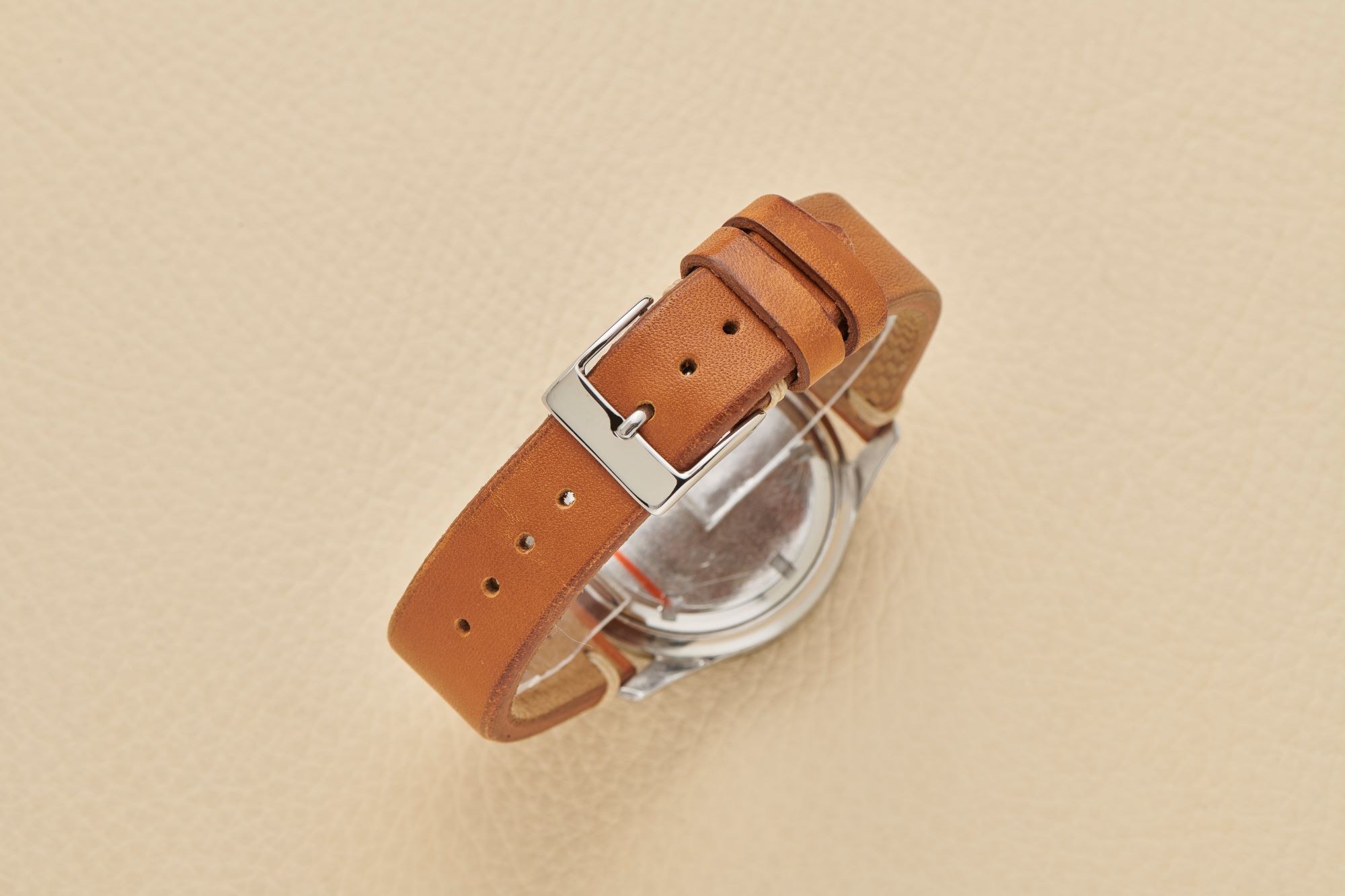 BraceletBrown leather strap with stainless steel buckle, unsigned