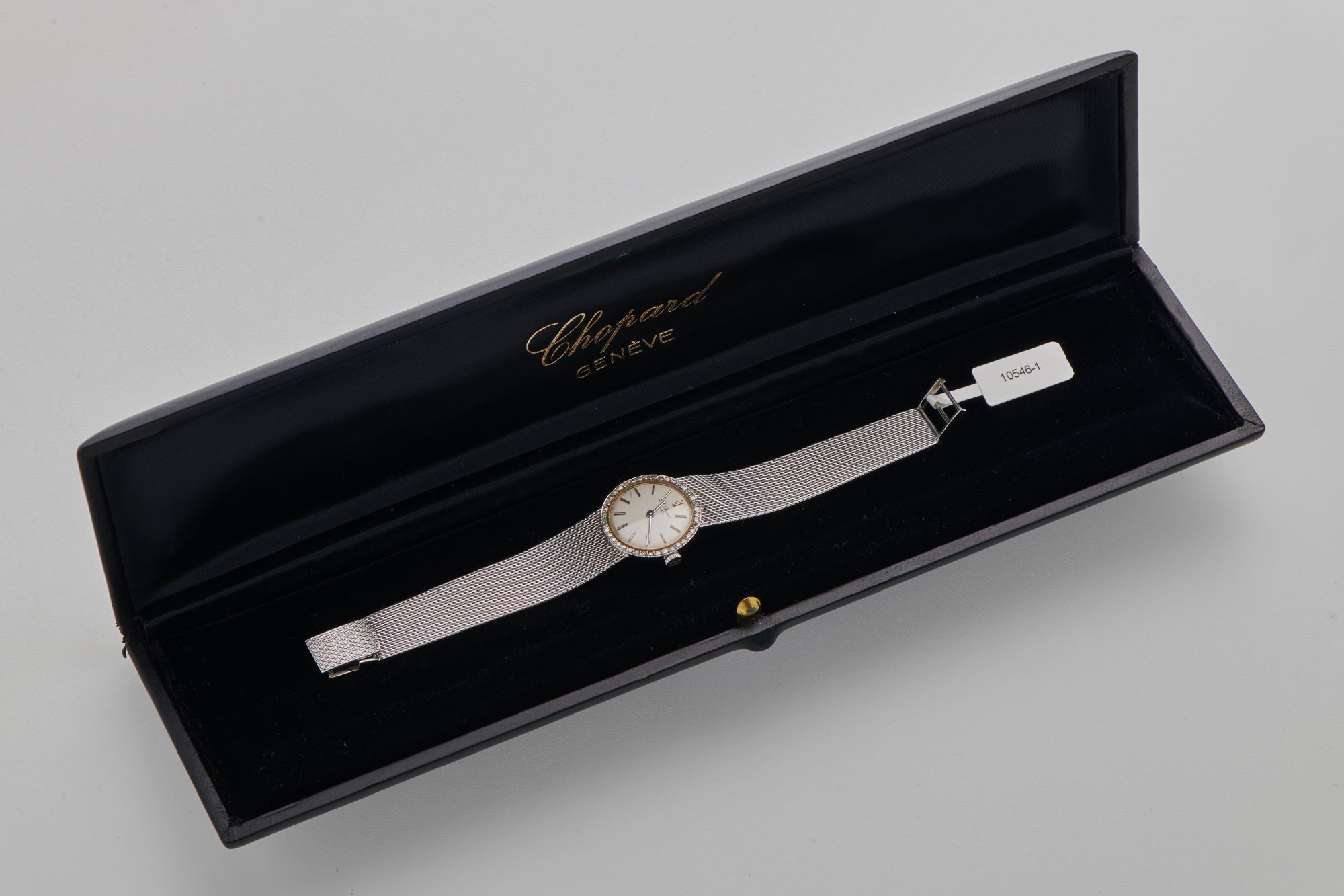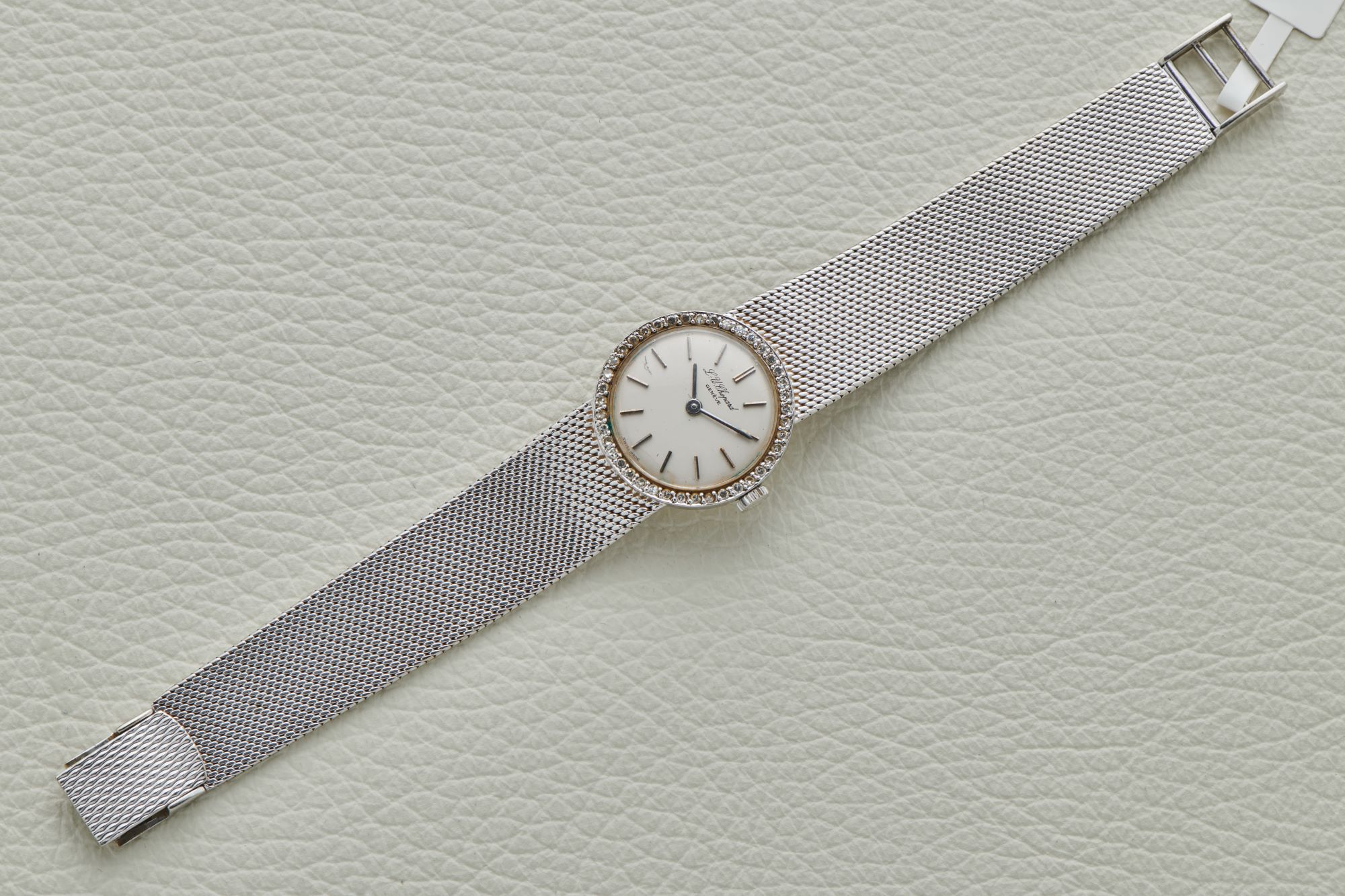 CaseRound case in 18k white gold, winding crown at 3 o'clock, signed 'L.U.C', diamond-set bezel