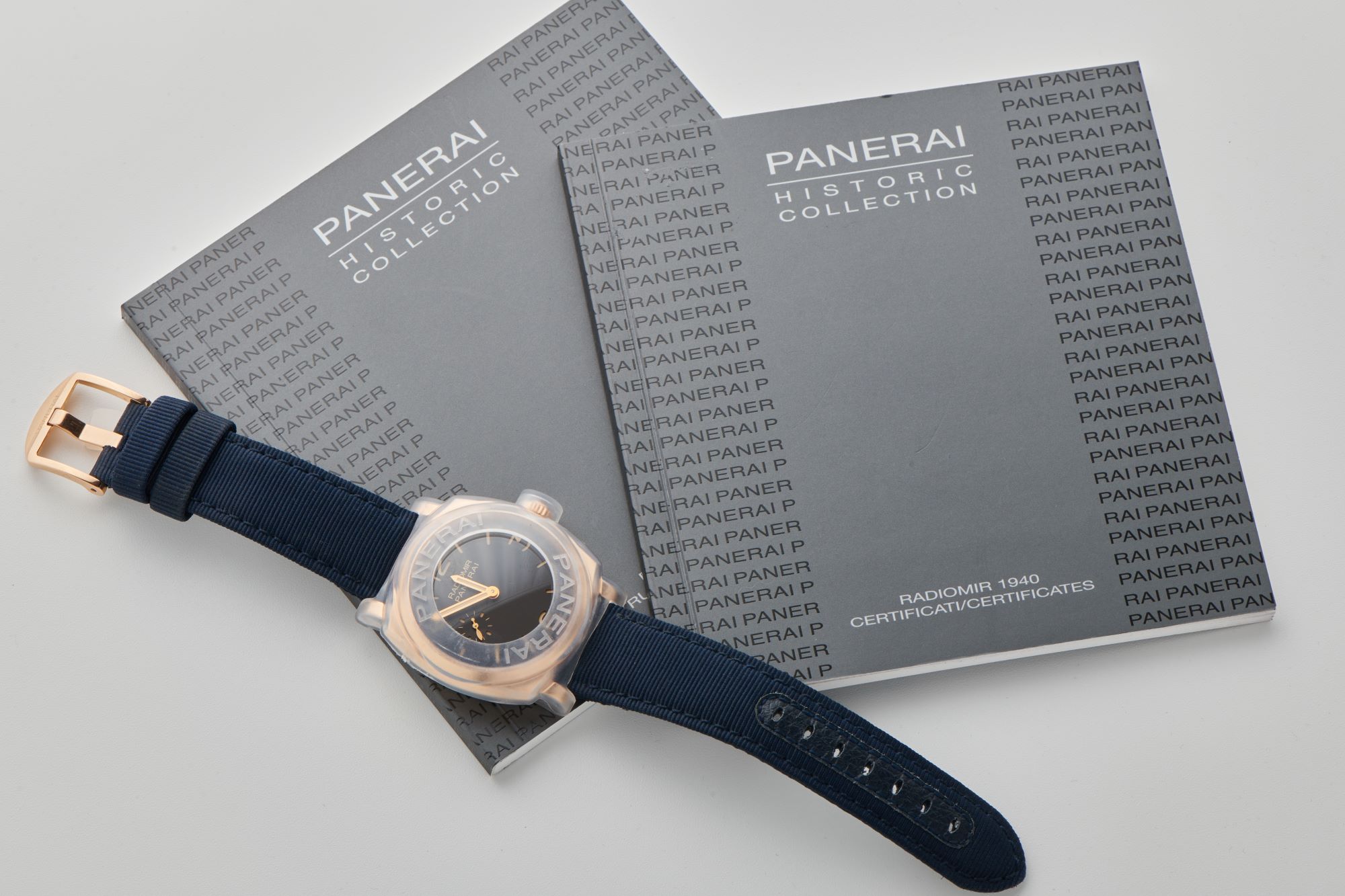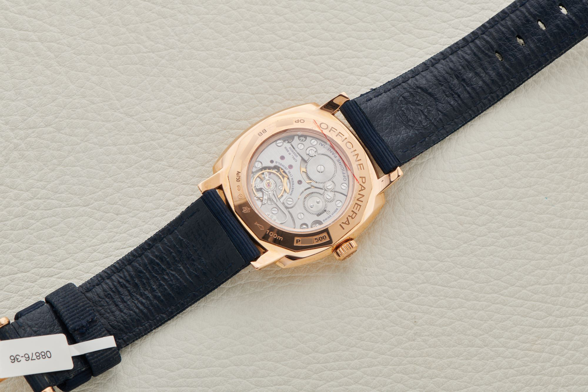 CaseCushion-shaped case in polished 18k rose gold, fixed polished bezel in 18k rose gold, screw-down winding crown at 3 o'clock with embossed Panerai "double arrow" logo
