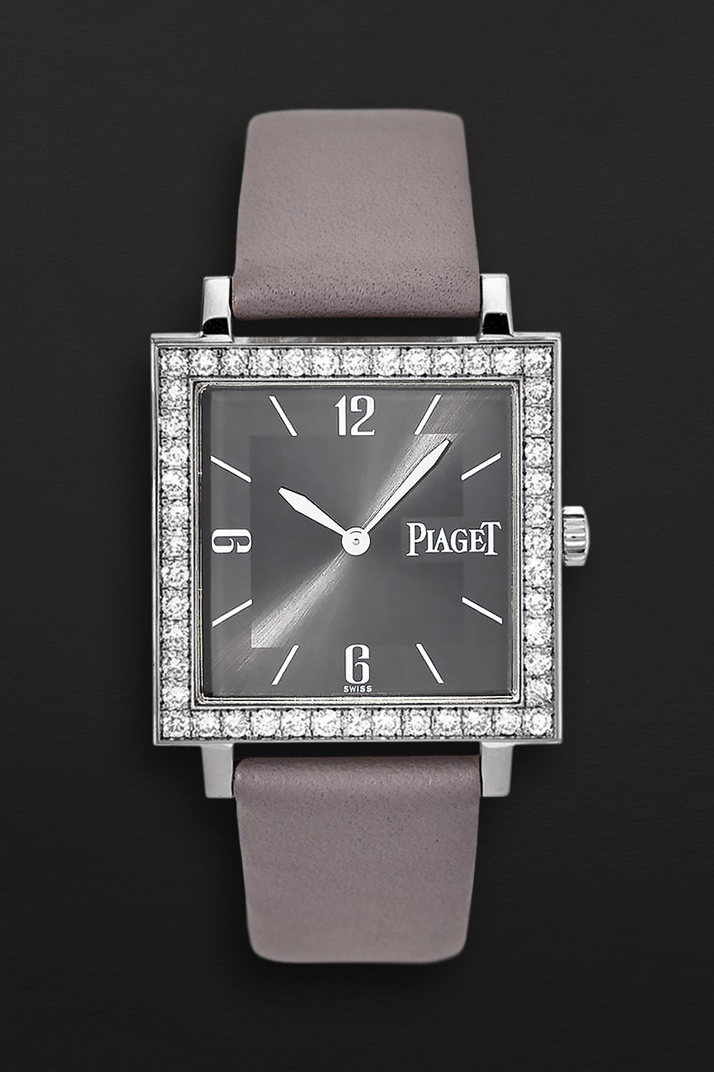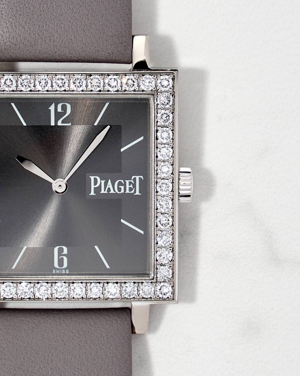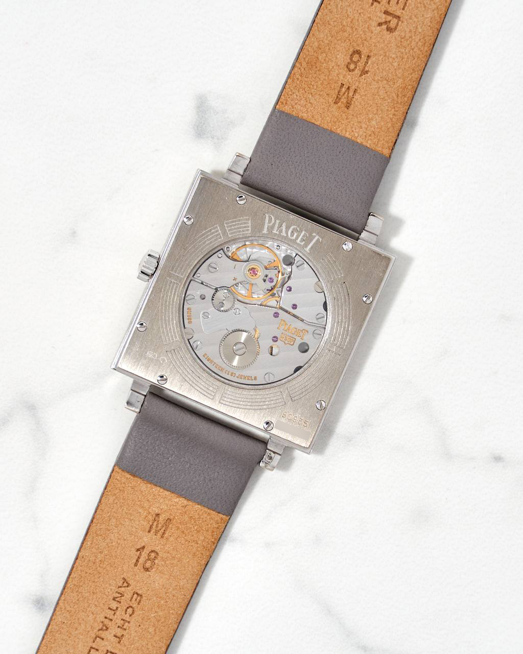 CaseSlim square case in 18k white gold, polished, fixed bezel in 18k white gold, diamond-set, exhibition caseback fixed on 8 screws, brushed and polished, with Piaget logo and grid pattern engraved, reference and case number stamped, winding crown at 3 o’clock with ‘P’ logo in relief