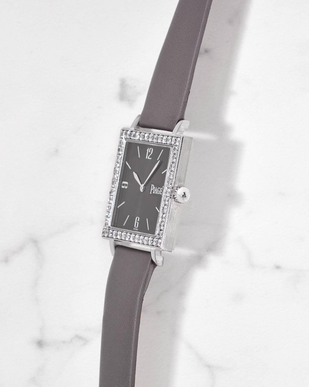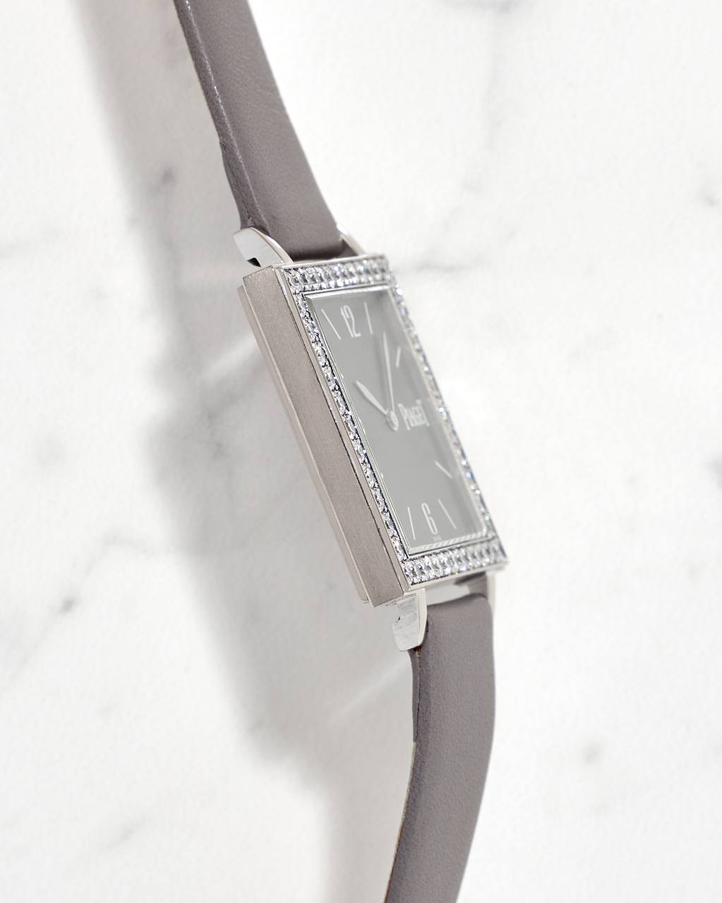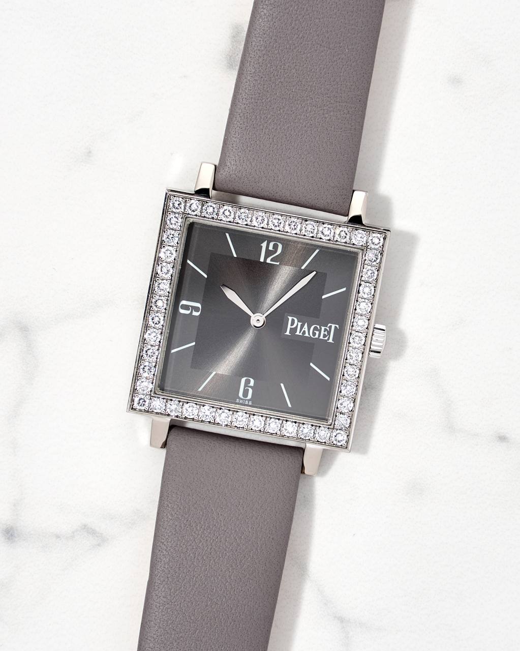 CaseSlim square case in 18k white gold, polished, fixed bezel in 18k white gold, diamond-set, exhibition caseback fixed on 8 screws, brushed and polished, with Piaget logo and grid pattern engraved, reference and case number stamped, winding crown at 3 o’clock with ‘P’ logo in relief