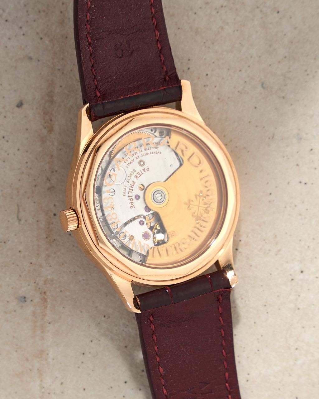 CaseSlim round case in 18k rose gold, polished, fixed bezel in 18k rose gold, polished, screw-down exhibition caseback, polished, with crystal marked ‘1843 Garrard 1993 Anniversary’, winding crown at 3 o’clock with Calatrava cross embossed