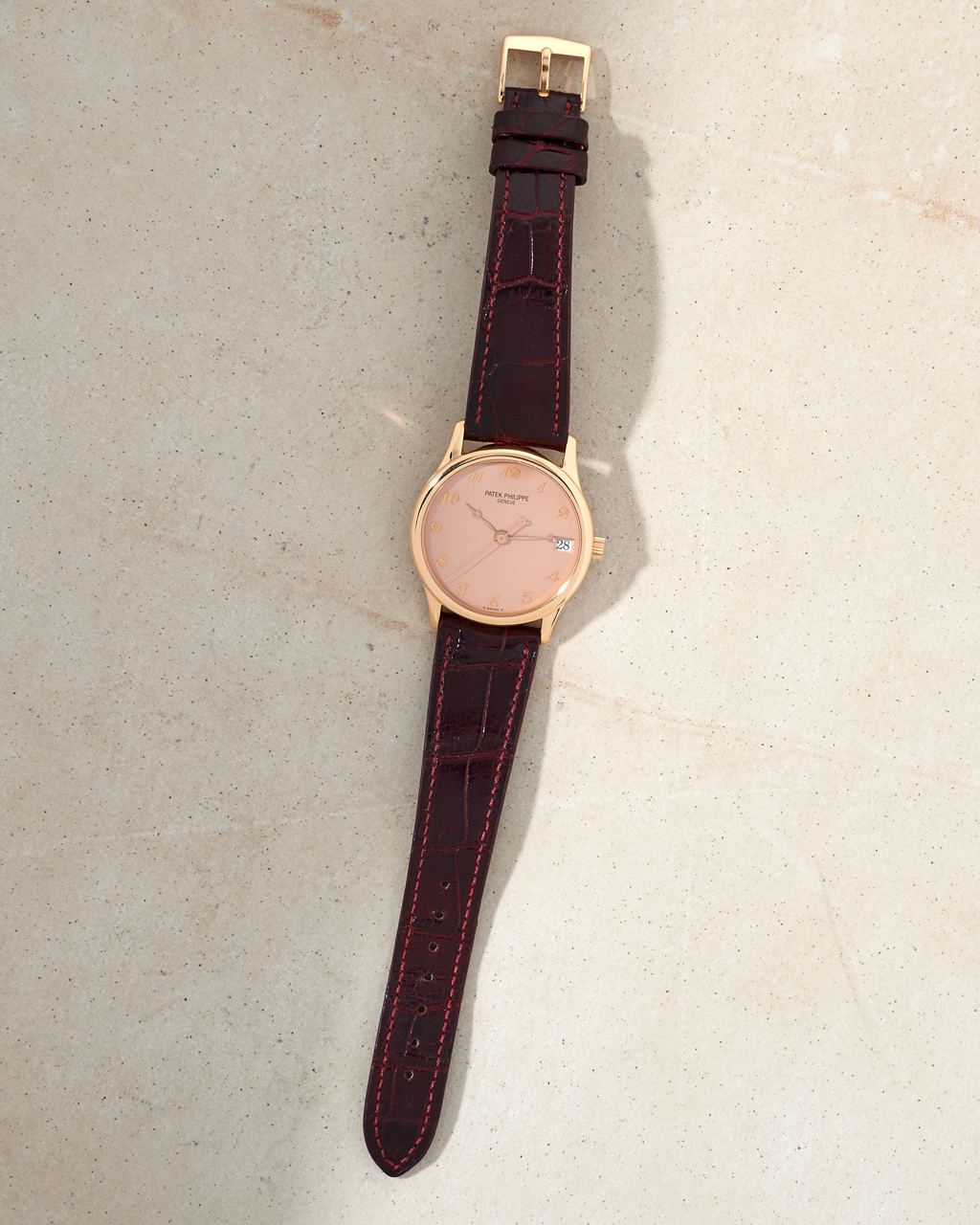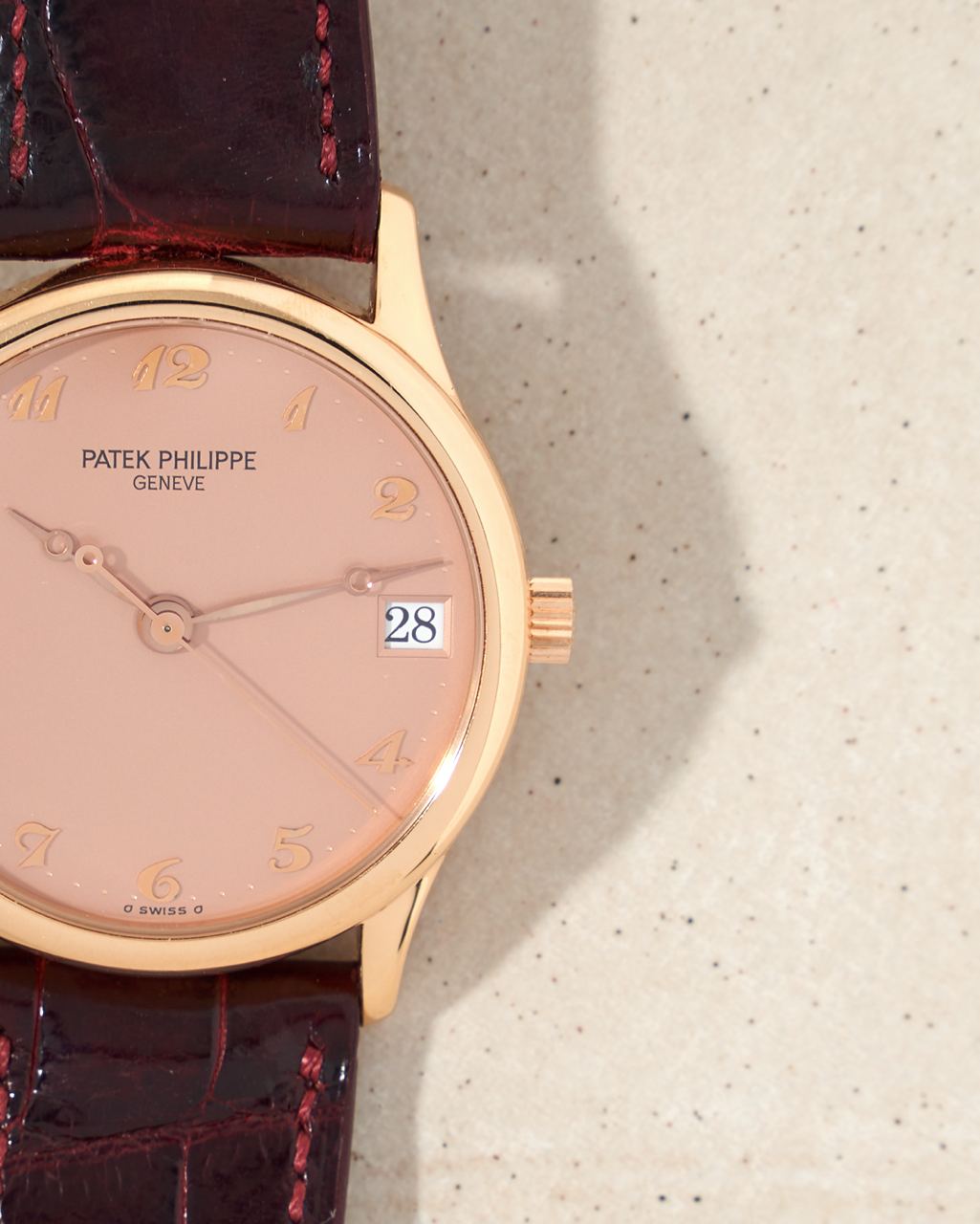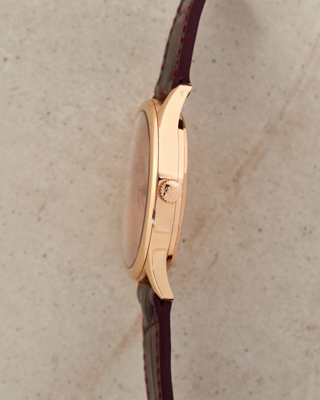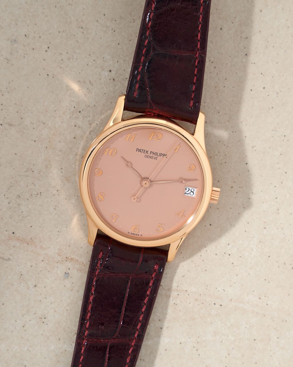 DialCopper-toned ‘salmon sigma’ dial, signed ‘Patek Philippe Geneve’, applied rose gold Breguet Arabic numerals, rose gold ‘pomme Breguet’ hour and minute hands, central seconds hand with ring-shaped counterweight, outer ‘pearled’ minute track, date in aperture at 3 o’clock