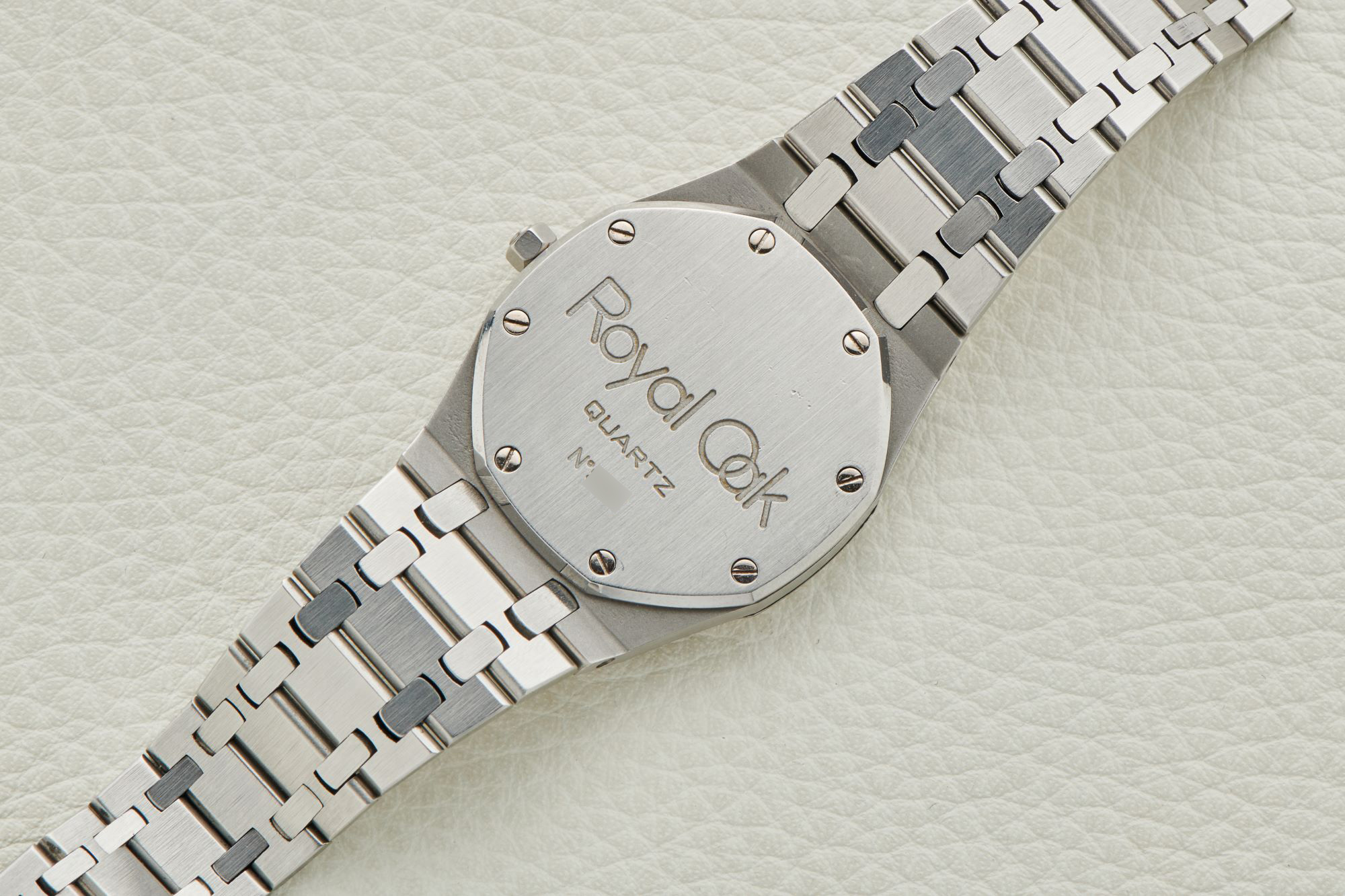 CaseOctagonal case in stainless steel, brushed with polished chamfers, closed stainless steel caseback fixed by eight screws, engraved with 'Royal Oak Quartz No.***', hexagonal crown at 3 o' clock