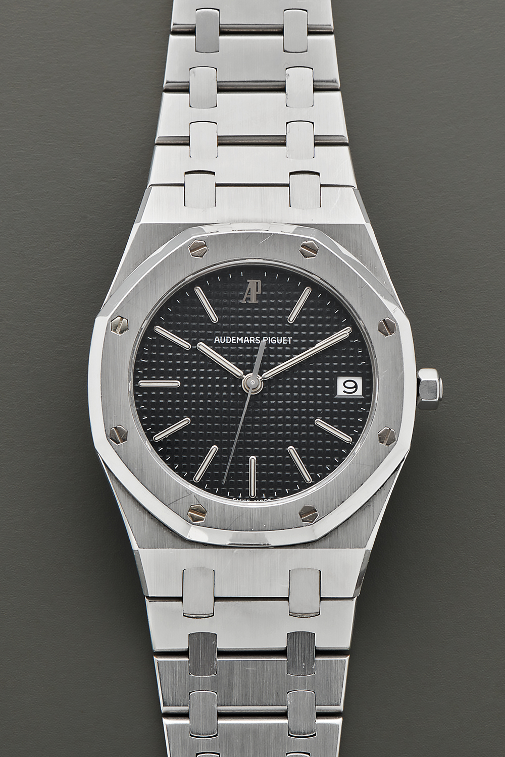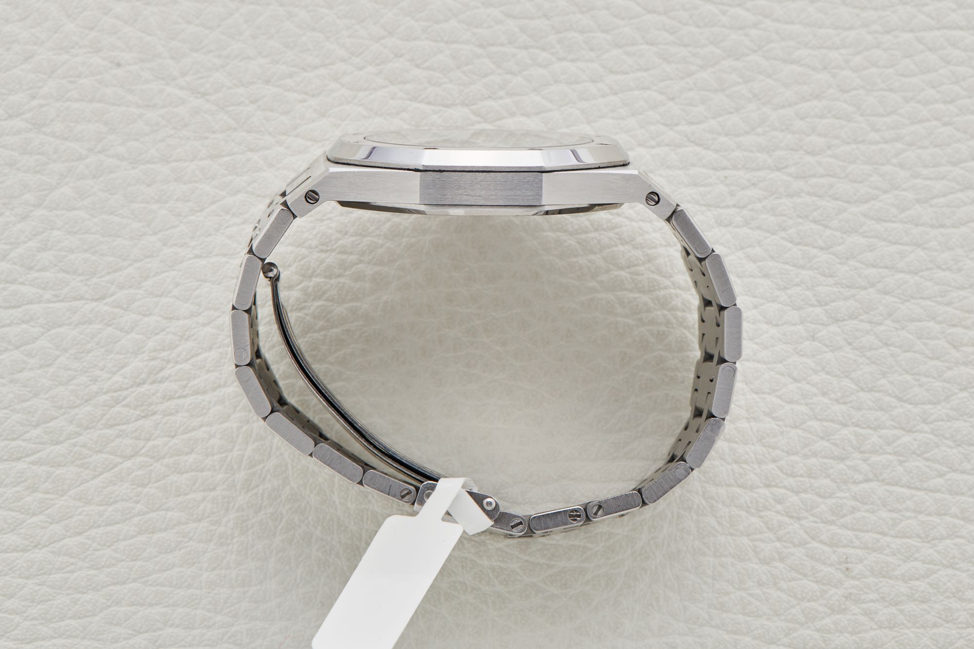 DialGrey dial with small tapisserie relief pattern, applied 'AP' logo and printed 'Audemars Piguet' at 12 o'clock, applied and luminous baguette indices, Royal Oak hour, minute, and seconds hand, date window at 3 o'clock.