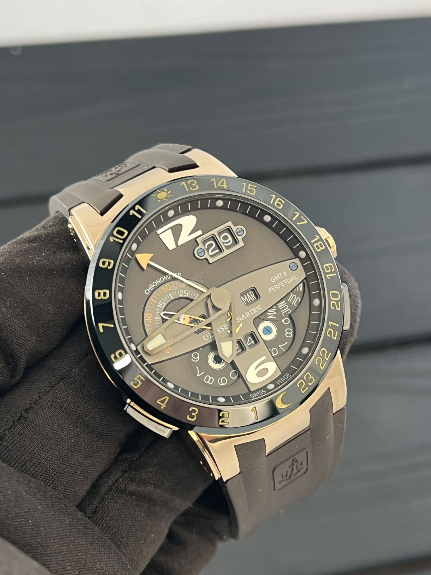 DialBlack coated vertical Cotes de Geneve dial with grey applied part, signed by Ulysse Nardin ‘anchor’ logo, wide open-worked hour and minute hands, luminous, applied 12 and 6 Arabic numerals, outer inclined rim with minute track and luminous round hour indexes, central ‘arrow’ GMT hand, double-wing open-worked small seconds hand and day of the week aperture at 9 o’clock, big date in screwed double aperture at 1 o’clock, month in aperture at 4 o’clock with visible disc, two-digit year in double aperture at 6 o’clock with visible discs