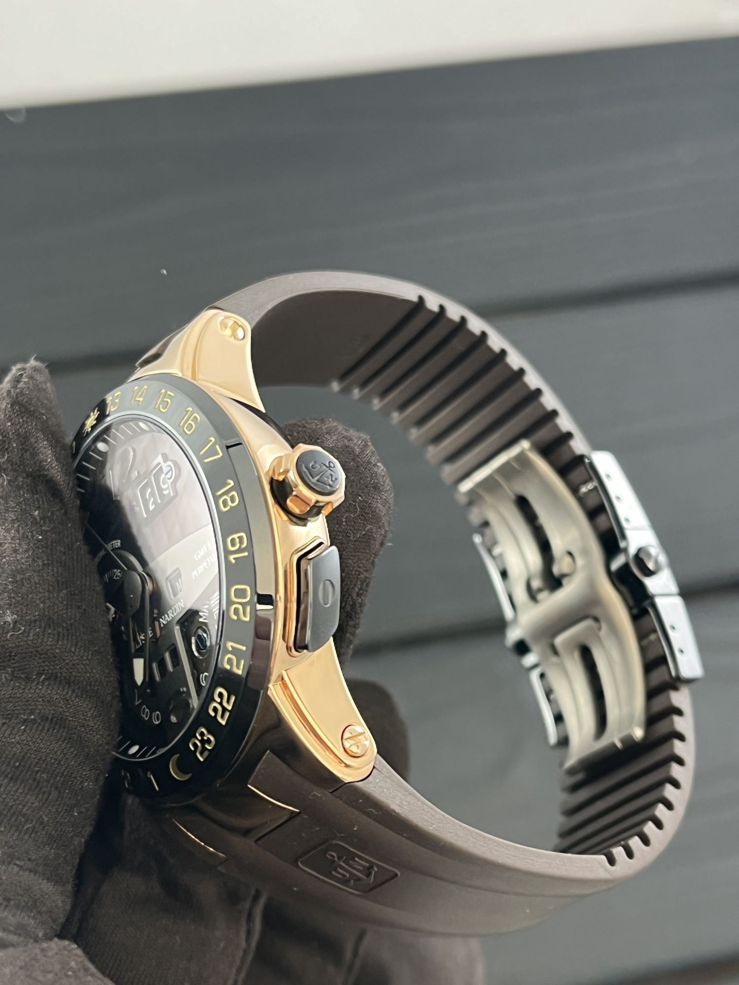 CaseRound case in 18k rose gold, polished, fixed bezel in black ceramic, polished, with engraved and yellow filled GMT 24-hour scale, exhibition caseback fixed on 6 screws, winding crown in 18k rose gold and black ceramic at 3 o’clock between protective shoulders of the case, with UN ‘anchor’ logo in relief, pushers in black ceramic to set GMT time at 4 and 8 o’clock, screwed 18k rose gold plate at 9 o’clock with serial number engraved