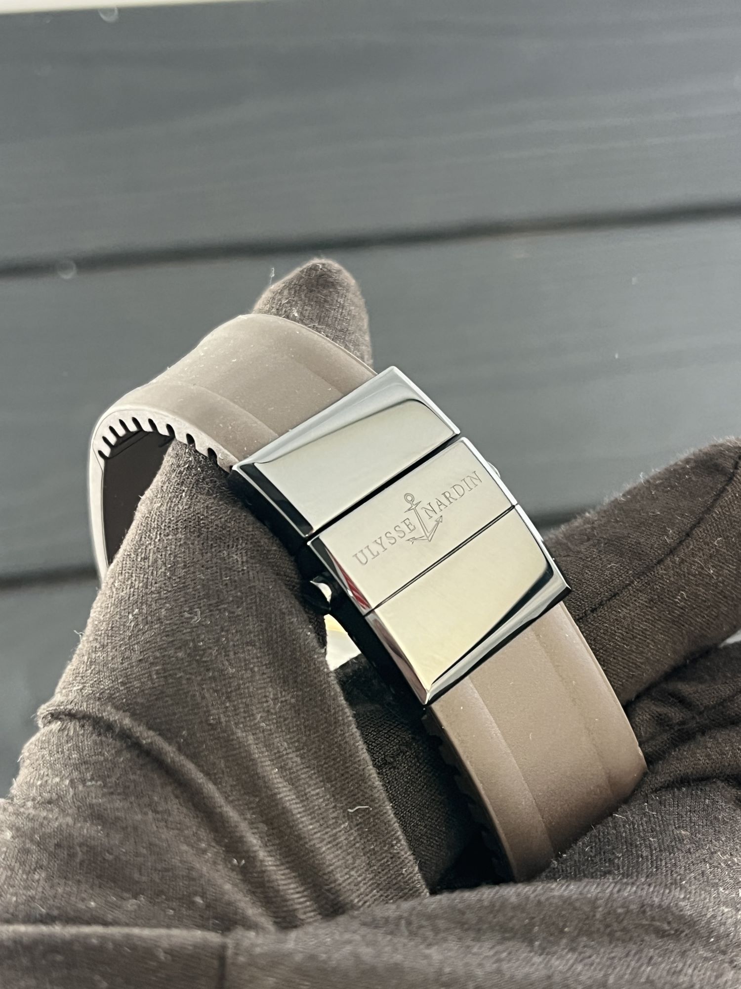 StrapSlate grey rubber strap, triple folding clasp in black ceramic signed by Ulysse Nardin ‘anchor’ logo