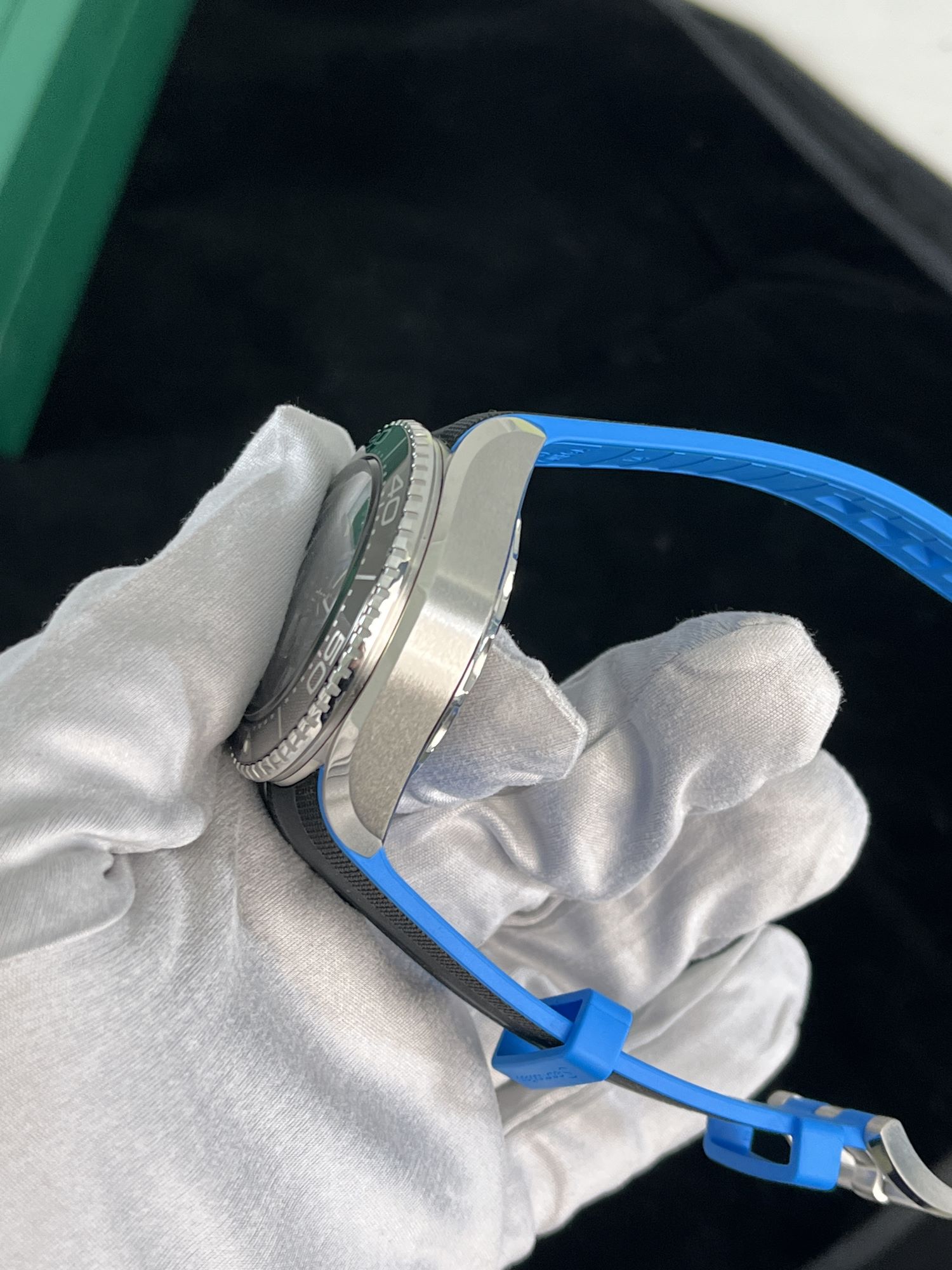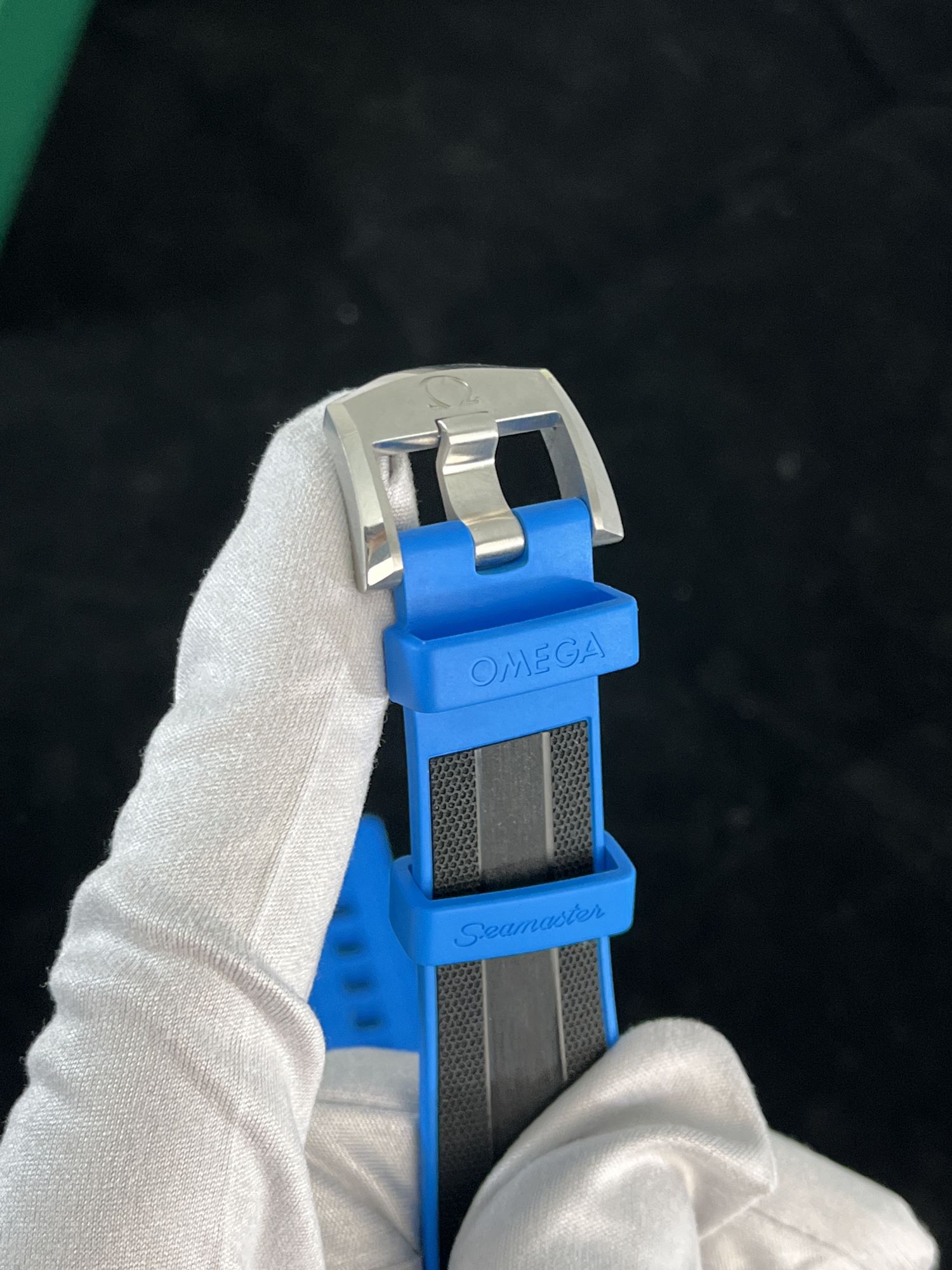 StrapBlue and black rubber strap with textile relief texture, original, pin buckle in stainless steel, brushed and polished, with omega Greek letter engraved, original