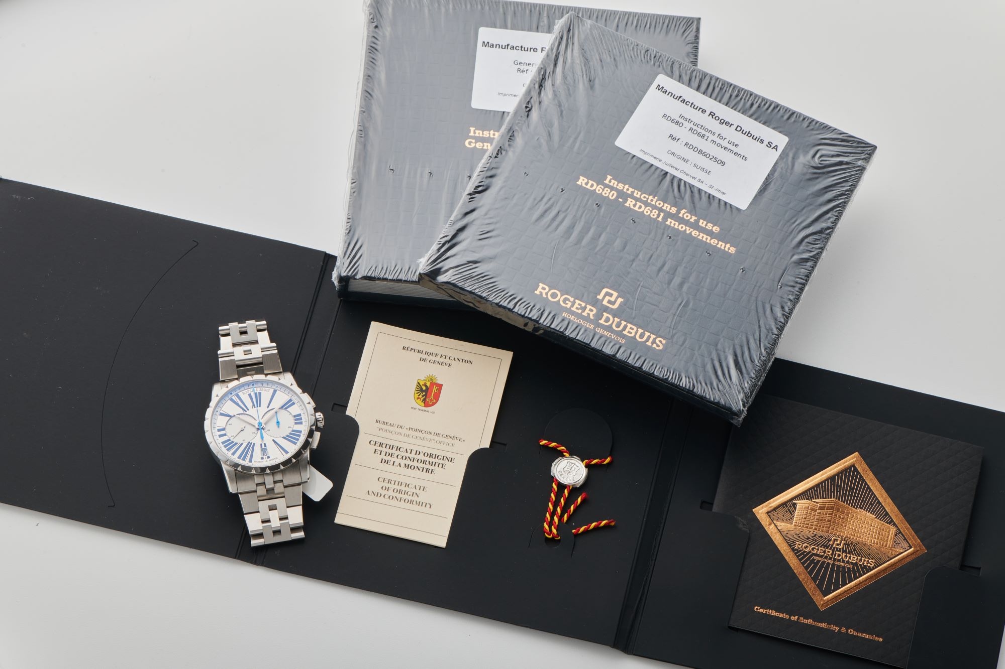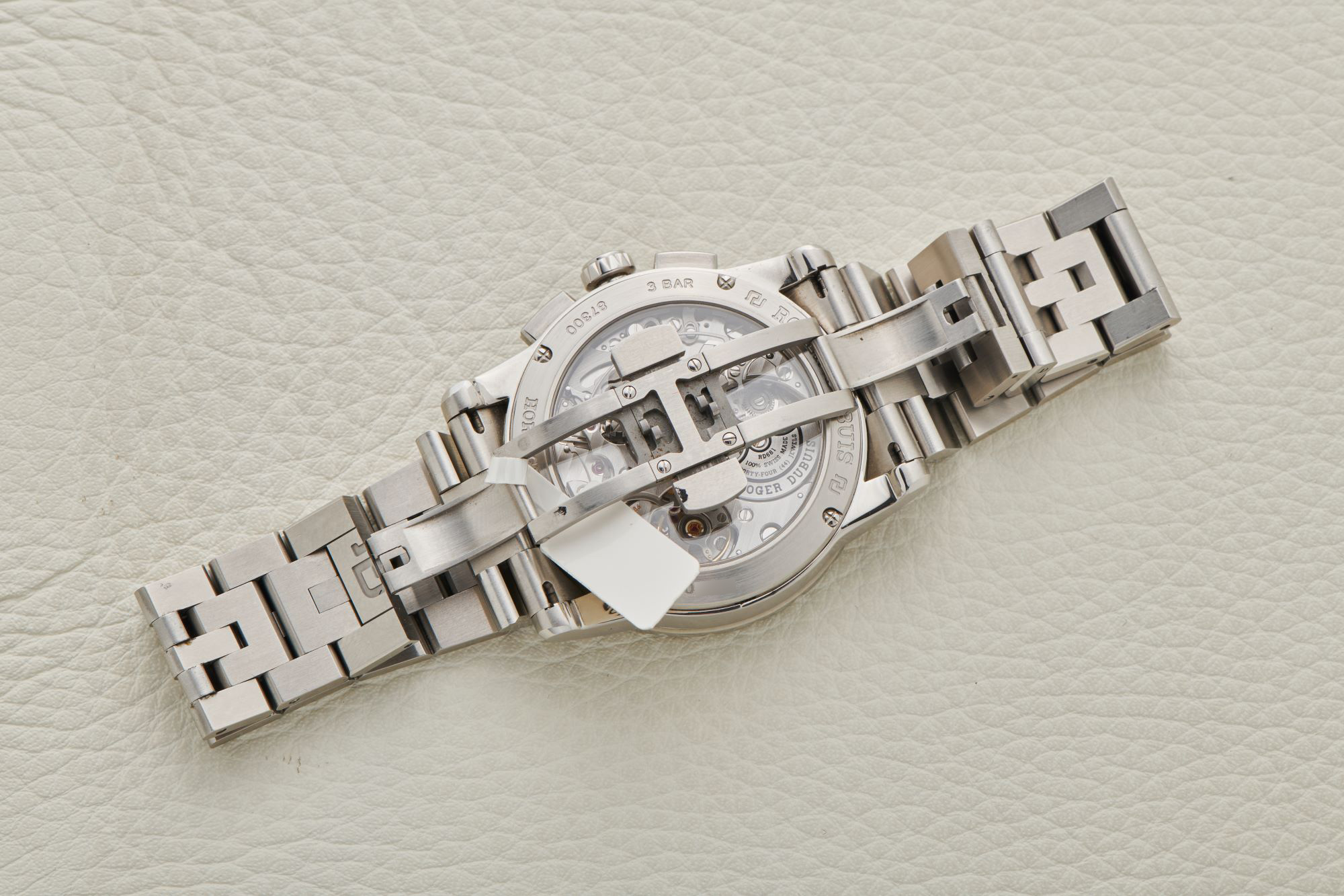 DialSilver sunburst dial with large Roman numerals, small running seconds at 9 o'clock with silver hand, 30-minute chronograph counter at 3 o'clock with blued hand, date window at 6 o'clock, signed "Roger Dubuis" at 12 o'clock. Silver hour and minute hands, blued central chronograph hand